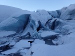 We woke to a white landscape on our final full day! Finally Iceland had made an attempt to live up to it’s name and wow, how her appearance changed. As with any snowy country, the snow was awesome. A good sign of awesome snow is that you cannot make a snowball out of it because it is so dry and powdery. Also, life continued as normal and our guide continued to drive at speed down the roads, overtaking when necessary as though it was a bright sunny summers day! Our first stop was a glacier who’s name is so complicated to spell and say that I will just refer to it as…… a glacier! I have seen many glaciers in my time and I never get bored of them. The one thing they all have in common is that they are shrinking, fast. I’m not going to get into a debate about global warming because whatever the argument of the cause, it’s happening and, happening fast! We still haven’t accepted there will be consequences further down the line. One of those consequences for me at least, is that people won’t be able to experience magnificent landscapes like these. I’ve skydived over a glacier, ice climbed on a glacier on New Years Eve, hiked on a couple of glaciers, hiked in parks full of them. A bit like when I rant about destroyed coral reefs, glaciers are another beautiful environment that we won’t get to see, much likely sooner rather than later and that makes me sad. Anyway, back to it. We tied some metal spikes to our feet and headed for a stroll up to the top of the glacier and it was jolly wonderful! Ironically the best time to visit is when it has rained as the glacier shines crystal blue which would have been the case only a few days ago but I wasn’t going to complain as the snow covered surroundings were beautiful. Apparently up to 700 people visit daily in the summer. When we were there, there were probably 50 people which was more than enough!