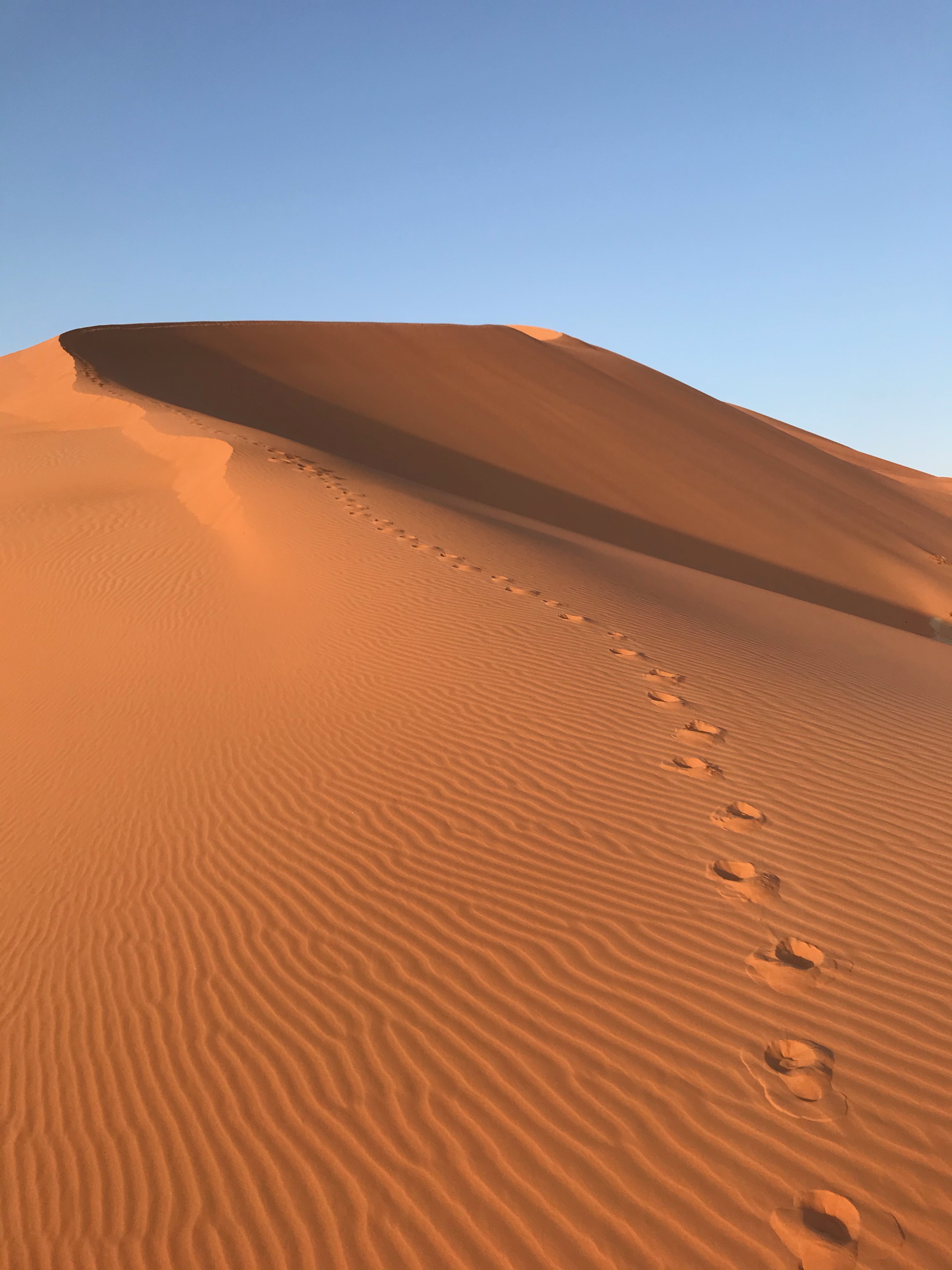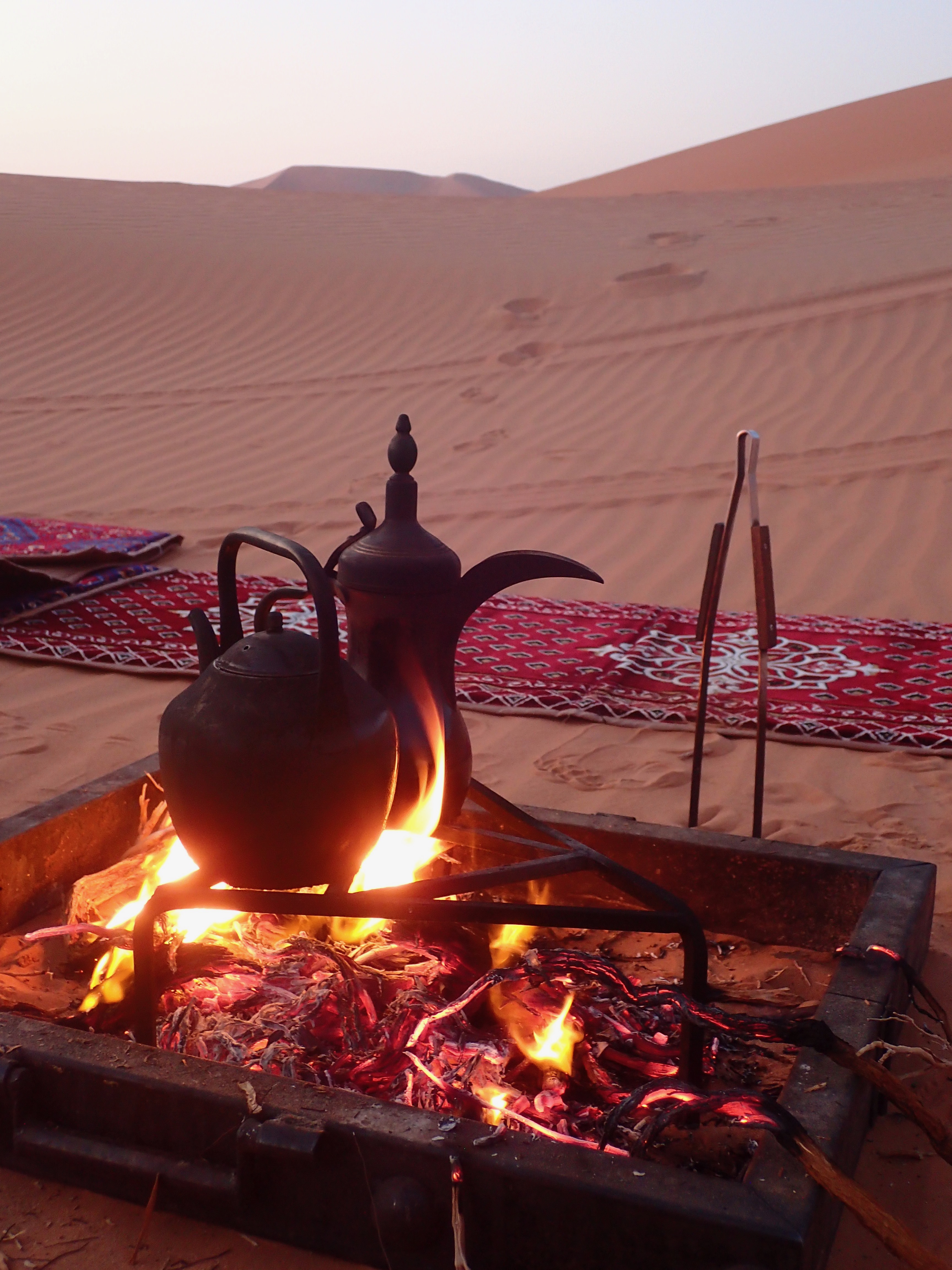 Sleeping out under the stars is a bit of a paradox in itself due to the fact that if you are asleep, you won’t see the stars so may as well be inside. To combat this issue, when going to bed at 9pm I made the point of looking up at the heavens and trying to stay awake until I had seen at least three shooting stars. I took surprisingly little time, however I must confess that the stars let me down a little out in the Empty Quarter. I was expecting the sky to be ablaze with the Milky Way as I remembered it to be in other destinations I’ve been lucky enough to visit but for some reason, on this occasion they refused to give their all. I have always faced waking up in the morning with great difficulty. I am neither a night owl nor an early bird; I simply love going to bed and loath getting out of it. This applies anywhere at any time but waking up every morning in the desert to a chill on my cheeks, a bright blue sky developing overhead and magnificent views ahead of me made the whole process much easier. I would wake to the sounds of the boys at prayer or preparing tea on the fire but that would be it, no birds, no waves, not trees rustling, just absolute silence. Our Saudi crew boiled up a selection of drinks for us every morning, all delicious. One gem was warm milk with grated ginger, an absolute game changer in the world of hot drinks and on one morning I really discovered who my mates were when a cup of the gingery liquid was brought to me as I lay dozy eyed in my cosy sleeping bag. Arabic tea was always on offer which we devoured at every opportunity. Served black and sweet it’s a drink I’ve always loved. This was followed up with ginger tea, another drink that can do no wrong. In the evenings we kicked off with some lovely Arabic coffee before getting back on the black and ginger tea. Basically, the selection of hot drinks in the middle of the desert was impressive. Breakfast was always cheese and bread for me (tea, cheese and bread, it doesn’t get much better than that!) plus olives and some nutty spread for those of us that were a bit woo woo. By 8am we would be packed up and heading back out into the dunes to where? We never knew.