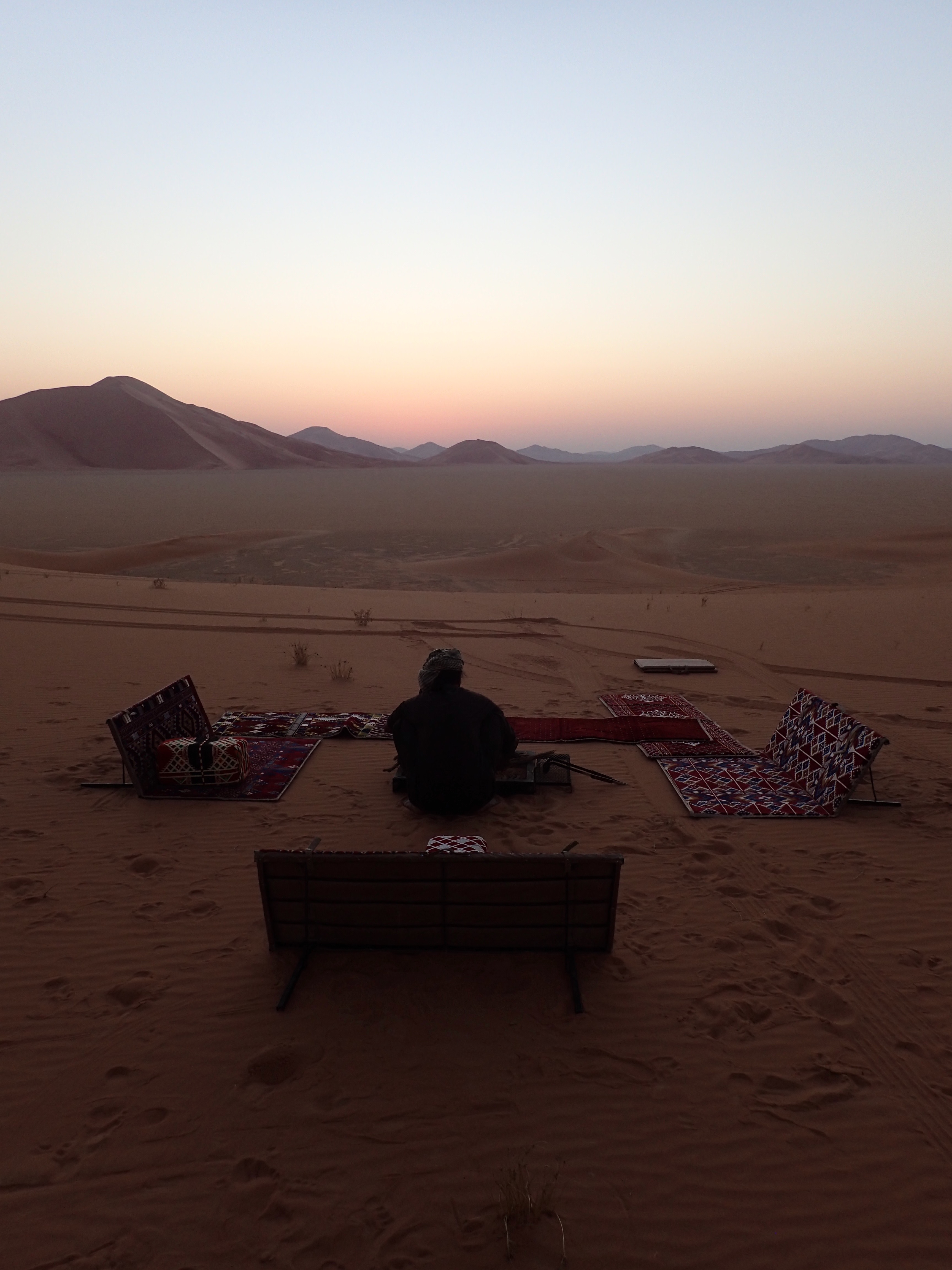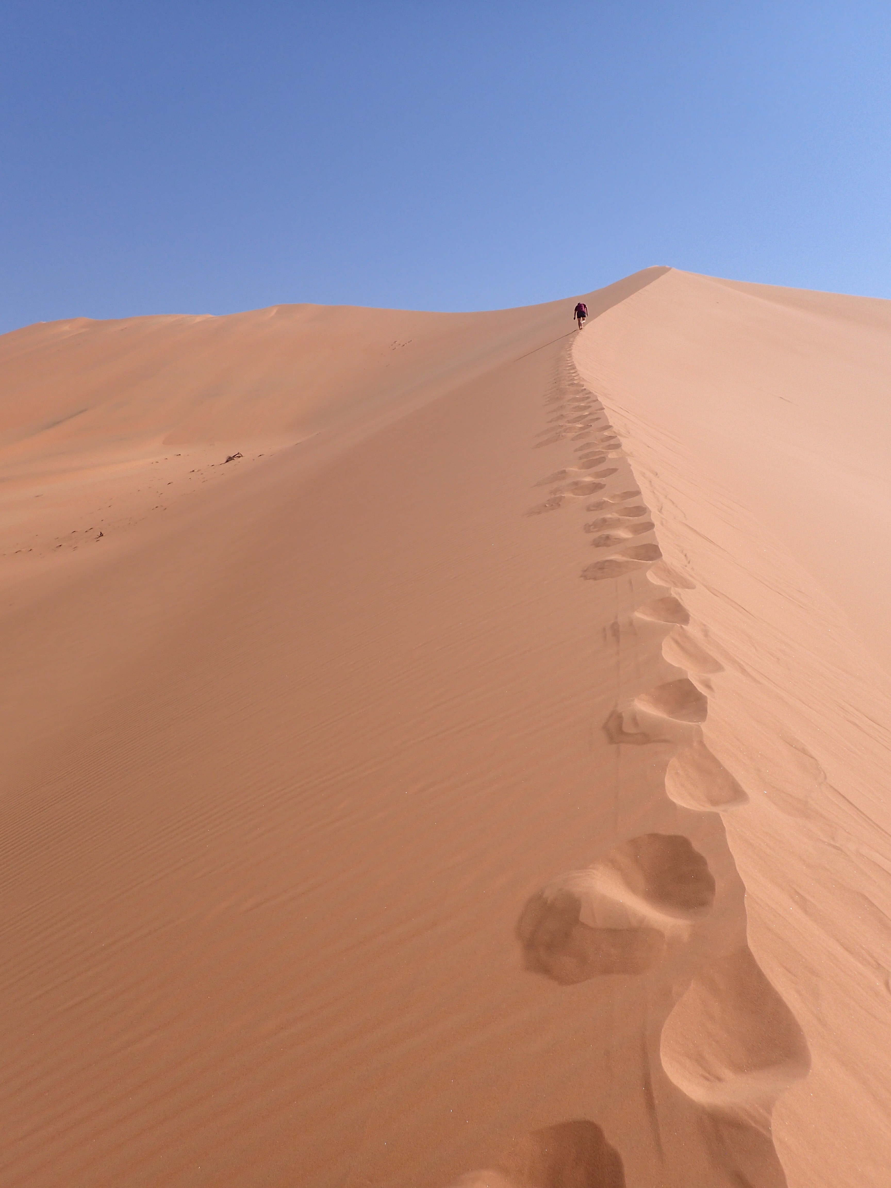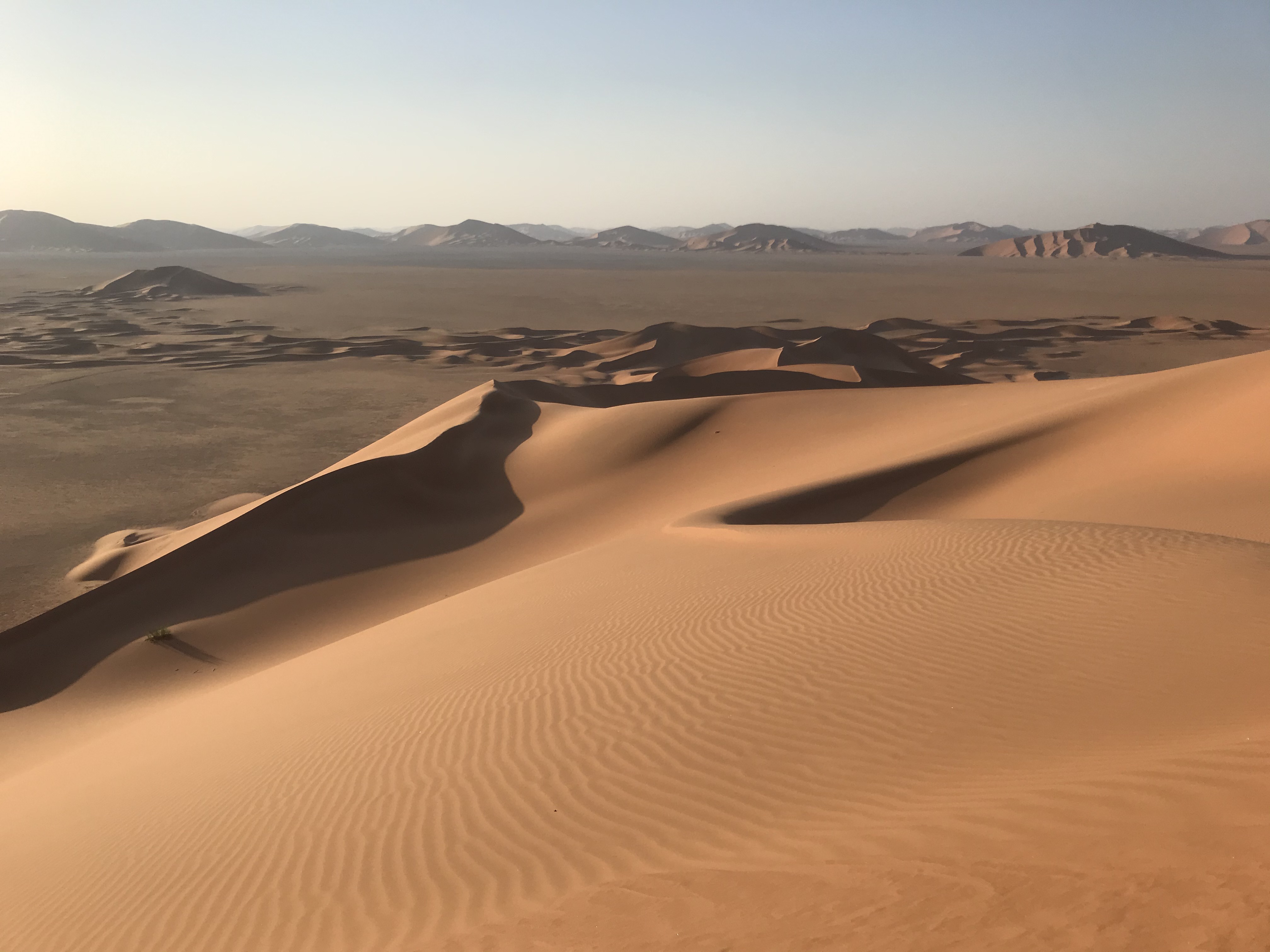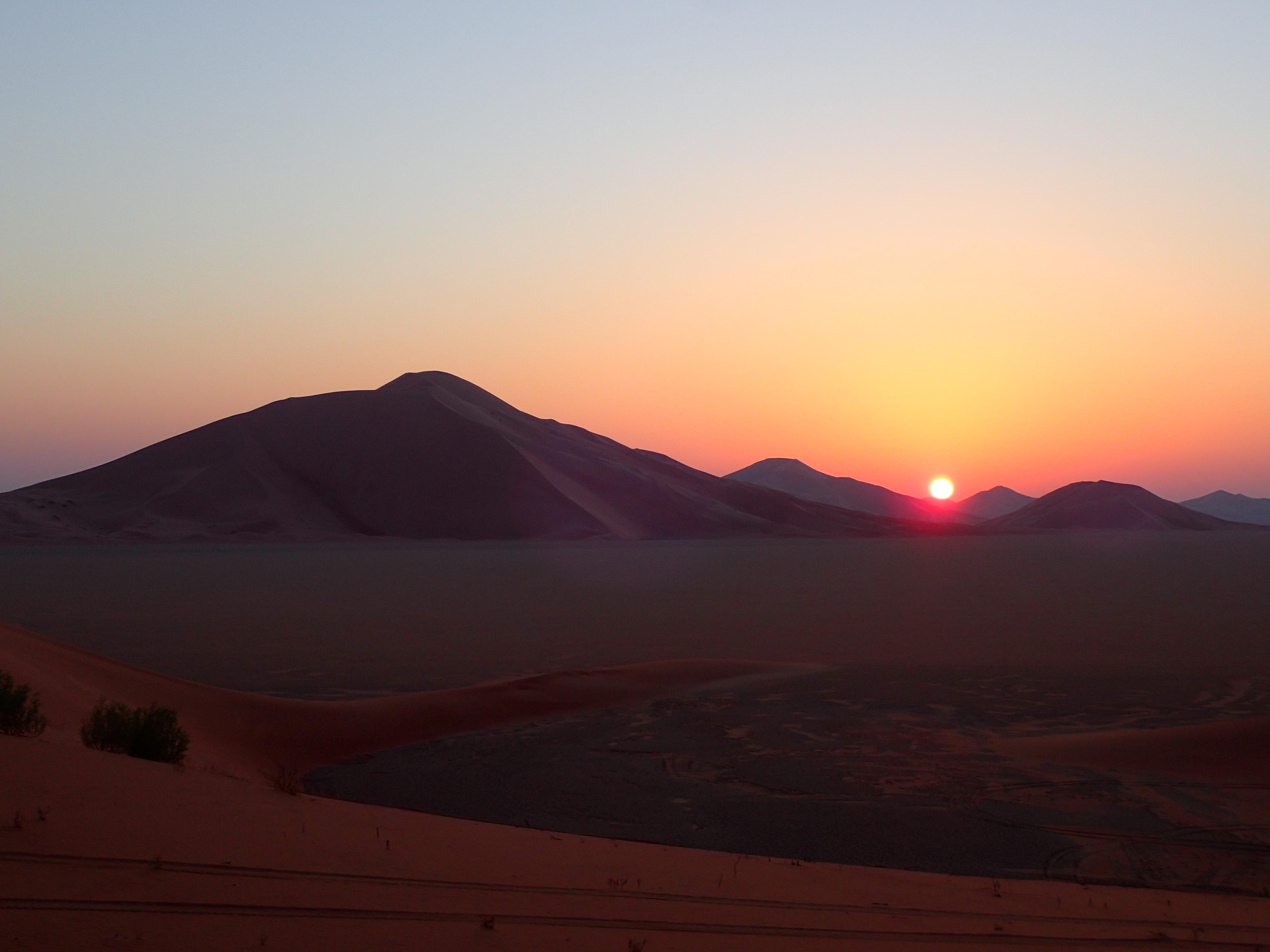 Finally we said goodbye to the road for good as we headed deeper into the desert thanks to the supply car being a little lighter and boy did we have fun. The desert changed every day, starting with what can be likened to rolling countryside, it then changed to mountain peaks before turning to endless plains on the final day of the tour. The one constant was sand. Day 4 we found ourselves very much among the impossibly high peaks of the sand dunes and would prove to be an absolute highlight of the trip. The dunes were arranged in lines running roughly from east to west and we were travelling in a southerly direction which meant we had to cross these sandy beasts. That was a challenge that our cars and drivers did with ease and far more ease than me as I sat in the back getting tossed around until I turned green. Speed is everything, as well as having your wits, and so we would regularly fly up a sand dune, skirt along it’s crest to check out the route, turn back down the dune and head straight back up and over the crest or, find another route. Sometimes we would shoot up a dune before the driver changed his mind and slammed it into reverse, flying down the dune and halfway up another backwards. None of this made me feel too good even if the experience on the whole was absolutely epic and everything I could have hoped for. Once we had scaled a set of dunes we would speed along large, flat, open salt pans for a few miles before hitting the next row of dunes and begin to descend them. This, we spent the whole day doing and no matter how I felt, it never got boring and the dunes never failed to take your breath away one way or another!
