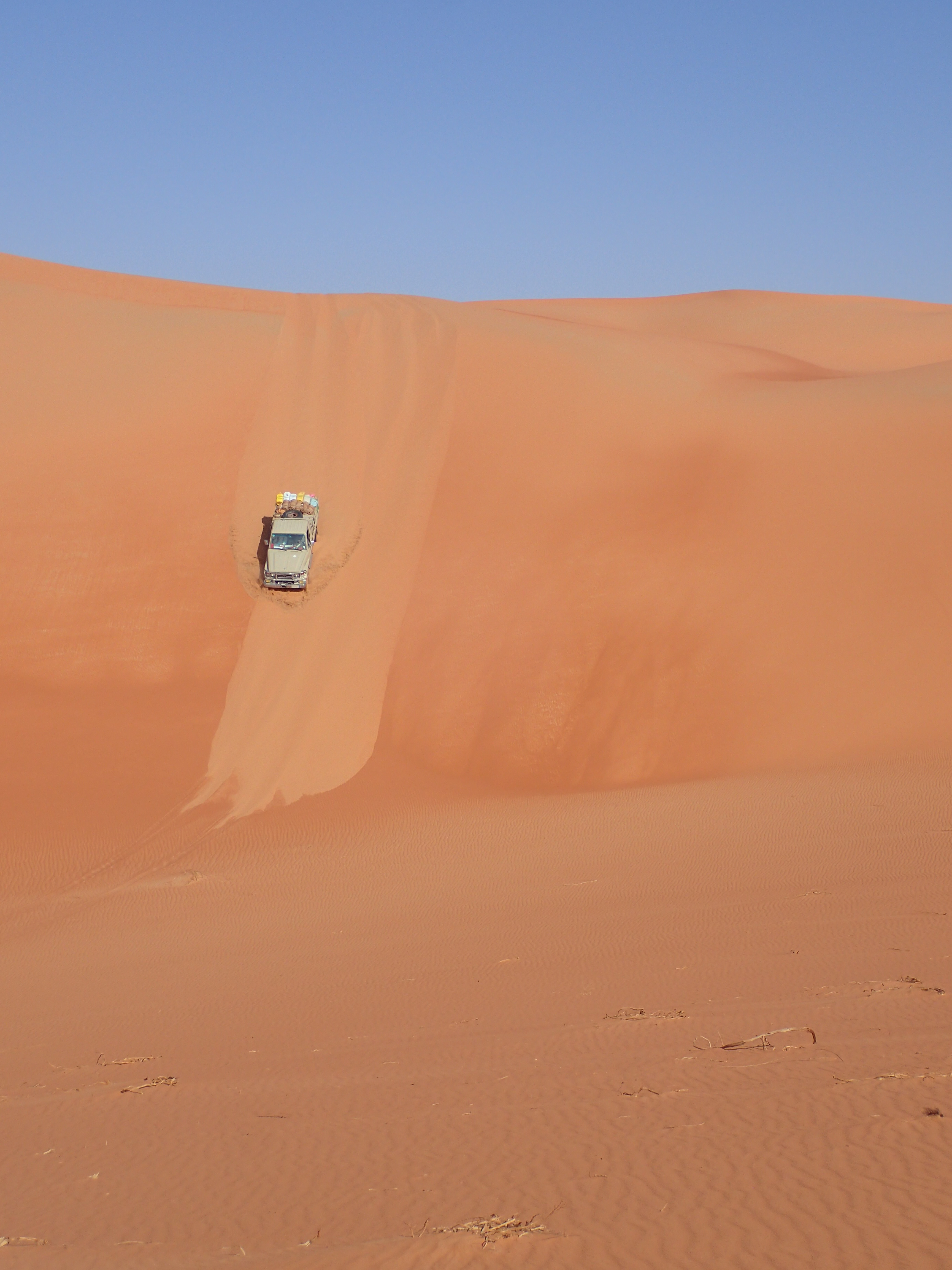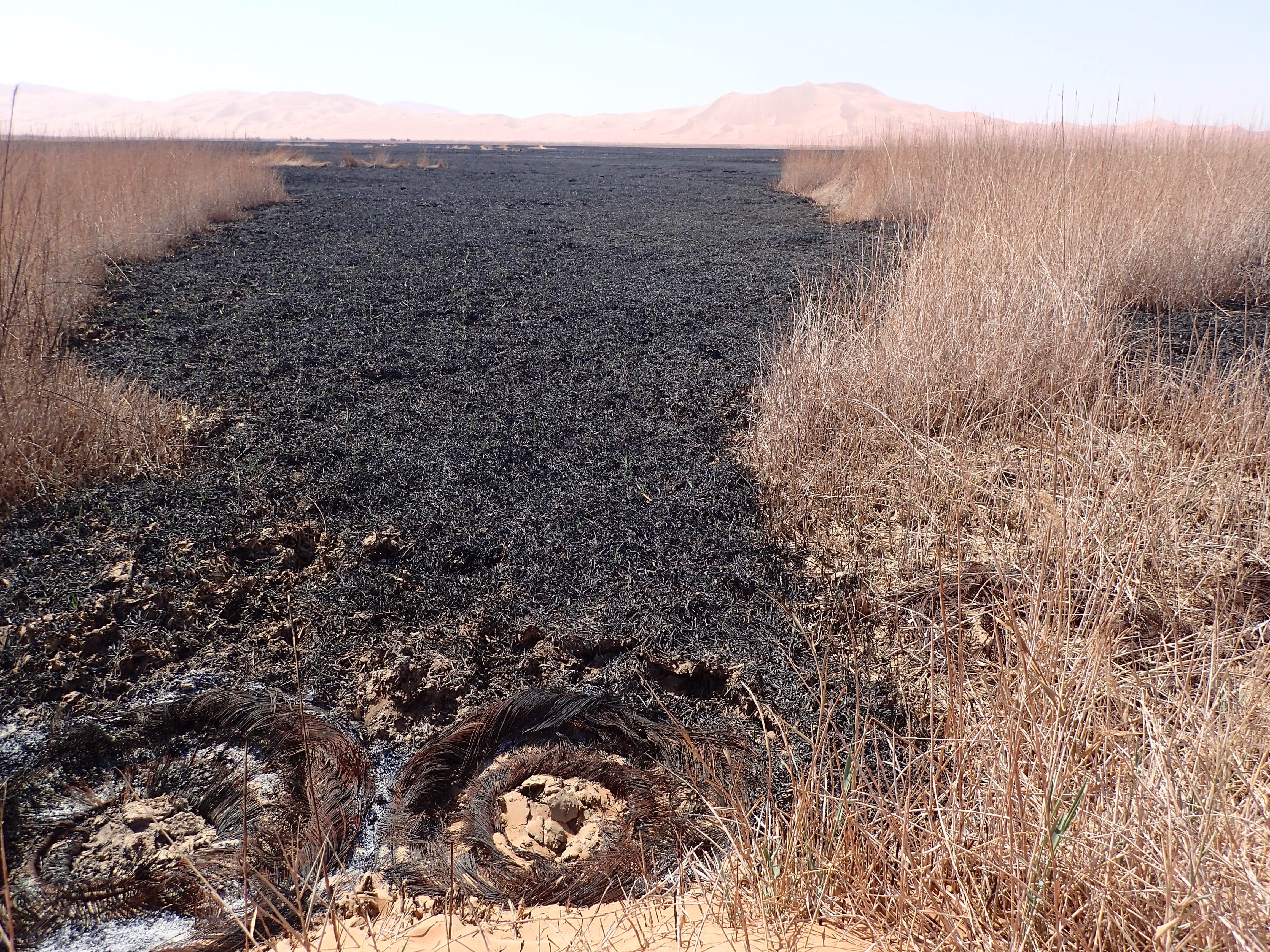 We were still following the dusty road through the desert, heading south towards the border with Oman. A visit to a few oases had been mentioned and I was full of excitement to see a lush patch of green rising out of the desert; how disappointed I was to become. Still on the road we rounded some sand dunes and came across a scene of devastation. A large area of old, dry, rushes was slowly burning away in the distance leaving large areas of black carpet. On closer inspection it was clear to see that some tyres had been set alight to get the fire going. I don’t even know if it’s possible but apparently the spring to the oasis had been blocked off by the oil companies in order to save water. Blocked off or pumped dry it was clear that human intervention for whatever reason had completely destroyed a little corner of paradise in an otherwise gigantic and hostile environment. I was pissed off. One of the main reasons for going on this trip was to get away from humans and their insistence on screwing up everything, yet it would appear that nowhere is safe. I will state – in the pursuit of balance – that there were hints of plants growing and there could have been a tiny possibility that the fire was clearing the dead vegetation to allow new growth but…… I think this is an overly optimistic assessment and does nothing to make up for the fact that there was water and now there is none that is visible at least. My desire to get away from the road increased.