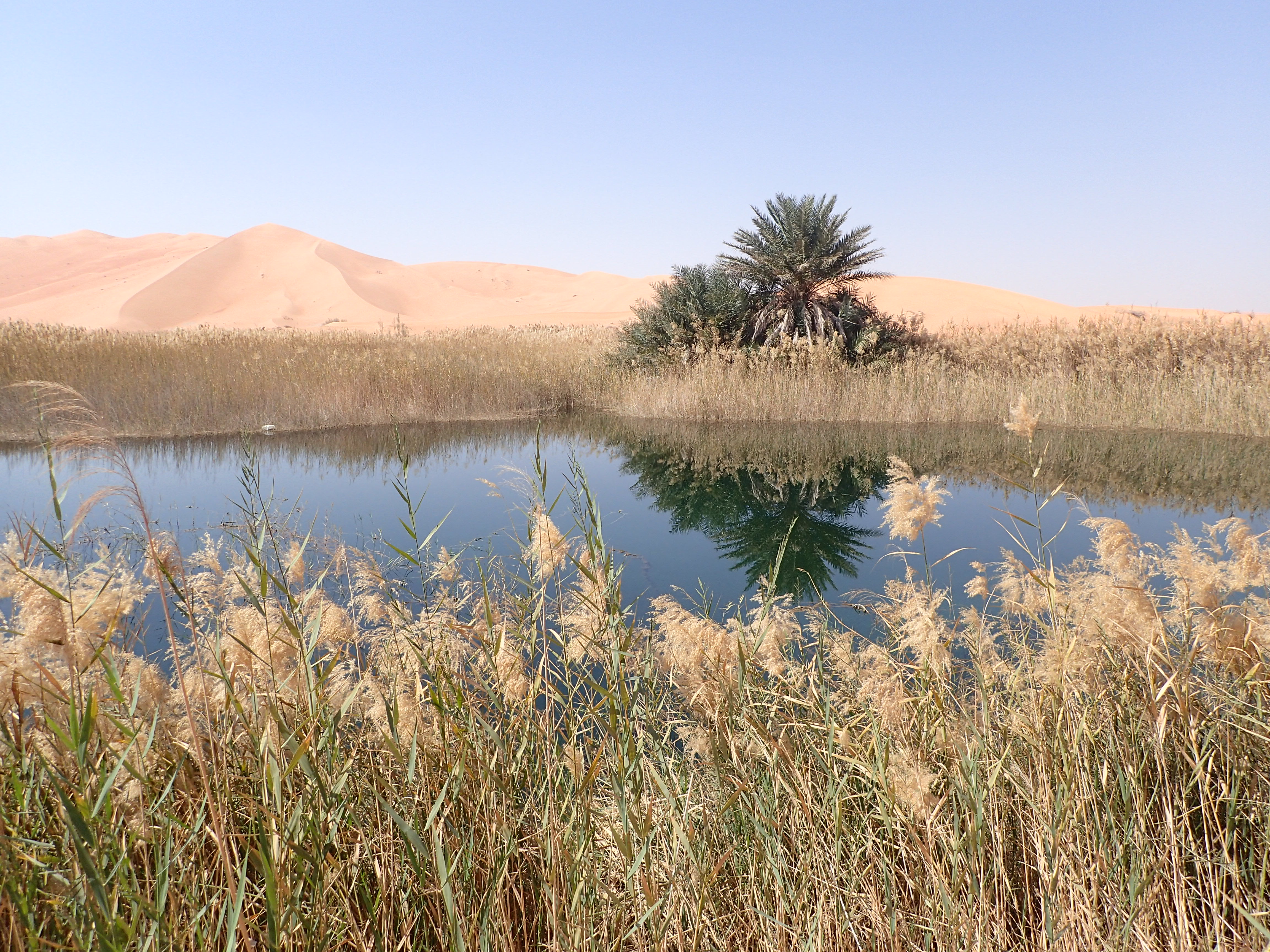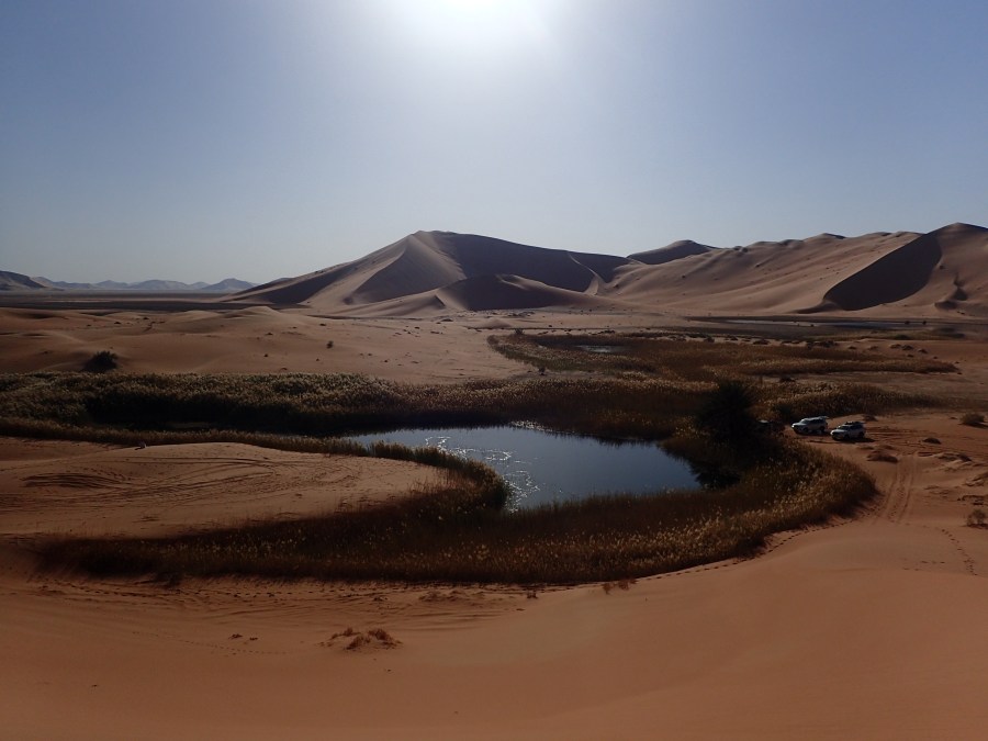 A couple of hours later our disappointment was given a chance to ebb as an actual, fully working oasis appeared on the horizon. It too had been messed with but apparently the perpetrators were unable to prevent the water from supplying the oasis. What’s more, the water that rose to the surface at the source of the spring was bloody hot, accompanied by the delightful smell of sulphur; it wasn’t quite the perfect combo for a roasting hot day in the desert. Nonetheless, the water filtered through the rushes to a deep pool of crystal clear and cool water that we were only too happy to throw ourselves into. Living in the desert is a strange thing as nothing really gets dirty. Sandy yes, but not dirty. As a result, after a couple of days of not getting wet I still felt surprisingly clean, not that that did anything to prevent me from stripping to my pants and jumping into the cool, refreshing water. Although it was winter, the 30oC sun made light work of drying us out and soon after we were back in the cars to make a short trip around the back of the oasis that opened up to reveal a large shallow lake which I assume is still classed as part of the original oasis yet, it was different. Although there was plenty of water, there was relatively little life around the lake. However, the views as we bombed up and around the surrounding dunes were spectacular with the lake acting as nature’s mirror reflecting the surrounding scenes perfectly. We took the opportunity to park up under some shade, put the kettle on, have a light lunch and a heavy nap.