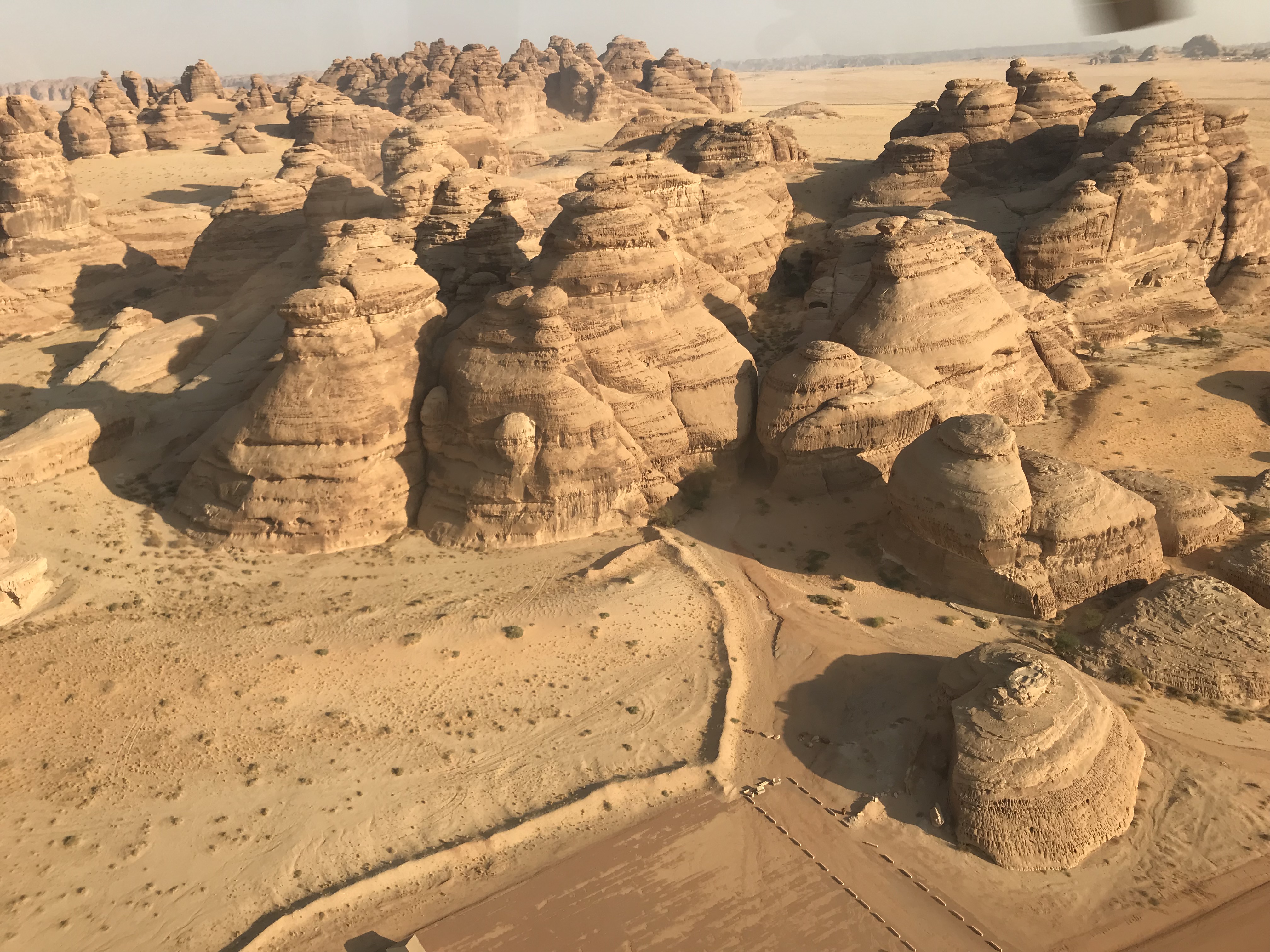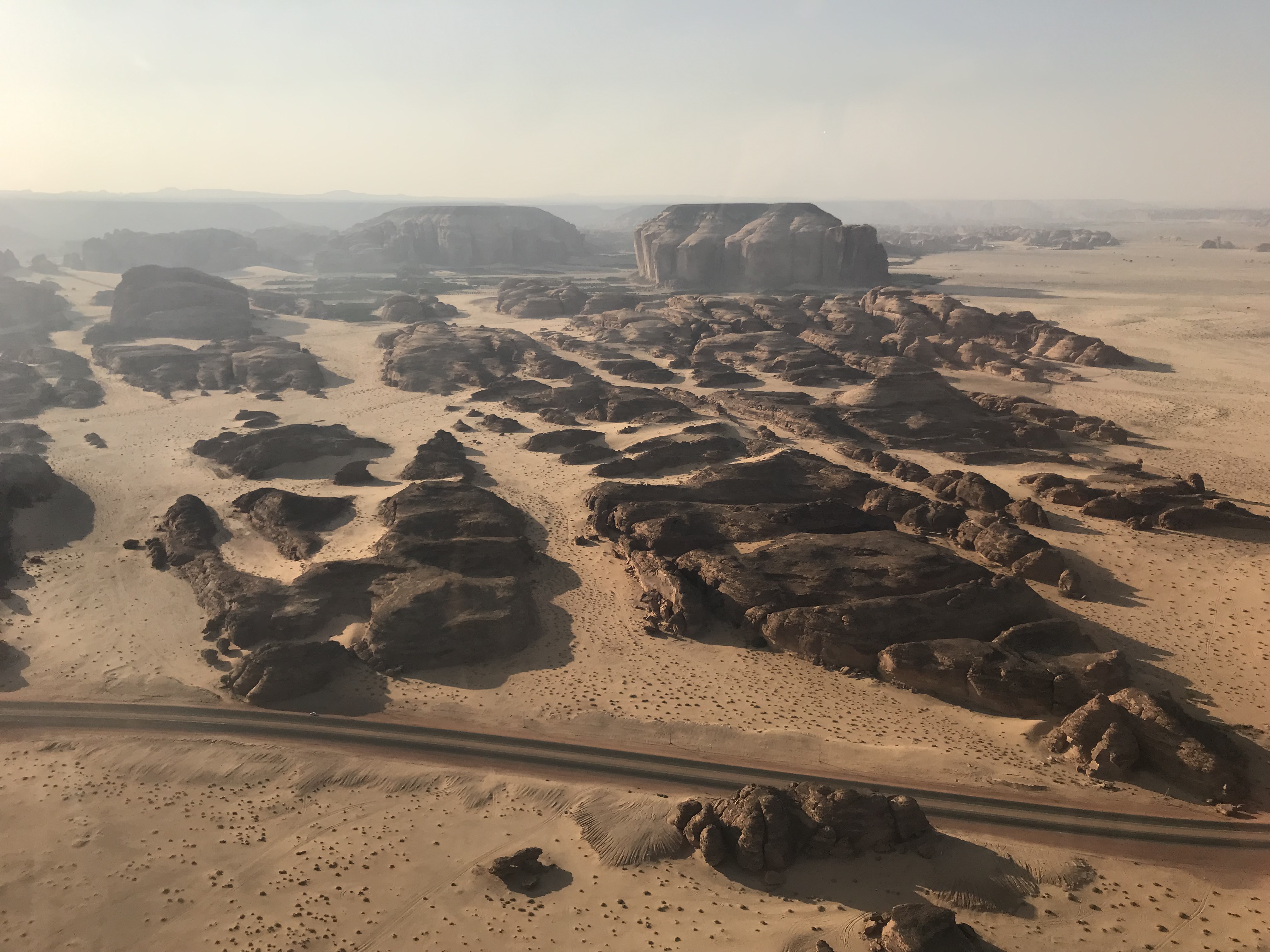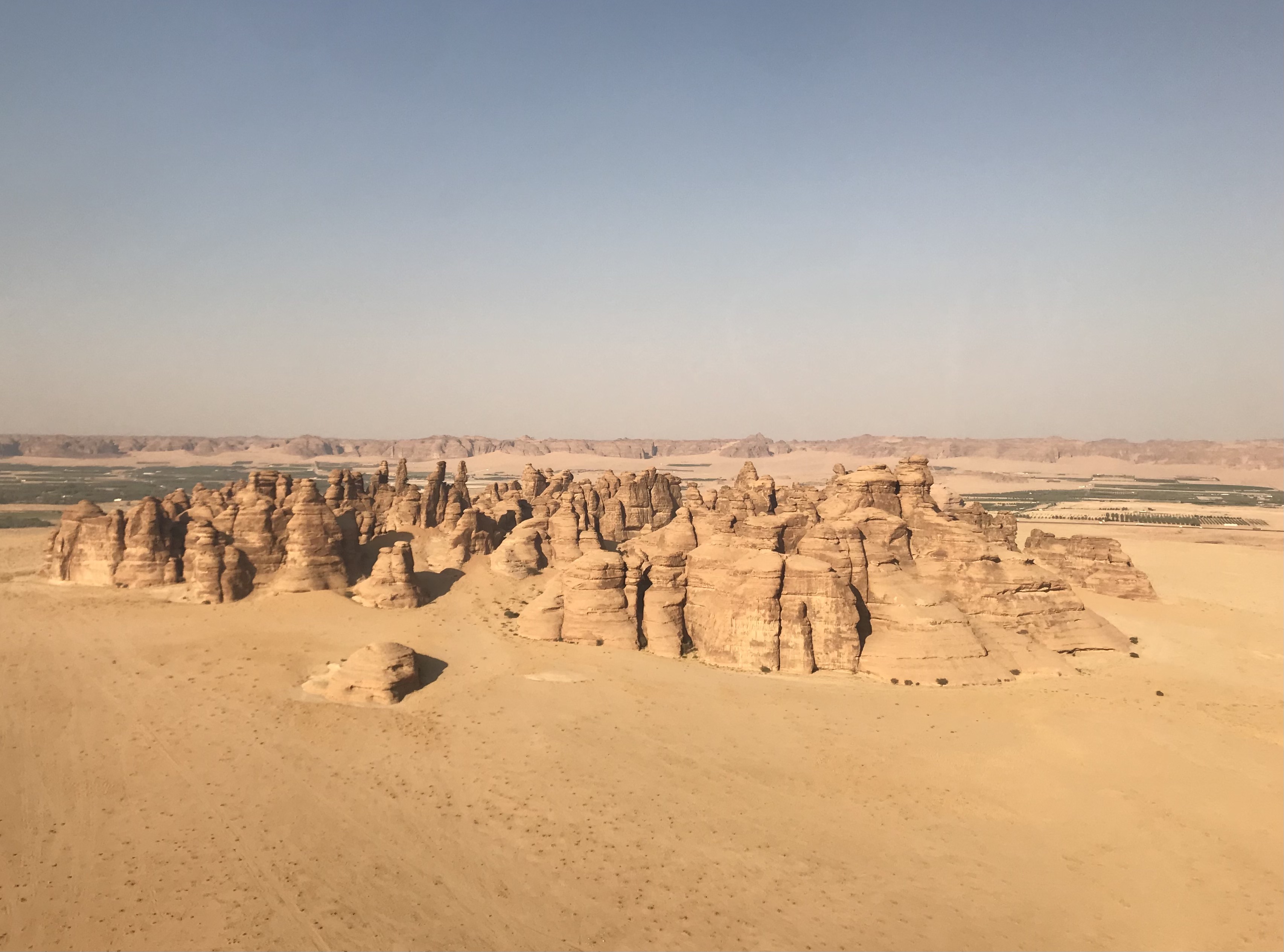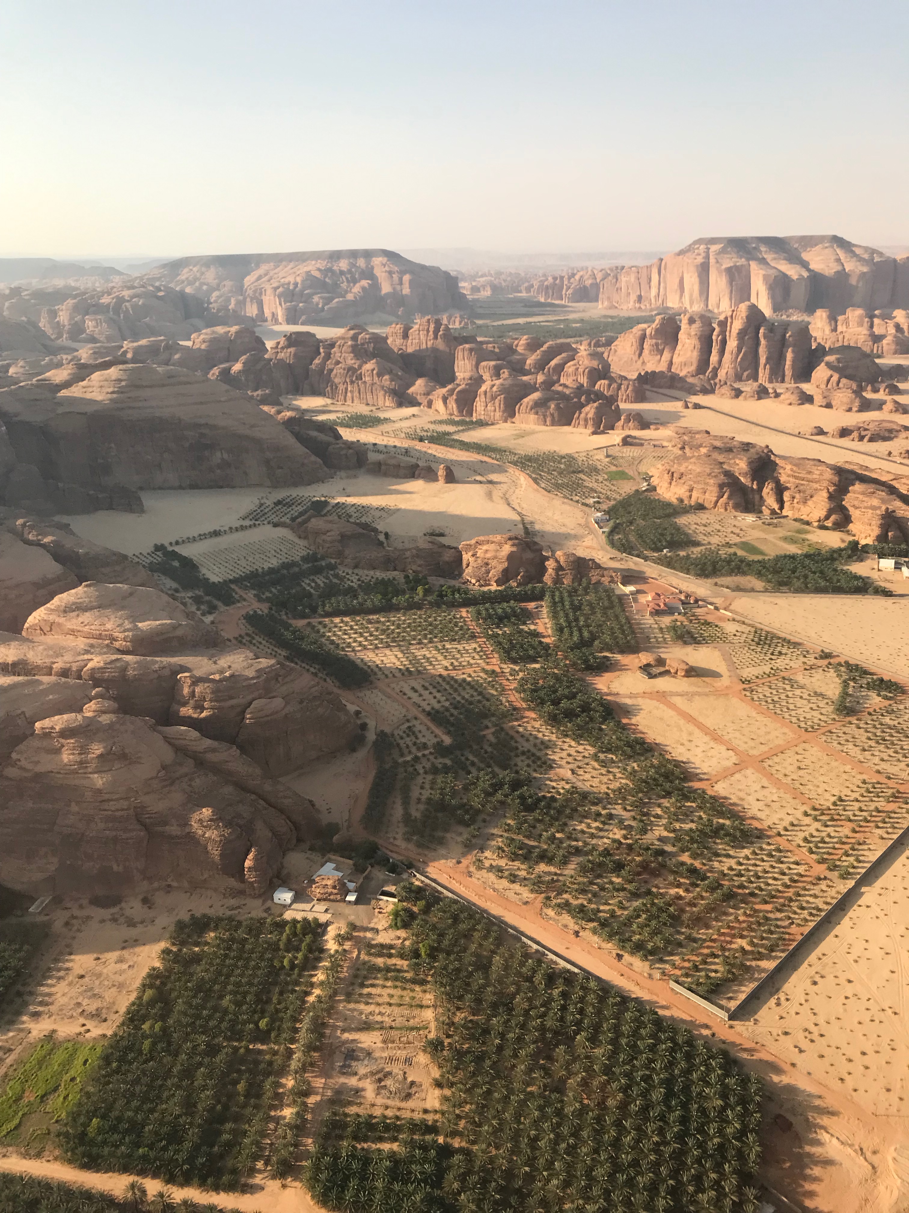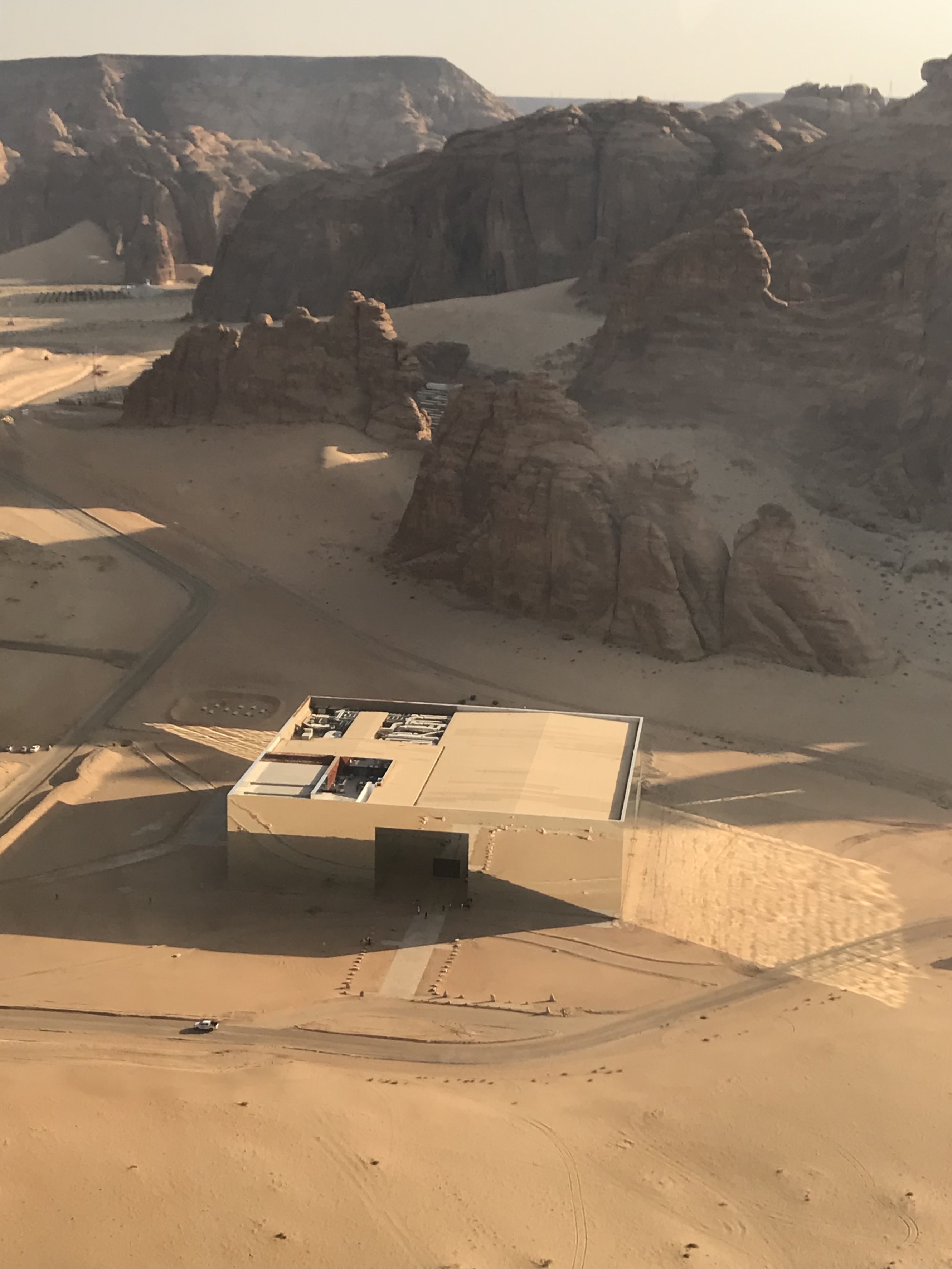 As always, who we know in life makes a big difference and by some miracle my work mate had landed himself a girlfriend within Saudi Arabia. Even more remarkably he has held it together long enough for me to benefit from their relationship, for his very good lady happens to be doing all of the marketing for Al Ula tourism and not only is it thanks to the both of them that I was there for the weekend, but it is also the reason I found myself a few thousand feet in the air aboard a helicopter. I’ve been on a helicopter several times before but only for ten minutes which is never long enough to fully enjoy the wonderful experience it tends to be. On this occasion I was blessed with a luxurious 30 minutes, made all the better thanks to the last minute pee I had before boarding the chopper. I was desperate but there were no facilities. After convincing myself I could cope, I took my opportunity to run into the desert and ease the pressure behind an old concrete pillar, all thanks to a rather large man who was struggling to climb into the helicopter. Relieved, strapped in, headsets on, our excellent pilot took off and flew us around the local area, taking us over Elephant Rock, Hegra, Old Town and several ancient forts sat high up on rocky outcrops looking over the valley full of palm trees. The pilot even had the courtesy to fly by each site of interest twice so that people on either side could get a good look and some photos. One monument we saw from the air which we didn’t have time to see on the ground was a big shiny box. Maraya translates into ‘mirror’ and in this case, many thousands of mirrors for Maraya is the largest mirrored building in the world and is home to a brand new conference and entertainment venue in Al Ula. Sat in the middle of the desert and surrounded by rocky outcrops, the building reflects absolutely everything around it and gives the building an almost invisible appearance. From the ground I’ve only seen photos but some are incredible with the mirror effect creating simple but beautiful shots.