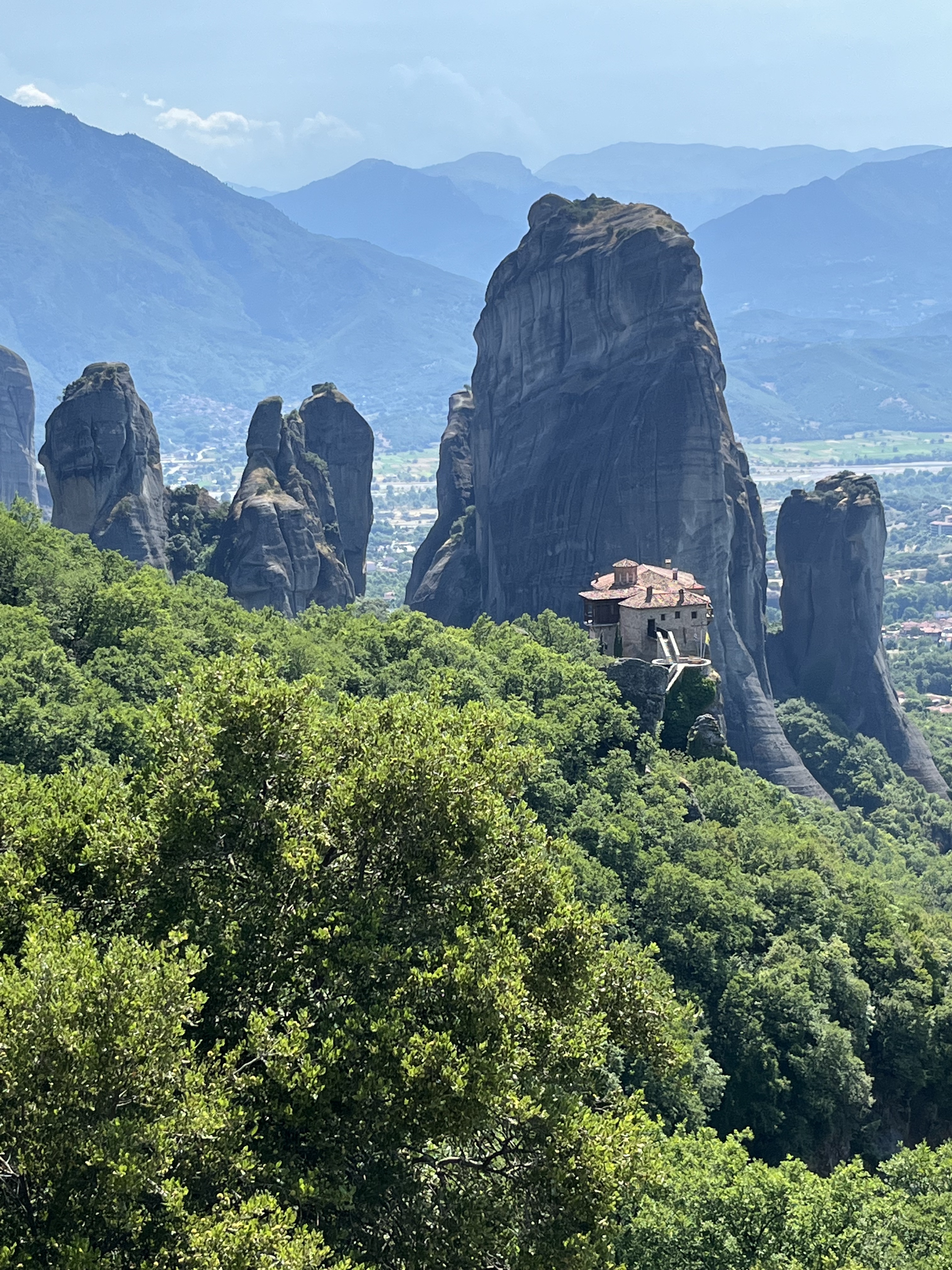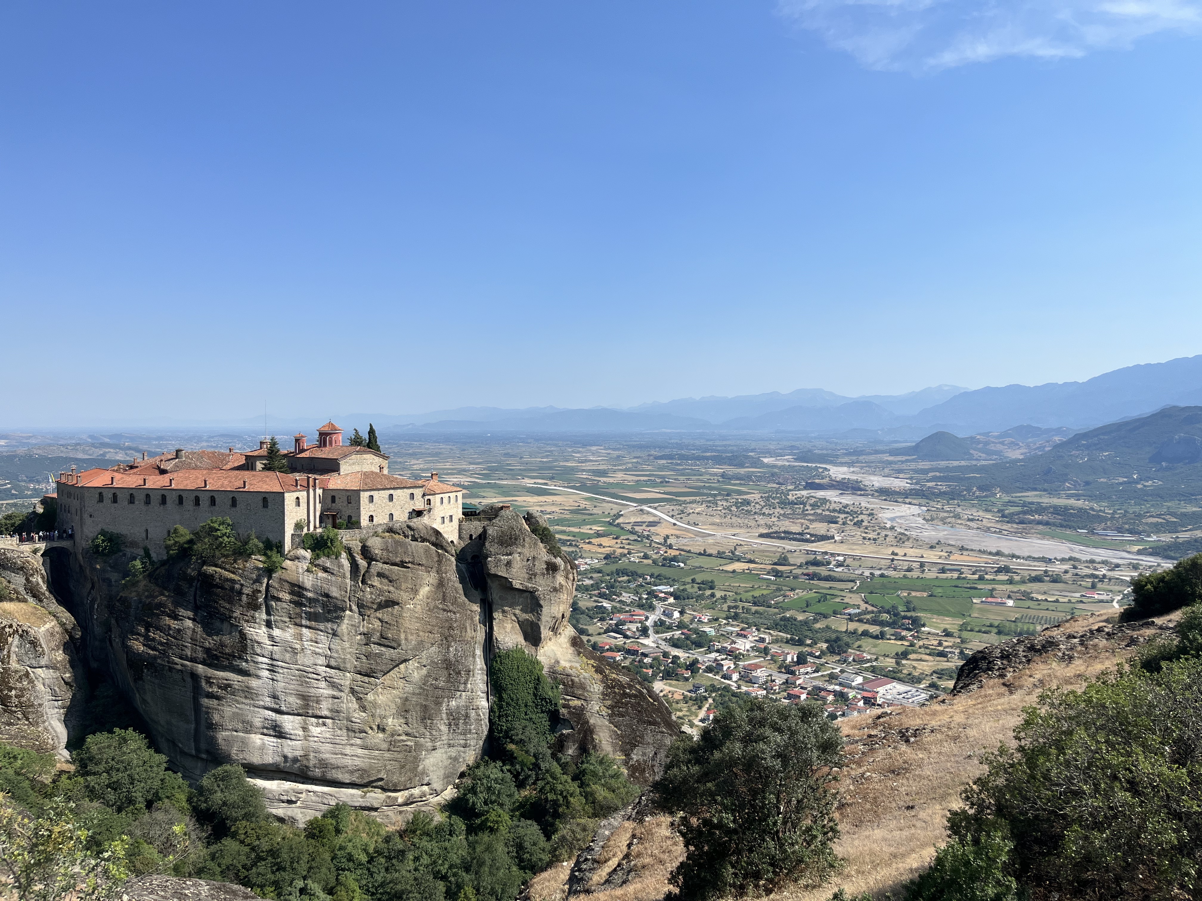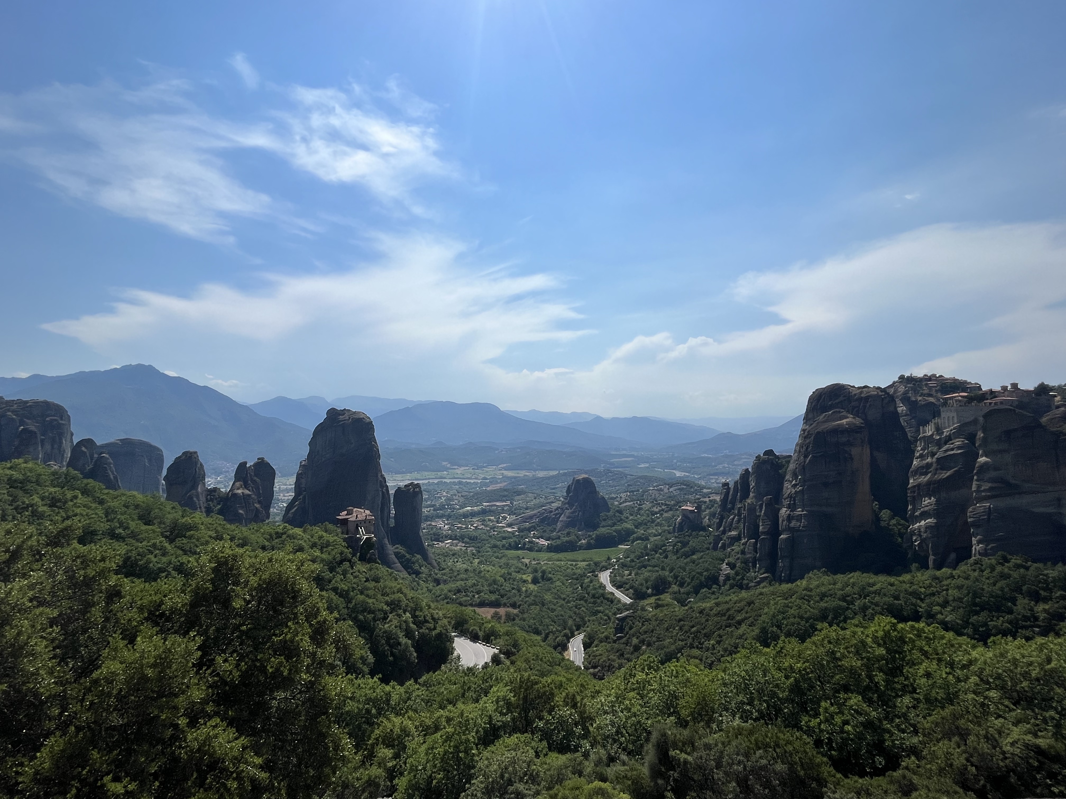 One of the great advantages to not researching a tour beforehand is that they often deliver me to places I had no idea about and as a result impress me greatly, Meteroa is one of those places. Catching the train out of Athens and back into the incredible Greek countryside had already lifted my spirits and as we arrived at Kalabaka, we caught a glimpse of things to come. Rising up behind the town are huge, smooth rock formations that are impressive in their own right but as always with mankind it was decided they needed the human touch. A bus ride took us up into the rock formation and revealed the monasteries that sit perched high up on individual outcrops, built around 800 years ago. They are an impressive sight and were built to protect the monks from persecution. At the time, the only way up was using a rope ladder or rudimentary pullies and nets. Now of course, tourists flock to the monasteries that are almost empty of monks and nuns and although the location is insane, the buildings themselves become boring very fast, especially when the girlfriend is complaining about the wealth of the church during the Dark Ages as they simultaneously condemned every single act of a common citizen. Of course, she had a point. The monasteries and the churches within were splendid, but after tiptoeing between tourists and seeing the same thing for a third time we were happy to escape for a cold beer. As the sun began to set, we headed off to a viewpoint with 1 million other people and being my birthday, I was basically told I had to enjoy it, regardless of the prick with the drone flying overhead. Nevertheless, I can confirm that it was a stunning spectacle worthy of the fuss and provided a delightful end to a unique day.