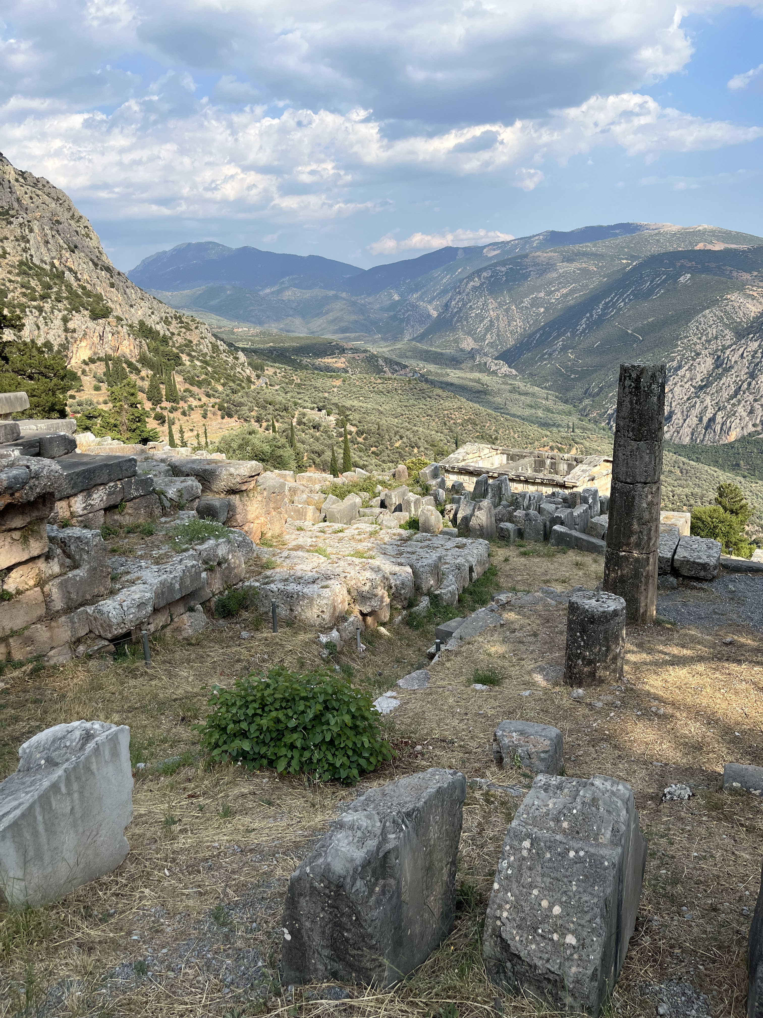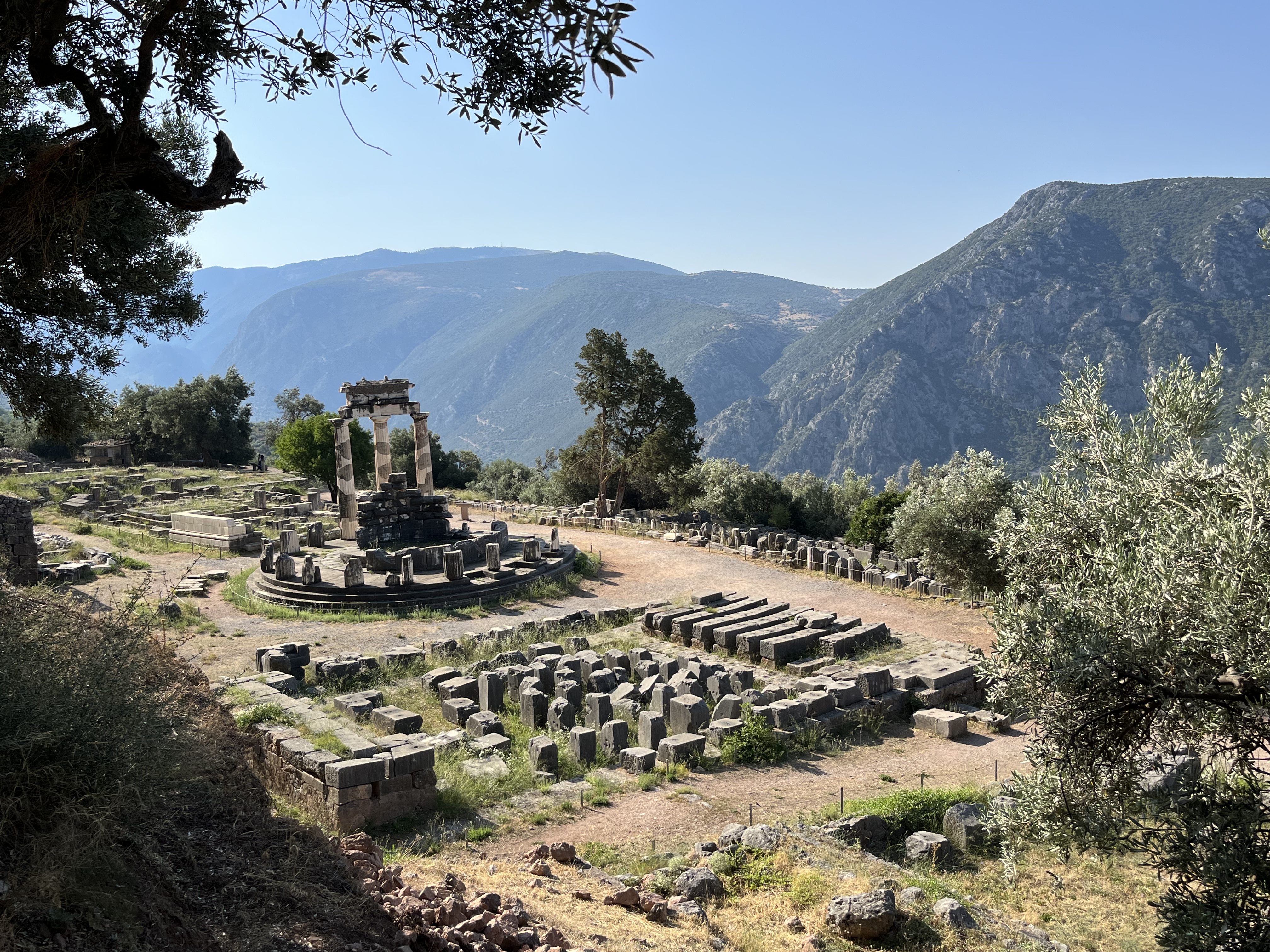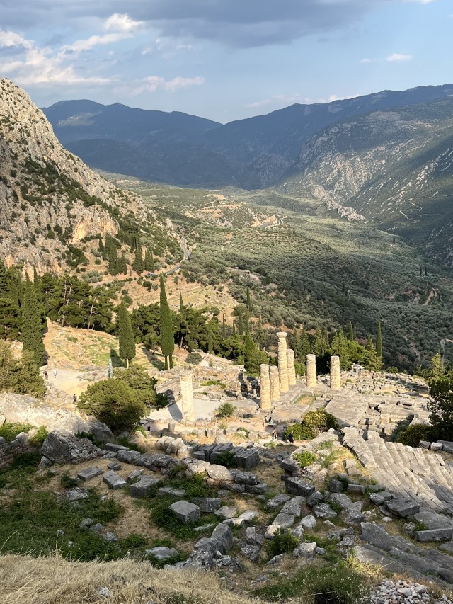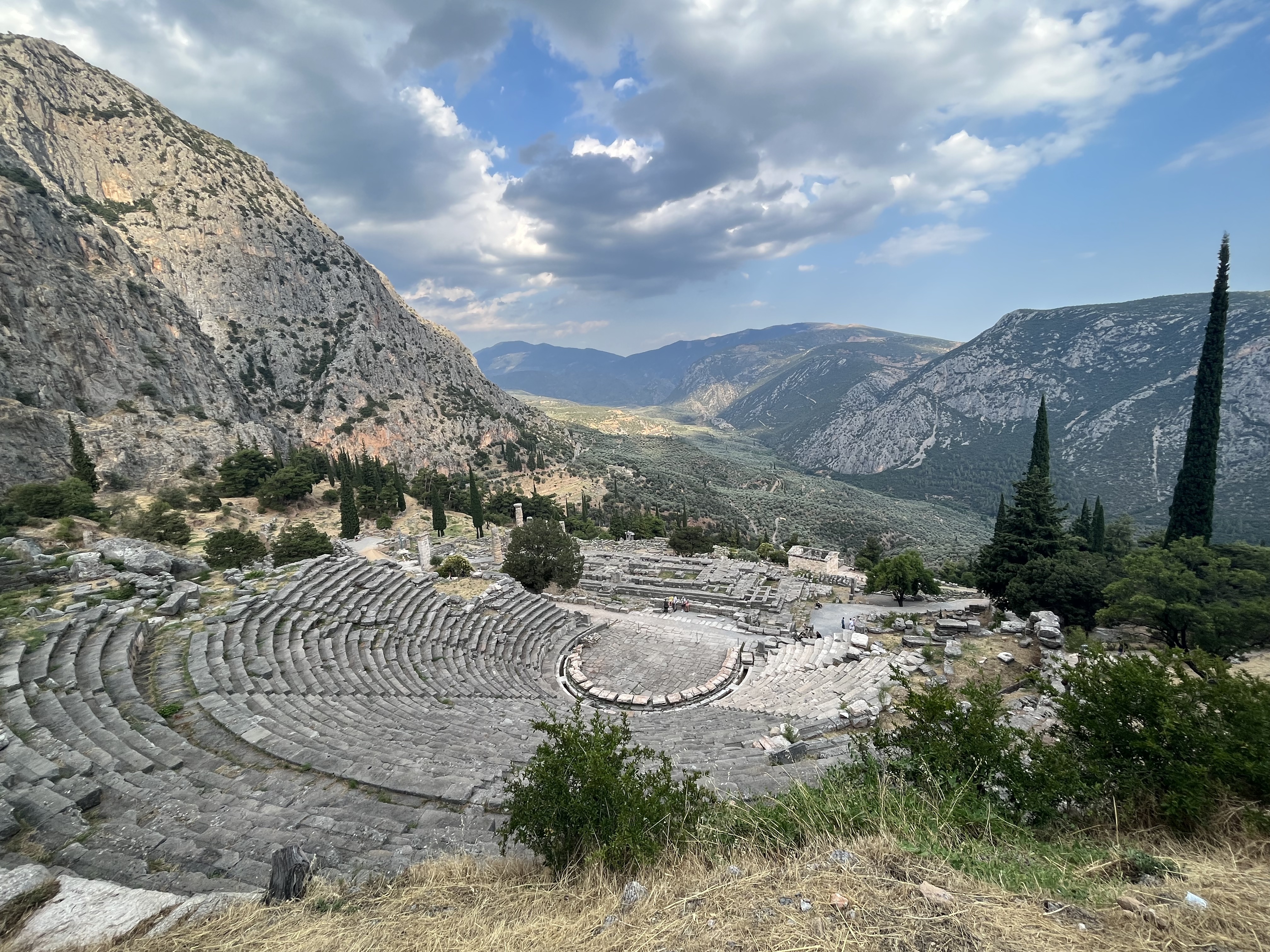 Delphi was our next stop and was as equally impressive as Meteora as we wound back 2,500 years once again. The Temple of Apollo sits here although the site has been dated back to 4,500 years. Historical timescales in Greece are simply mindboggling and I have routinely found myself in museums looking aghast at something that is six or even 7,000 years old. Sometimes the ‘something’ looks like a stone and I’m sceptical that it’s anything more than just that however, many times I’m looking at something extremely human and delicate such as a clay figurine, pot, knife, sewing kit, etc. I now find myself walking around a museum which starts with the old stuff and gradually move towards 1 AD by which time I lose interest because I basically deem it as futuristic rubbish. Obviously it’s not, but a 4,000-year-old sword is far more interesting than a 2,000-year-old sword. There is so much stuff, especially pieces of pot and statues, that it can become very boring and unfortunately for the Greeks they haven’t learnt to tell a good story and make history fun, which is odd considering Greek mythology and all. All the museums I have visited are very much matter of fact, fun stories to accompany the facts are forbidden it would seem which is a shame because adding a few interesting stories would give everything a bit of context. The archaeological sites themselves are of course fascinating but largely a heap of rubble which is understandable considering their age and the fact that Greece isn’t exactly earthquake free, but my imagination is poor, and I struggle to reconstruct what may have been. The site of Delphi was incredible though thanks to its remote location and views, the amphitheatre, few tourists, and an excellent guide who communicated its history with great enthusiasm and simplicity for idiots like myself. If I had to choose Delphi or Athens, Delphi would be it. The splendid little town boasting many restaurants with incredible views of the valley used to sit right on top of the archaeological site before it was discovered. Years were then spent convincing the town to move down the road so the site could be excavated, a process the residents were reluctant to do until an earthquake convinced them otherwise.