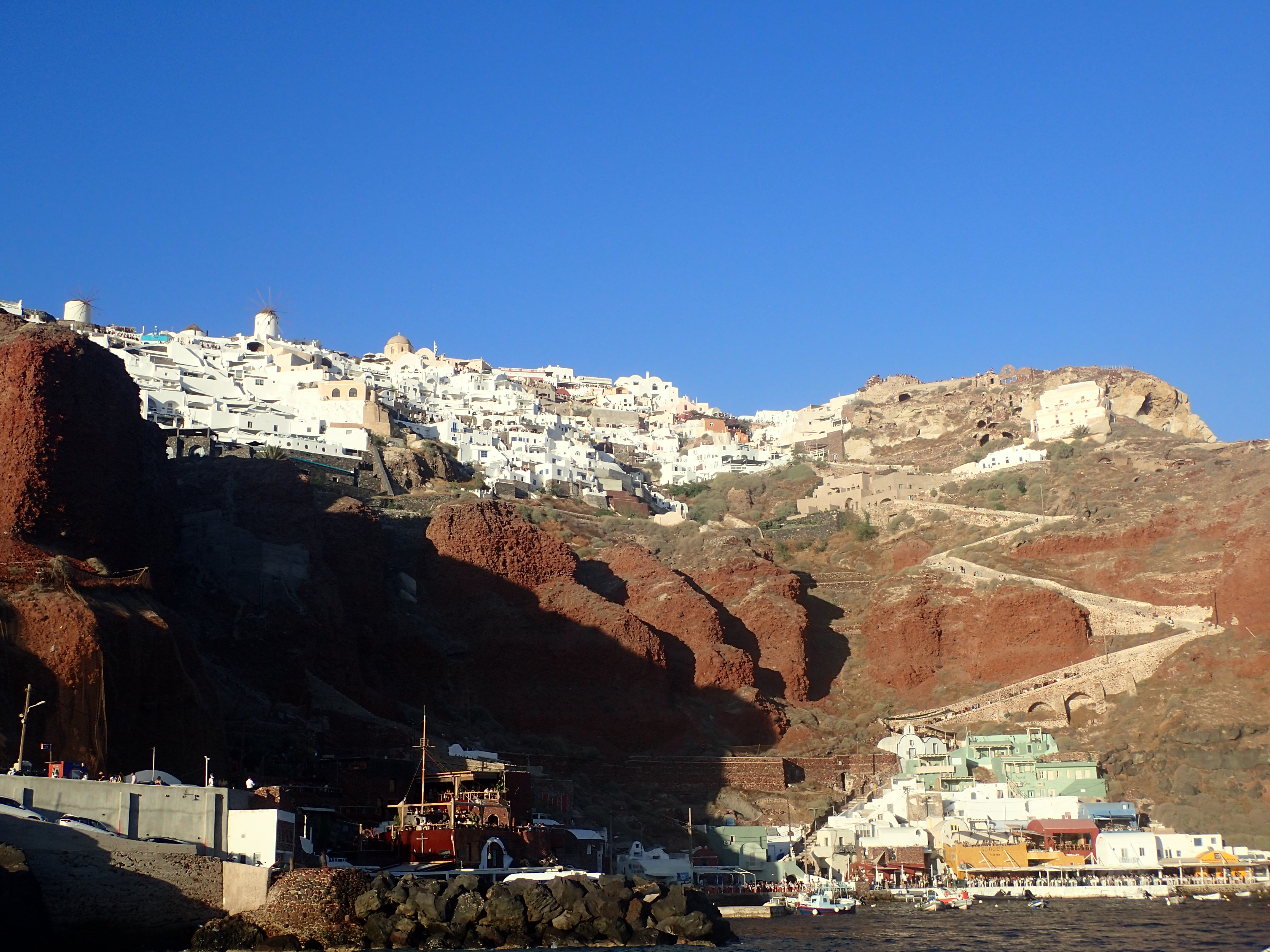 As expected, all good things come to an end which in the case of Greece was our arrival to Crete’s capital, Iraklion, a little like Chania but far worse. It’s a large capital town and so what else can be expected, but my confusion lay in the sheer volume of people that filled the usual restaurants and not a lot else. No one loves Greek good more than me, but I’m getting tired of the restaurant filled streets of the Balkans in general and cravings for home cooked food grow stronger by the day. Of course, if we were in the villages of Greece the story would be different because eating out or not, you are likely to get mama’s cooking. There is one point of interest worth mentioning in Iraklion which is Knossos, branded Europe’s oldest city, famed for its 4,000-year-old Minoan palace, Greek mythology, and estimated to have been settled as early as 9,000 years ago. The current site is both fascinating and disappointing. Fascinating because of the technology employed millennia ago including flushing toilets and pressurised waterpipes, disappointing because some wally of a Victorian thought he’d try to reconstruct the palace which just makes everything look a bit odd and out of place. Ironically, one of Europe’s largest ever volcanic eruptions destroyed the continent’s supposedly oldest city ending the Minoan civilisation and it was this very much still active volcano we were about to visit. Santorini.