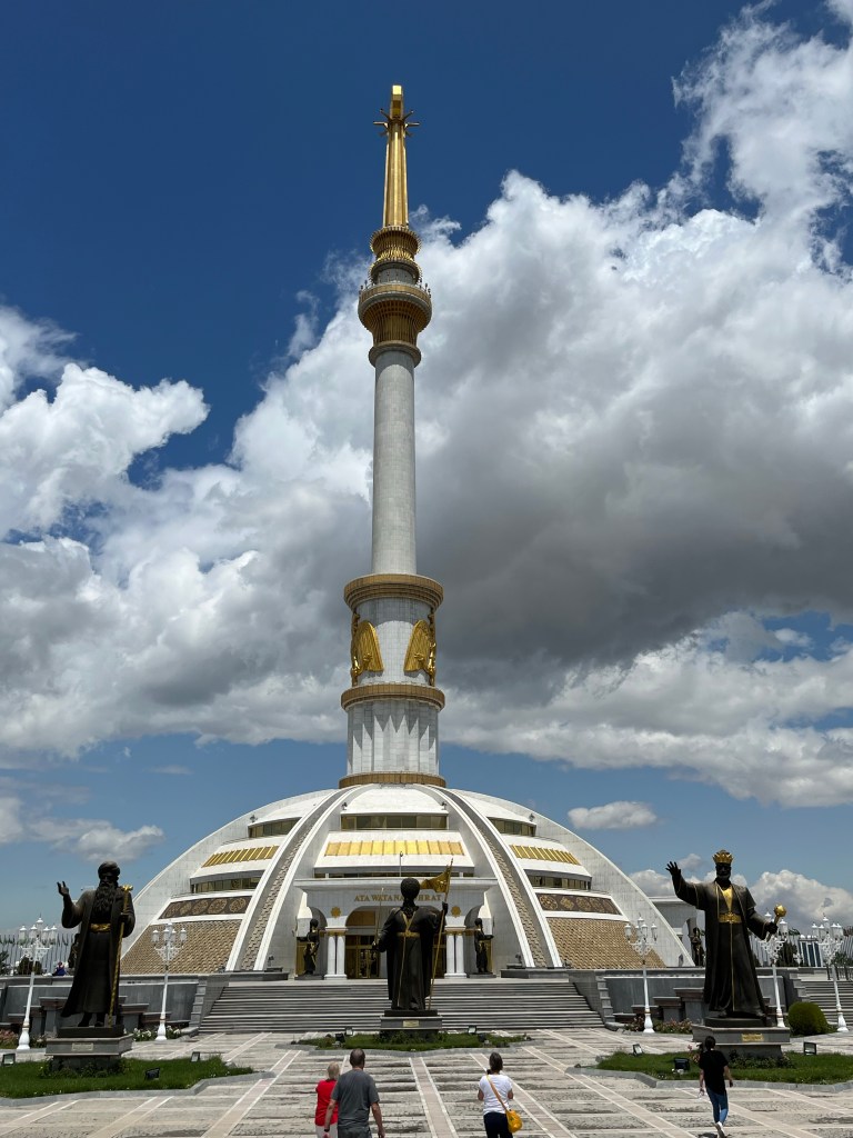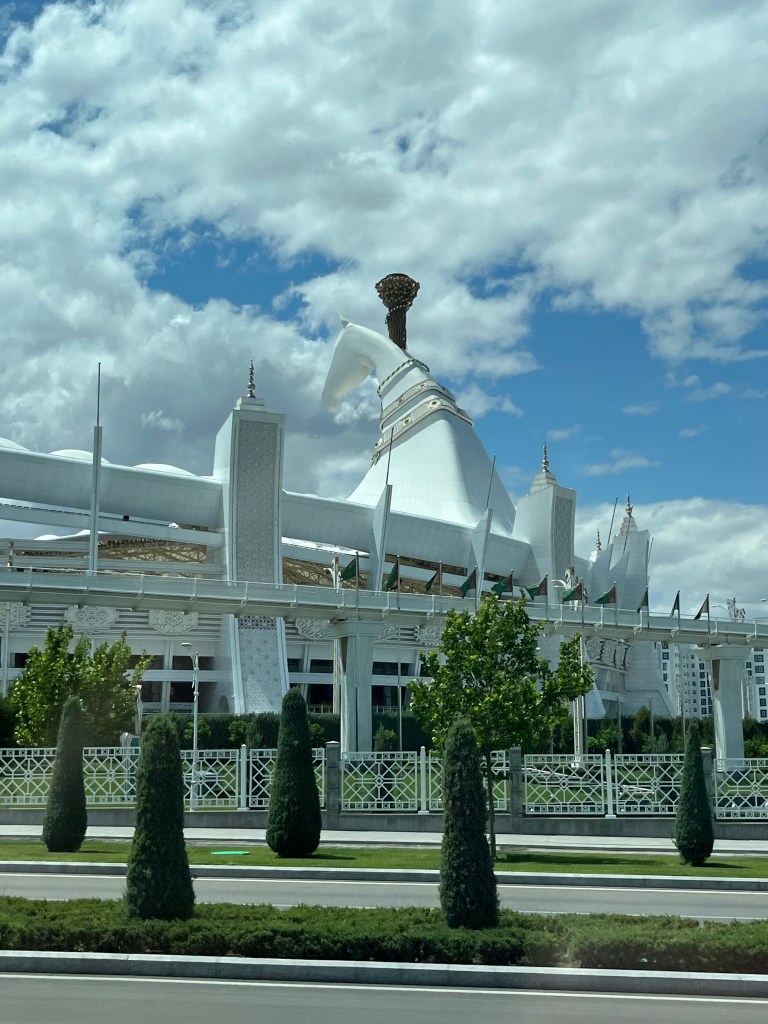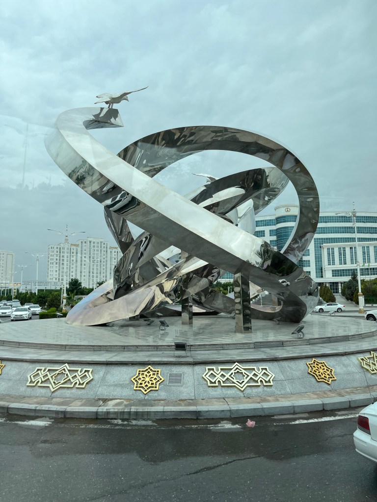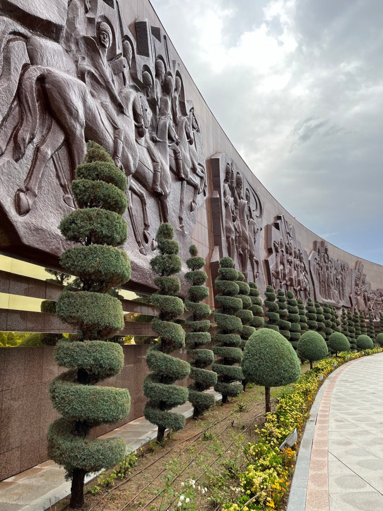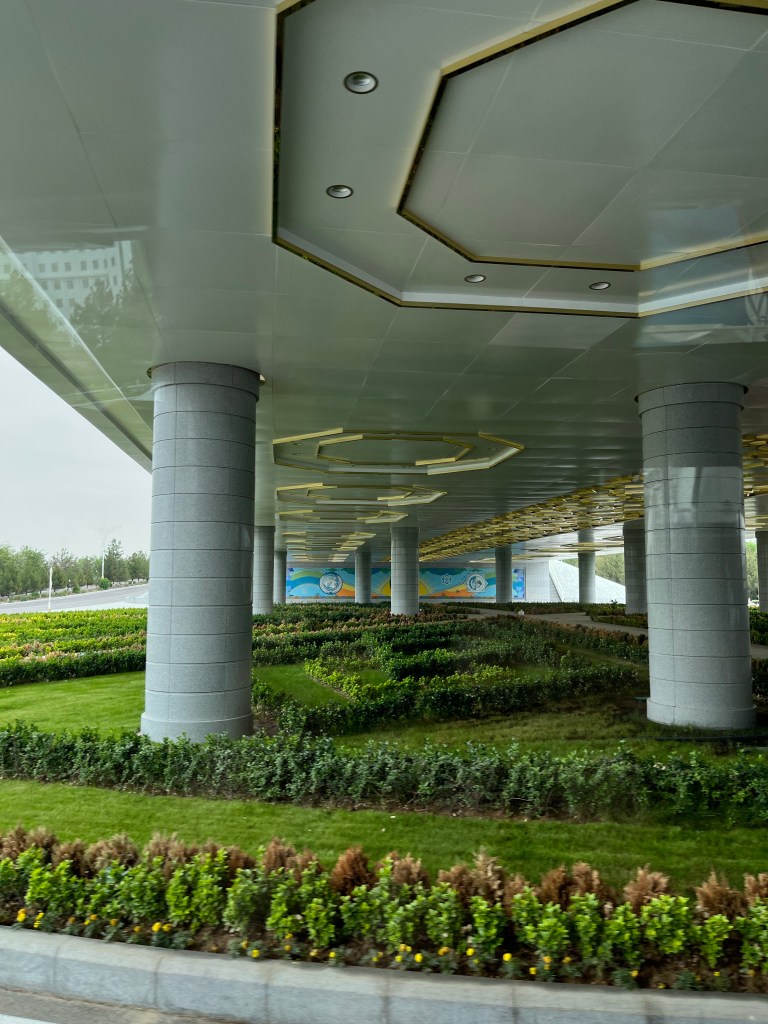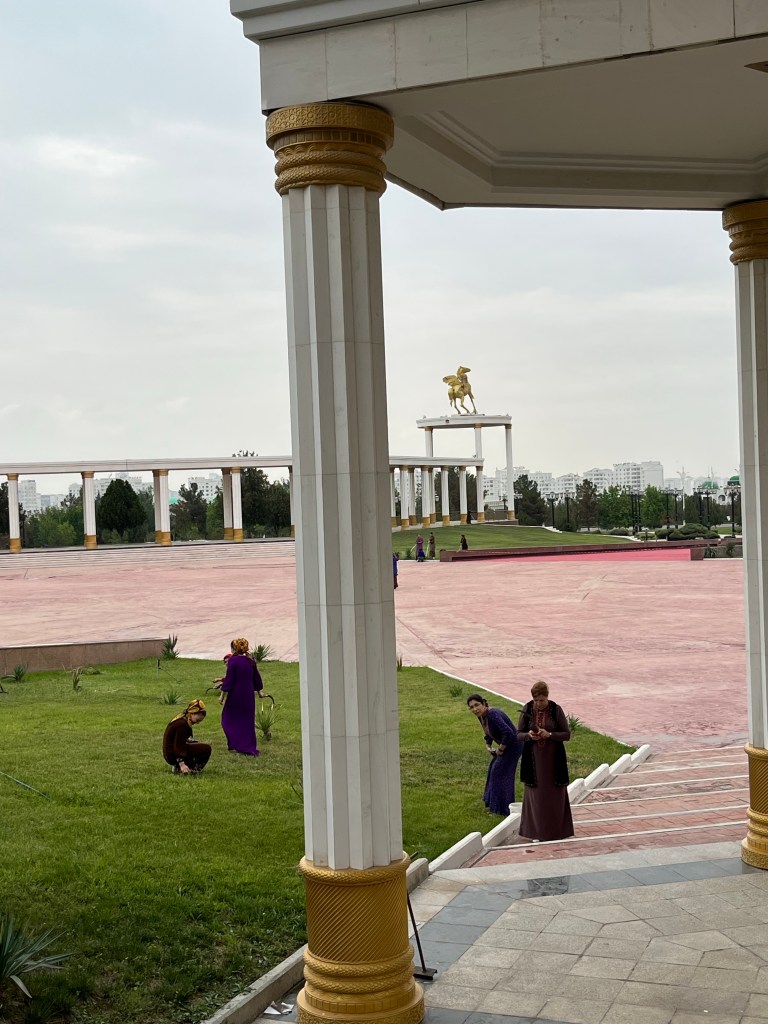 Our hotel was predictably away from anything interesting although not completely out of the way. Yet again it had not changed since the 80s and felt like it was empty. It wasn’t because on the way to breakfast the following morning I saw a man working out with an exercise rope in the hotel lobby next to the restaurant as though he was in the gym. Mysteriously we were all on the seventh floor and the elevator skipped the first, second, third, and fourth floors with the indicator going blank as it passed them. The afternoon we arrived we headed over to the National Museum where a gang of women tried to look busy caring for the gardens out front and where the 133-metre flagpole stands. A man was up a ladder reapplying gold paint to a sculpture, another group of men were power washing the pine trees. Even here I don’t think this is a usual occurrence and had a little to do with a national day just around the corner, but then maybe not. We entered the stunning museum, three stories high with a huge marble atrium and were immediately greeted by a cute guide that would be showing us through the exhibitions. The museum was empty except for two other tourists and a guide, and what appeared to be two locals. We were followed everywhere by another lady who hung back from the group maybe to stop us daring to look elsewhere, maybe to ensure no one took pictures other than the people in our group who had paid to do so. Either way, she did a splendid job of tidying up after me every time I tripped over the power cables that were not so conspicuously run across the floor to light exhibits. It was interesting, all centred around the ancient civilisations that resided in the area and with plenty of information written in Turkmen, Russian, and English, not that we had time to read it. There was no modern history, but there was a ruddy huge carpet hanging on the wall that had been gifted to one of the presidents. An hour later the guide pronounced the tour complete and ushered us out the door with a huge smile of relief as she appeared to relax for the first time during our visit.