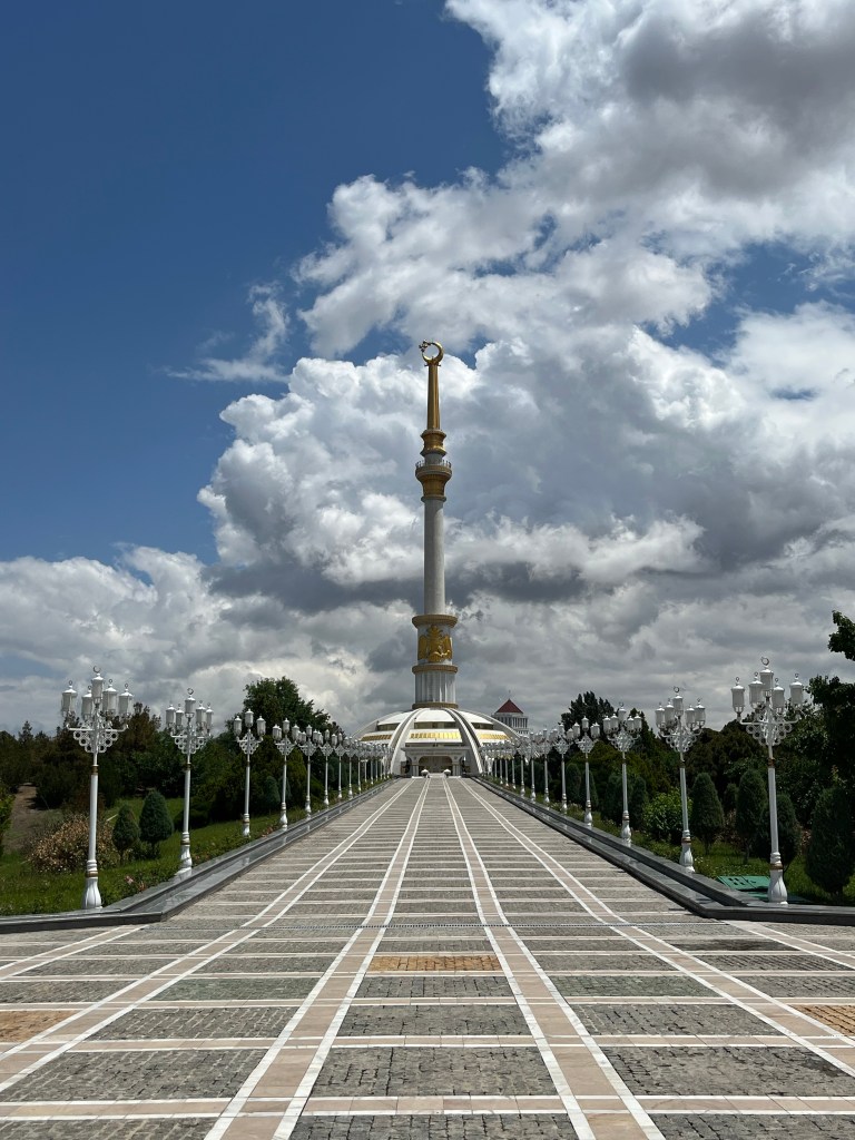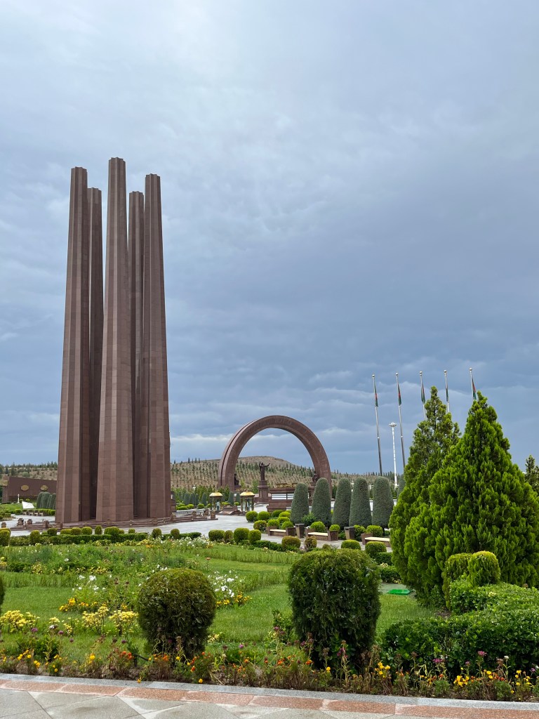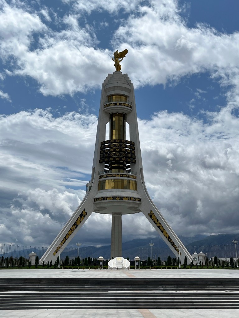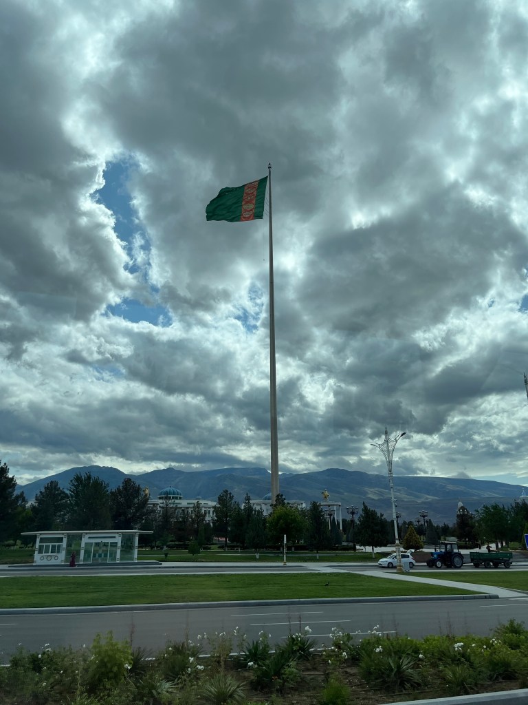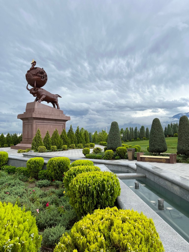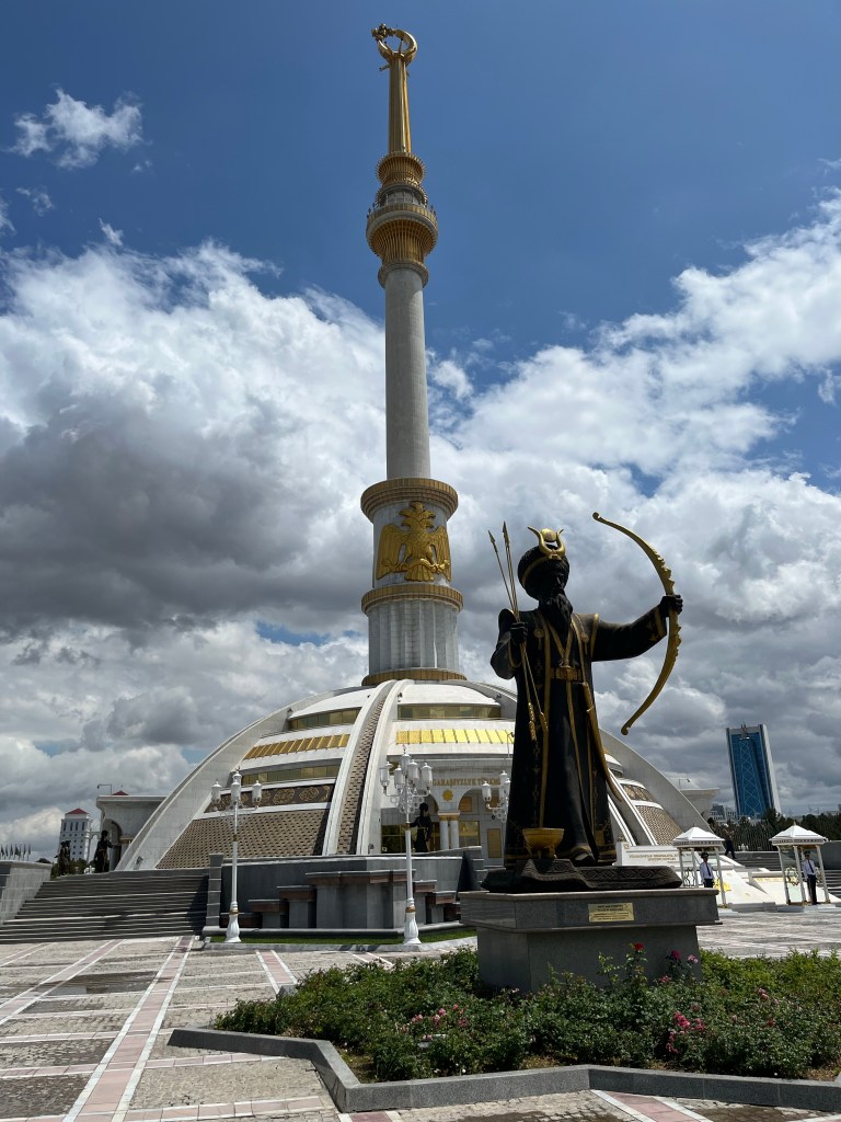 Our hotel was predictably away from anything interesting although not completely out of the way. Yet again it had not changed since the 80s and felt like it was empty. It wasn’t because on the way to breakfast the following morning I saw a man working out with an exercise rope in the hotel lobby next to the restaurant as though he was in the gym. Mysteriously we were all on the seventh floor and the elevator skipped the first, second, third, and fourth floors with the indicator going blank as it passed them. The afternoon we arrived we headed over to the National Museum where a gang of women tried to look busy caring for the gardens out front and where the 133-metre flagpole stands. A man was up a ladder reapplying gold paint to a sculpture, another group of men were power washing the pine trees. Even here I don’t think this is a usual occurrence and had a little to do with a national day just around the corner, but then maybe not. We entered the stunning museum, three stories high with a huge marble atrium and were immediately greeted by a cute guide that would be showing us through the exhibitions. The museum was empty except for two other tourists and a guide, and what appeared to be two locals. We were followed everywhere by another lady who hung back from the group maybe to stop us daring to look elsewhere, maybe to ensure no one took pictures other than the people in our group who had paid to do so. Either way, she did a splendid job of tidying up after me every time I tripped over the power cables that were not so conspicuously run across the floor to light exhibits. It was interesting, all centred around the ancient civilisations that resided in the area and with plenty of information written in Turkmen, Russian, and English, not that we had time to read it. There was no modern history, but there was a ruddy huge carpet hanging on the wall that had been gifted to one of the presidents. An hour later the guide pronounced the tour complete and ushered us out the door with a huge smile of relief as she appeared to relax for the first time during our visit.