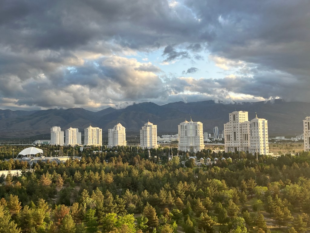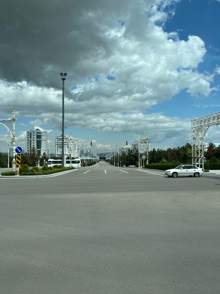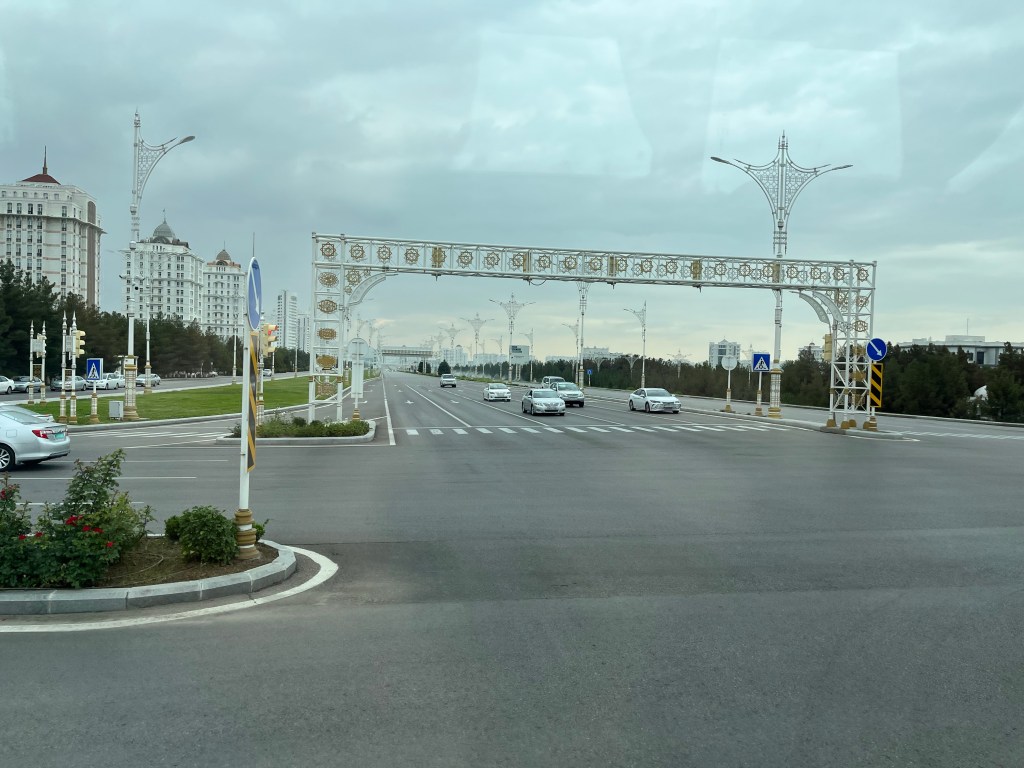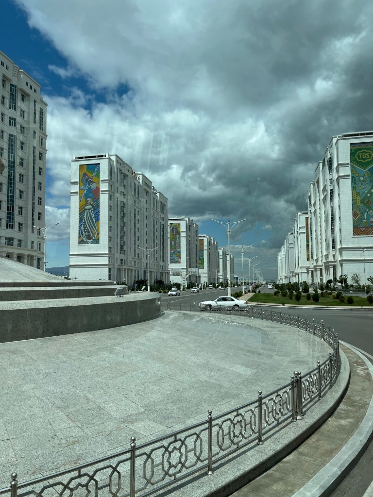 Naturally the highway improved as we neared the capital until we found ourselves on some of the most pristine roads on the planet, lined with trees and lawns, controlled by elaborate white or stainless steel traffic lights, connected by roundabouts home to wonderful pieces of architecture, and lit by thousands of streetlights with their white metal posts bent into sweeping curves of grandeur. Every car was white or a light shade of silver, any other colour is forbidden by the president in order to maintain his vision, whatever that may be. The buildings in the new part of the city are all white, the majority lined with marble. The city had been devastated by an earthquake back in 1948 and rebuilt during the Soviet era, but since independence there has been a drive to reinvent the city, replacing Soviet concrete with approximately 550 buildings to date, all decked out in marble ranging from government buildings to residential tower blocks. There is no doubting the amount of marble on show, but ‘show’ is the key word here. Knock on a lot of the marble, say the marble pillars in a hotel lobby, and it sounds hollow, but knock on marble associated with something important, like a dead president’s mausoleum and the knuckle is likely to shatter as the marble is so solid. Everything about this city is for show, and at first you want to believe its unique, but it’s no different to many cities all over the world, and especially cities with plenty of gas and oil at their disposal. Ashgabat has the most marble buildings in the word, one of the highest flag poles, the largest construction of a horse’s head, the largest indoor Ferris wheel, the list goes on of records it holds or held. It is a vast city; no single attraction is easily accessible despite the numerous empty multilane highways leading to each. There are acres of newly planted trees everywhere which I should be impressed with, but the water usage must be phenomenal. Vast open spaces full of monuments, trees, flowers, and brick pavement are void of people. The new residential tower blocks spring up all around but look empty of life, and stunning polished government buildings glisten in the sun but no one can be seen. The country with a population of around six million makes a huge deal about being officially neutral, but its defence ministry takes up an entire city block and sits right next-door to the presidential palace. The city is beautiful, like Dubai, but completely void of what we may term normality. There is no atmosphere, no character, just an illusion of grandeur that is easy to distract.