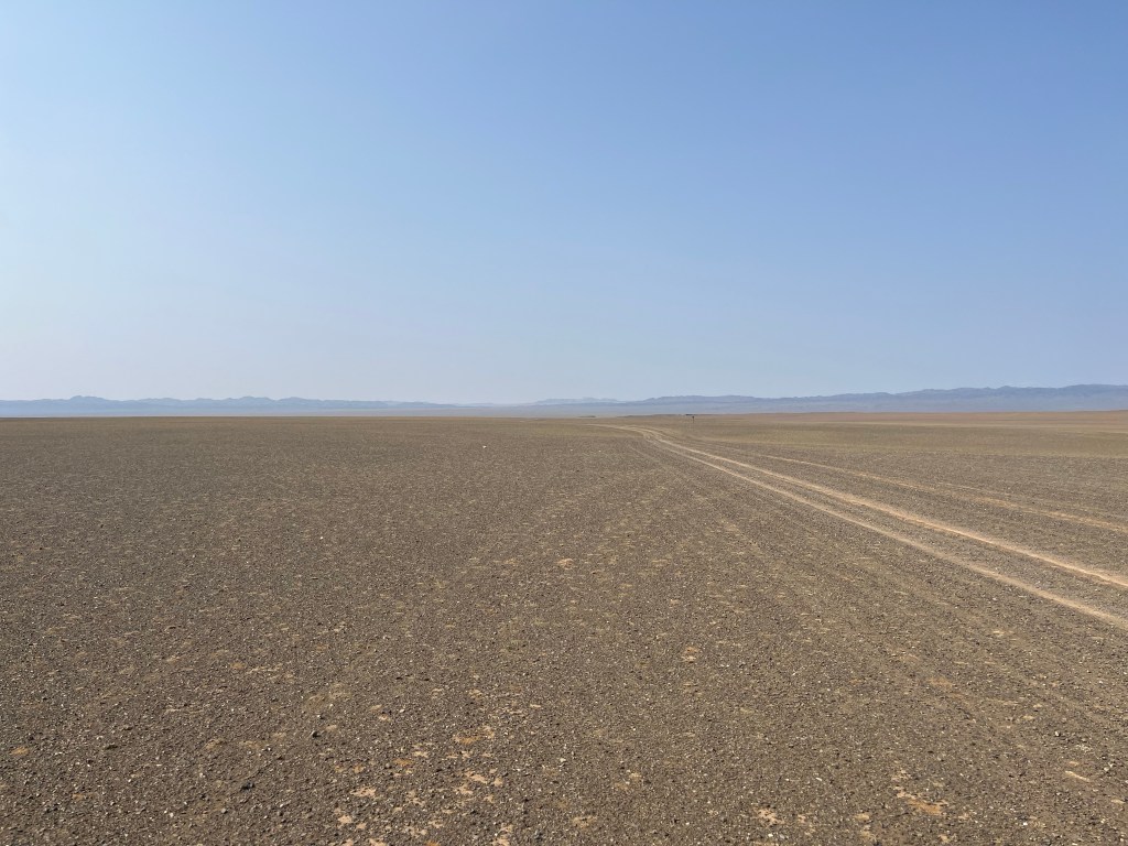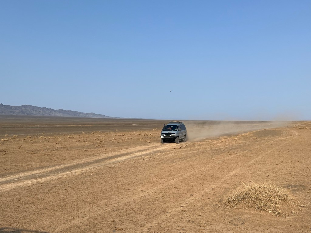 One lunch stop in a random little town was extended due to a technical issue with one of our two Mitsubishi people carriers. Don’t be fooled by the description of ‘people carrier’. Minivan could be another description but still doesn’t do it justice. Whatever they are, they have four-wheel drive, beefed up suspension, and come with a three litre V6 engine. Unfortunately, the radiator had sprung a leak in one of the cars and so the two drivers whipped it out, rectified the cause, glued the radiator up, and put it all together after having a spot of lunch. We meanwhile sat around drinking a beer and watching a random tree planting ceremony despite the fact we were in the middle of a desert, and the guy with the boring machine couldn’t get it to go through the dry rocky earth. With the afternoon’s maintenance and entertainment finished with, we took off into the setting sun and some of the best views we had yet experienced in Mongolia. We cruised down no obvious road, driving more or less wherever we wanted along the almost empty desert that showcased sand dunes to our distant left at the foot of a mountain range. To our right the desert floor appeared to rise until disappearing into the horizon. The setting sun produced a unique display of contrasting colours but softened into pastel shades of green grass, golden sand, black mountains, and purple sky, creating a wholly unique and visually stunning experience. It’s hard to trust what you see in Mongolia. Look across the landscape and it appears to be carpeted in thick green grass but look immediately down and what appeared to be a lawn is in fact just a few blades of green amongst an ocean of sand and rocks, especially in the Gobi.