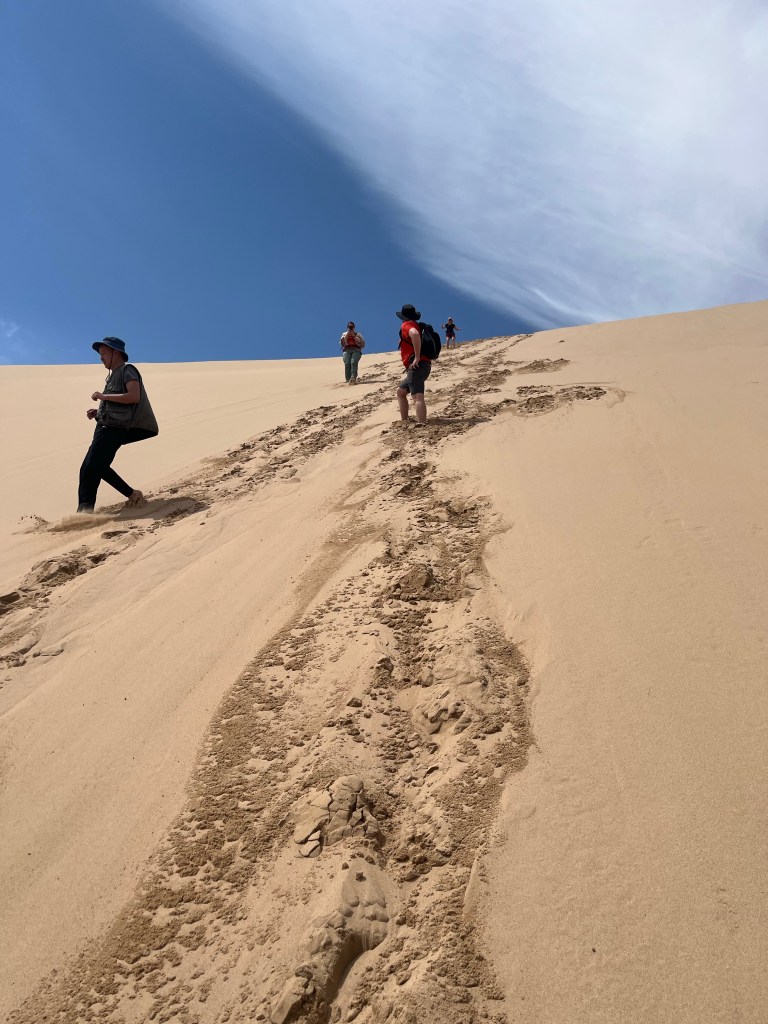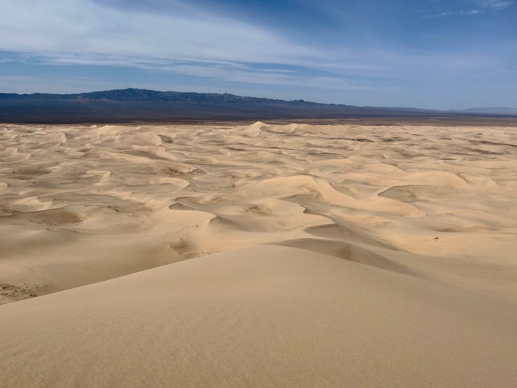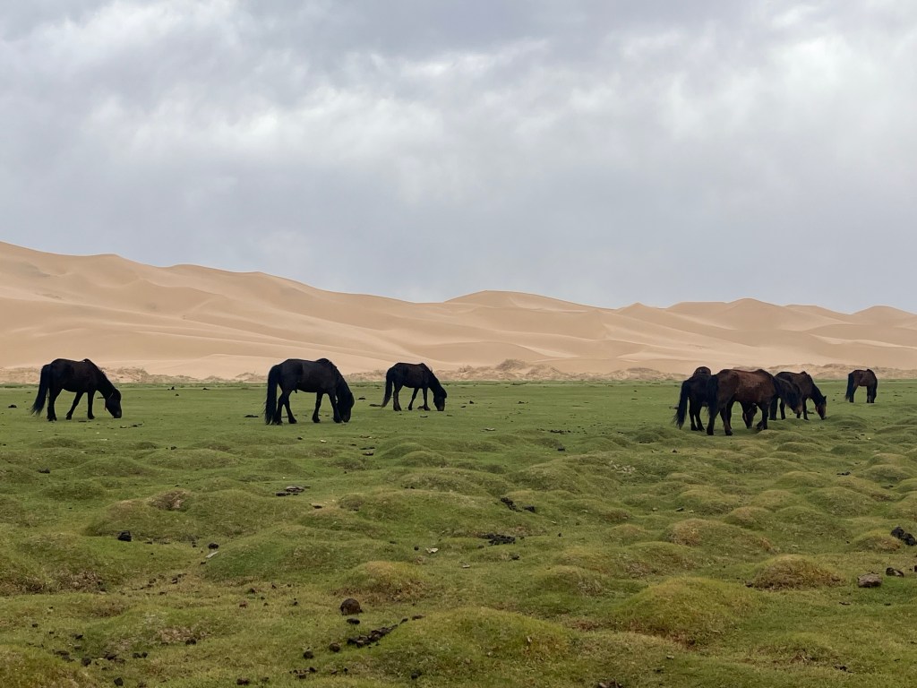 After five days of waiting, I finally awoke to a day that was sunny and warm enough for shorts. It was a wise choice of clothing as the activity for the morning was to hike up one of the largest sand dunes that we had passed the evening before. Our guide said zigzagging up would be the best option and so we duly began to pick a route up through the mountain of sand. Meanwhile, our guide went against his own advice and began scrambling straight up the dune, taking two steps forward and sliding one and a half steps back. That said, climbing sand dunes isn’t easy no matter how one tackles it, and as ever brute force and ignorance finally delivered me 160 metres up to the peak and without my heart exploding. Upon reaching the crest of the dune I was met with a vista of smaller sand dunes reaching into the distance that could not be seen from the side we had come; looking back was the stoney plain we had driven along the evening before, and a random strip of blue and green blossomed at the foot of the sand dunes where a small stream had come to an abrupt stop and created a little grassland oasis where horses grazed contently. It had been less than 24 hours since we had been hiking on ice through a rocky canyon, which would have been surprising if not for the variety of landscapes that lay in front of my eyes from the top of the dune.
