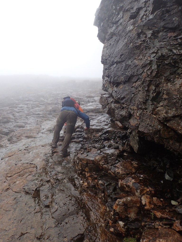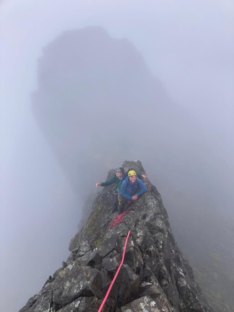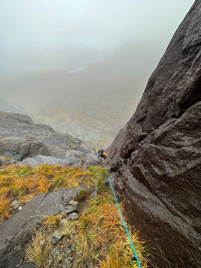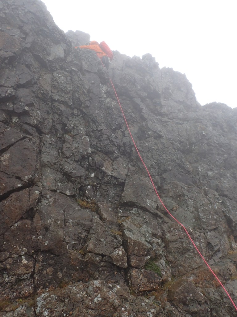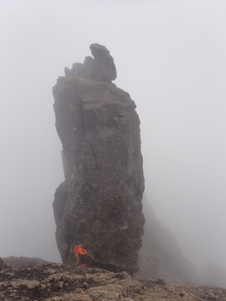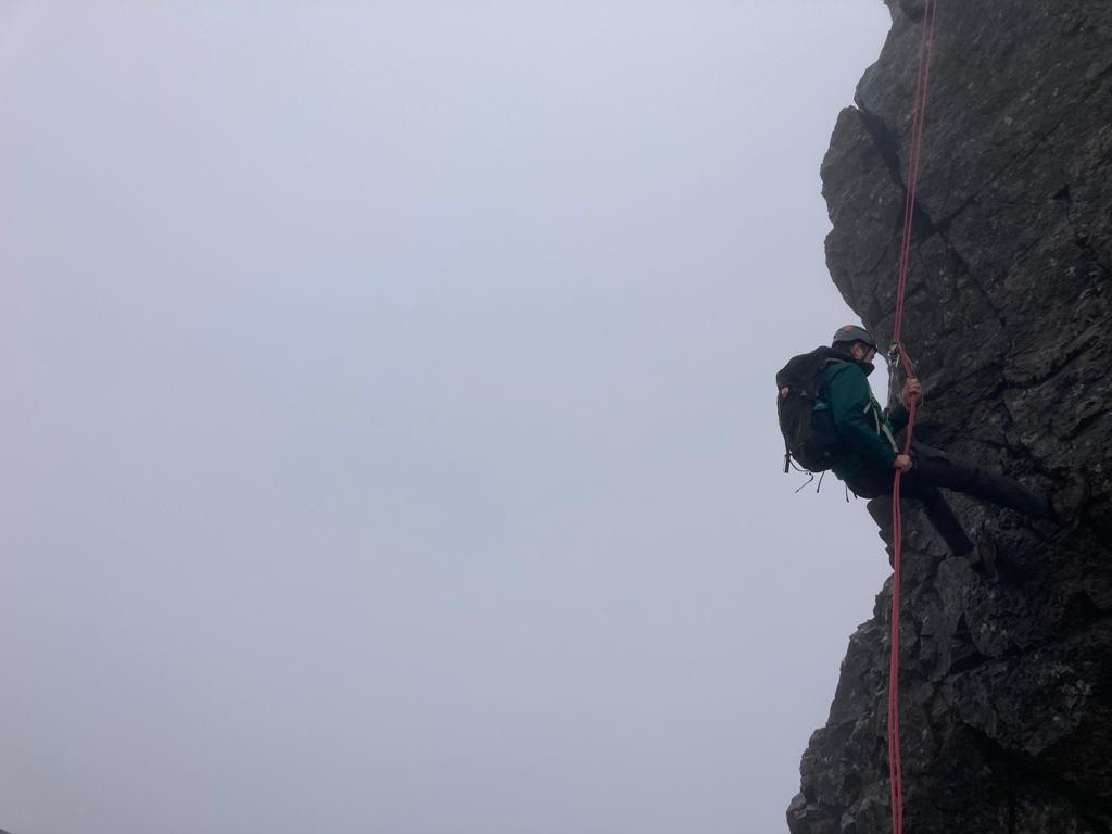 The weather remained largely dry but the wind was increasing and I’d rather describe the scene as outright miserable than moody, nonetheless, the hike to our next Munro was damn good fun scrambling up and across scree and ultimately up a colossal slab of rock that had what can only be described as a polished finish to its surface. Still up in the clouds, it was difficult to get any sense of the environment other than what was directly in front of us. On this occasion it was a wall of rock that, from our perspective, looked good fun, and I roped up with pleasure and watched the Brigadier scamper up said rock to prepare our ascent. Ten minutes later we were climbing and after a couple of confident manoeuvres up I found myself staring out into the abyss. What we were climbing wasn’t the front of a huge Munro as I had first assumed. It was in fact just a large slab of impressive rock jutting up into the atmosphere and no wider than a metre in places. At the halfway point we waited for the Brigadier to set up the next part of the climb, the section he had originally described as ‘a little airy’. It was at this point fear tried to put an end to it all as my arms hugged the rock, but my legs shook in such a manner that I thought they intended to throw me off the ridge. I felt exposed, we were exposed, the sheer drop either side of me meant I couldn’t safely lean into anything, any gust of wind heightened the fear, the cloud confused me further as I tried to determine whether their presence comforted me or added to the fear. Counterintuitively, I knew the only way out of my predicament was to continue going up. If I refused, I would be left clinging to the rock for an unknown amount of time while my less than impressed guide worked out the options to remove me. As we waited to start climbing the next section, I mustered a smile for the camera that the Brigadier was now pointing at me, took in several, long, deep breaths that stopped the shaky leg problem, and got on with the job in hand when instructed to. At the top I learnt that I had just summited the Inaccessible Pinnacle, the most difficult Munro to summit and sitting at 986 metres. The original plan had been to learn a bit of mountaineering for two days before attempting the Inaccessible Pinnacle on the last day, not that I had ever truly known what that involved. A straightforward abseil got us back down onto something a little sturdier and all was right with the world again. For some reason I find abseiling easy, I think because I know I’m firmly attached to the mountain, I’m going down with purpose, and I can control the going down.