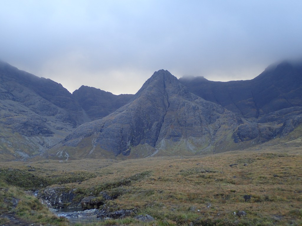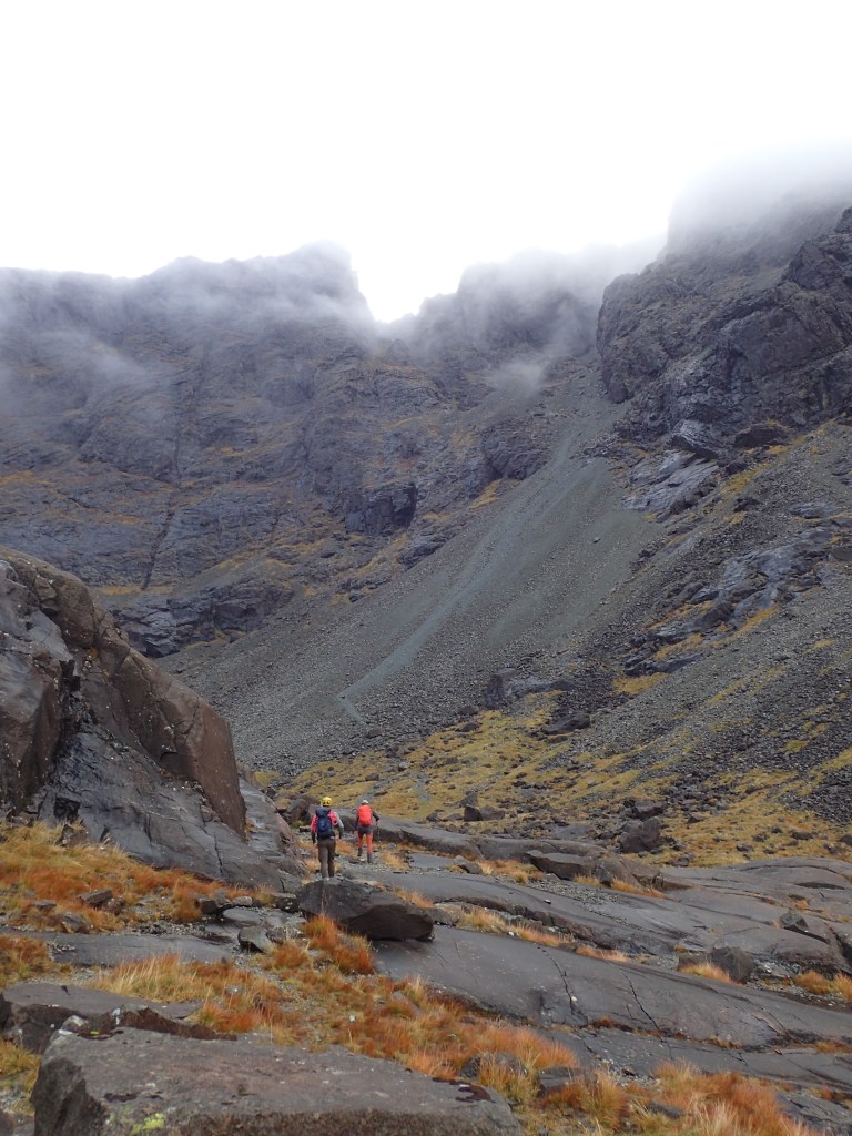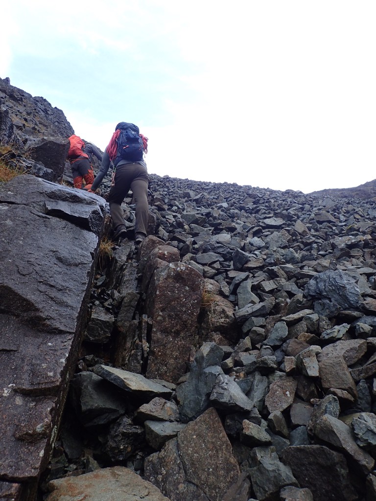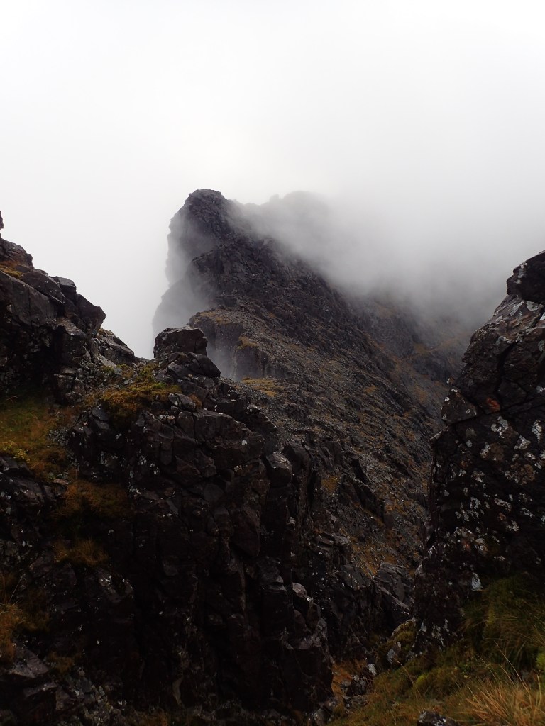 Our first day on the Munros started moody albeit dry and not too windy. This turned out to be both a blessing and a curse as the day was looking to be our best day of the three and so it would make more sense to do some of the bigger climbs first. With a total of four of us on the trip we halved, and the brother-in-law and myself were introduced to the Brigadier who would be leading us for the day. At the time I only understood him to be retired from the army, but by the end of the second day I had learnt that he had served in the army for 39 years, reaching Brigadier and earning an OBE. I am a sucker for such accolades and blindly followed him wherever he wanted to go on our third and final day, letting him teach (literally) the ropes to my brother-in-law while I patiently stood on the end of a rope wondering what I would tell my sister if it all went wrong. However, it was our first day, and although I’m usually happy to trust anyone prepared to drag me around a certain corner of the world, I think I had grossly misunderstood what mountaineering involved. It started well with a nice gradual hike up through tough old grassland and into the foothills. The Brigadier would point out all the peaks that we couldn’t see due to a thick blanket of cloud and fill us full of stories of where people had died while out doing exactly what we were doing. We scrambled up a scree to reach a ridge immersed in cloud, but a ridge with plenty of space and from where, if one should fall, they are unlikely to die. Here we were instructed to get our harnesses on, drop the bags and follow on up to an altogether more impressive ridge that looked awesome fun. As we progressed, the rocks got less grippier and with every slip I lost a dash of confidence. Eventually the Brigadier roped us up which offered a little security although how he could have stopped us from plummeting to our deaths was yet to be understood. This was becoming more of a possibility as the ridge narrowed and the drop varied from not being able to see anything through the cloud to revealing quite substantial sheer drops. It was the decreasing confidence in my boots more than anything that I found myself on the verge of sitting down and going no further, but thankfully stubbornness prevailed and we peaked our first Munro of the day, Sgurr Mhic Choinnich. We returned to the bags to learn that the Brigadier was fuelled on pork pies, tucked into some of our own lunch, and set off to our next destination.