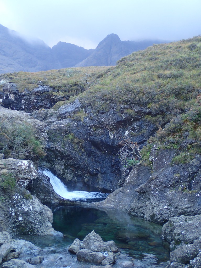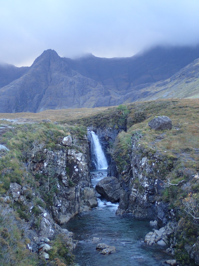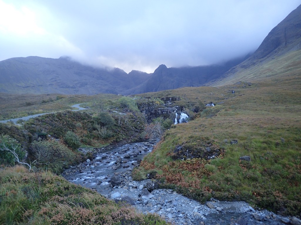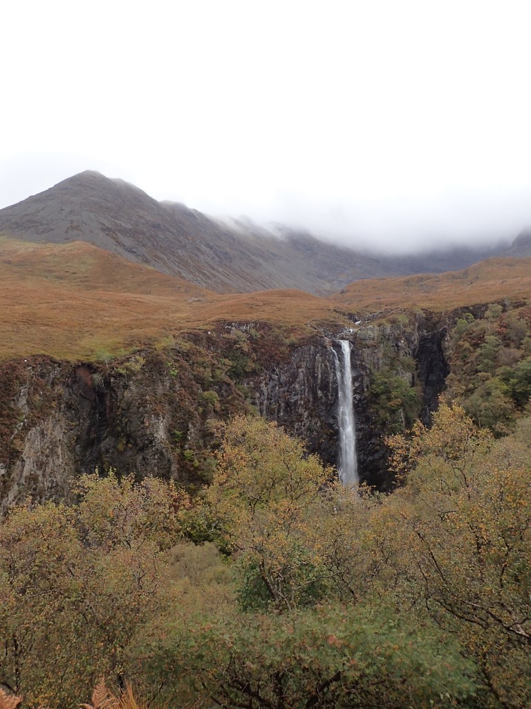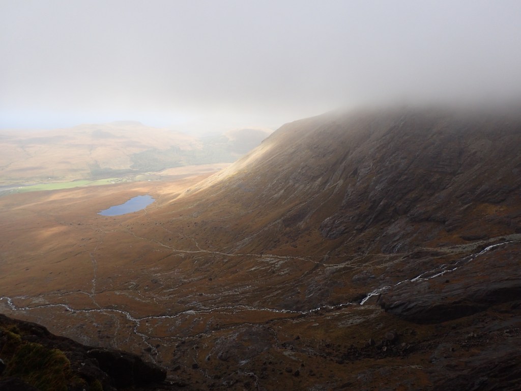 Our first day on the Munros started moody albeit dry and not too windy. This turned out to be both a blessing and a curse as the day was looking to be our best day of the three and so it would make more sense to do some of the bigger climbs first. With a total of four of us on the trip we halved, and the brother-in-law and myself were introduced to the Brigadier who would be leading us for the day. At the time I only understood him to be retired from the army, but by the end of the second day I had learnt that he had served in the army for 39 years, reaching Brigadier and earning an OBE. I am a sucker for such accolades and blindly followed him wherever he wanted to go on our third and final day, letting him teach (literally) the ropes to my brother-in-law while I patiently stood on the end of a rope wondering what I would tell my sister if it all went wrong. However, it was our first day, and although I’m usually happy to trust anyone prepared to drag me around a certain corner of the world, I think I had grossly misunderstood what mountaineering involved. It started well with a nice gradual hike up through tough old grassland and into the foothills. The Brigadier would point out all the peaks that we couldn’t see due to a thick blanket of cloud and fill us full of stories of where people had died while out doing exactly what we were doing. We scrambled up a scree to reach a ridge immersed in cloud, but a ridge with plenty of space and from where, if one should fall, they are unlikely to die. Here we were instructed to get our harnesses on, drop the bags and follow on up to an altogether more impressive ridge that looked awesome fun. As we progressed, the rocks got less grippier and with every slip I lost a dash of confidence. Eventually the Brigadier roped us up which offered a little security although how he could have stopped us from plummeting to our deaths was yet to be understood. This was becoming more of a possibility as the ridge narrowed and the drop varied from not being able to see anything through the cloud to revealing quite substantial sheer drops. It was the decreasing confidence in my boots more than anything that I found myself on the verge of sitting down and going no further, but thankfully stubbornness prevailed and we peaked our first Munro of the day, Sgurr Mhic Choinnich. We returned to the bags to learn that the Brigadier was fuelled on pork pies, tucked into some of our own lunch, and set off to our next destination.