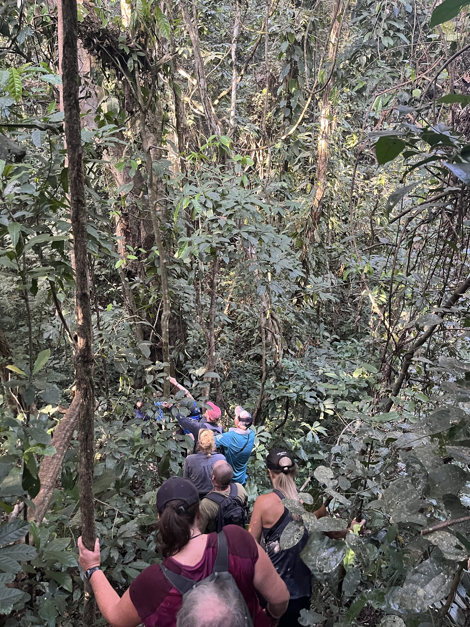 Time was moving on, light was fading and none of us were equipped to be out in the dark. A small fraction of the group was terrified we’d get lost which I felt was simply insulting to the rangers. The same small fraction backed up their concerns stating that we were not going to see anything better than what we had just witnessed. Maybe so, but I had paid for two visas to spend less than 24 hours in the country and, overcome with the utter frustration that had accumulated with people in the group trying to take the adventure out of an adventurous journey over the past few weeks I was determined to continue on if possible. Sure enough, it was. The rangers were more than happy to split the group with half returning to camp and the other half staying out. I had finally stuck to my guns and as a reward I soon found myself climbing a massive hill with six friends following behind, I terrified that I had led them on a wild chimp chase for nothing. It was quite the chase, made more amusing by the fact our guides carved their way through the forest with not the conventional machete but a humble set of garden secateurs. Dragging ourselves through dense, prickly bush, and up the seemingly endless hill with roots intent on tripping up anyone unaware, the light was fading fast yet the sweat poured from us. Finally, the terrain started to level out, the heartrate reduced, and a chimp stared down at us from a tree. We followed the chimp a little further and then spent a remarkable 20 minutes in complete silence watching three of them prepare their nests for the night. It was a beautiful moment for many reasons including the fact that we did see better than what had been seen earlier, and because the group had split, it had left only seven of us which allowed us all to drift off into our own little space and enjoy unfettered access to the moment. No one was talking, no one was fighting for position for photos, it was a moment to purely absorb, to enjoy, and to make one’s own. I went as far as saying it was almost as good as the hour I got to spend with the mountain gorillas in Rwanda all those years ago. That was more intimate but seeing the chimps here in such a relaxing atmosphere was completely unexpected and, combined with the effort exerted to get to them, it provided a very rewarding experience.