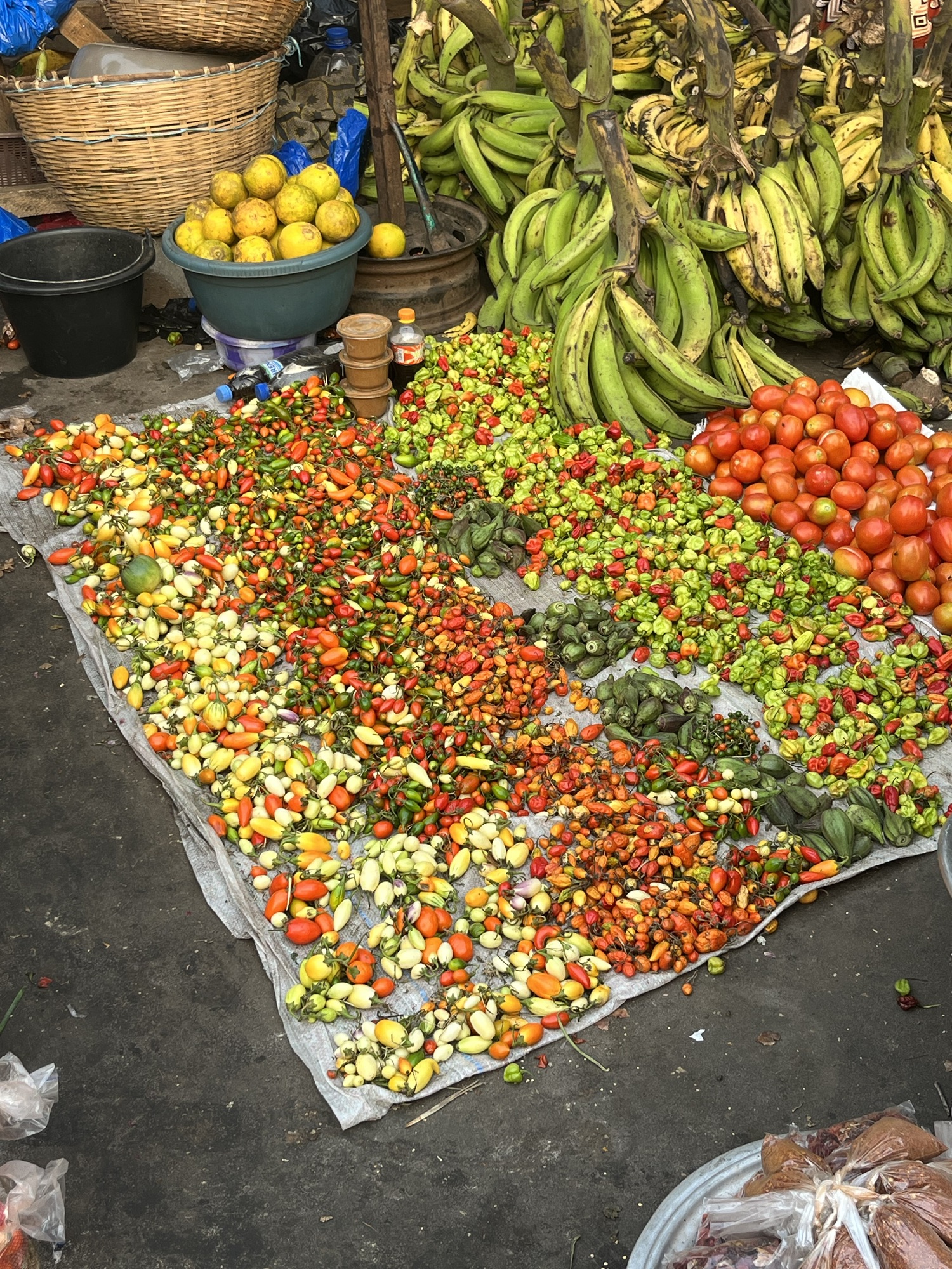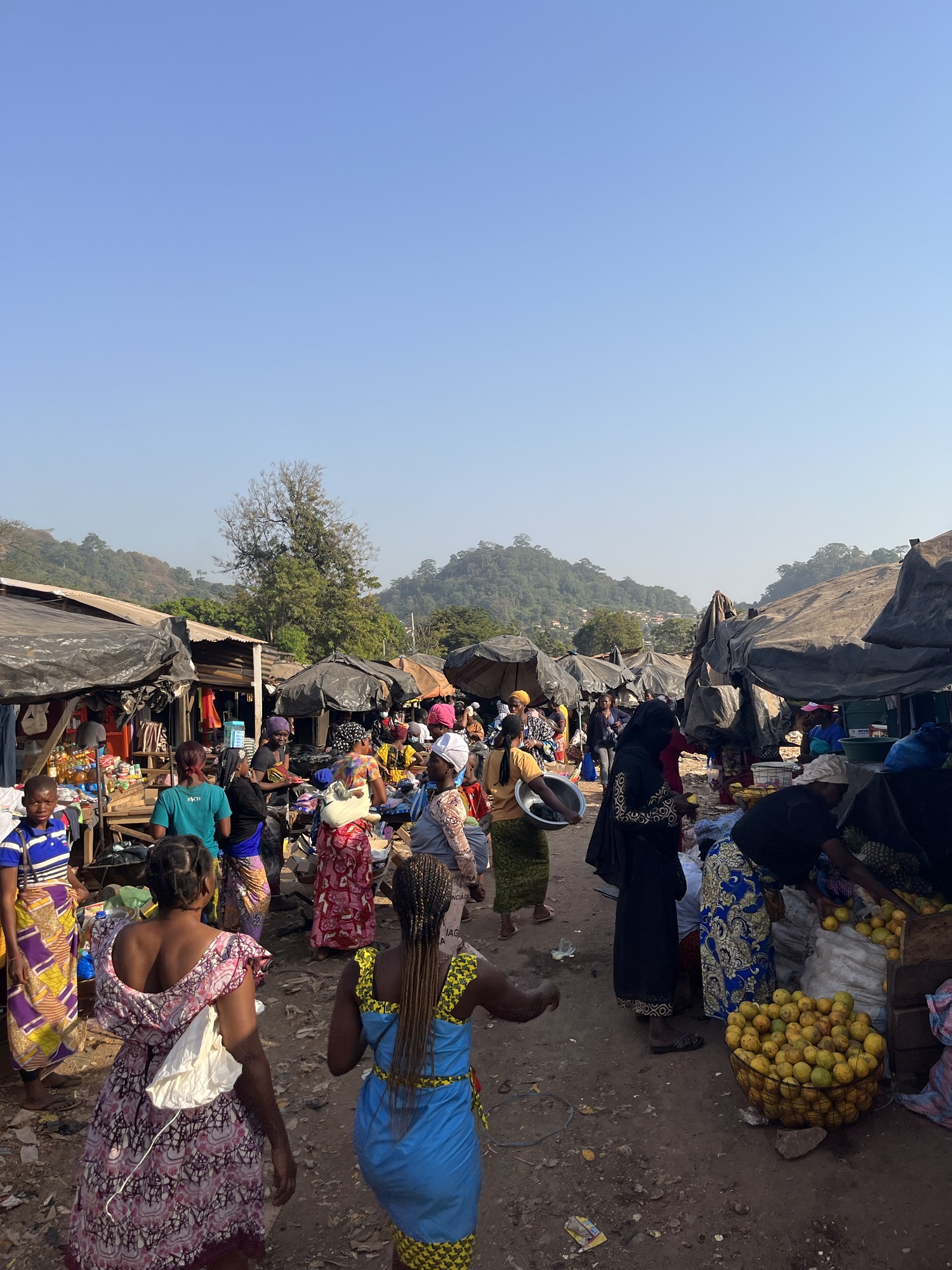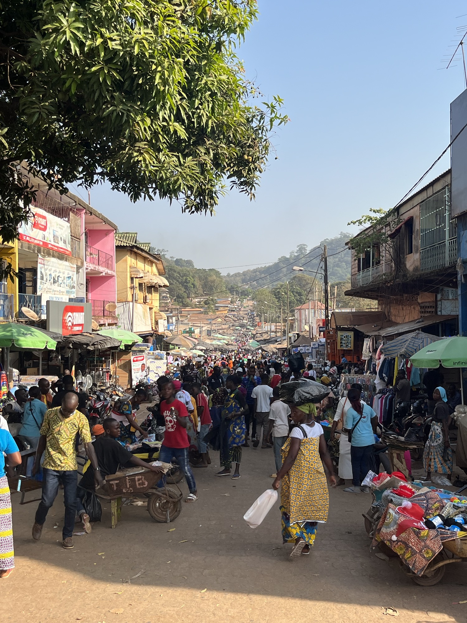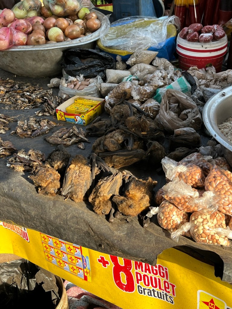 Back in the heart of Man and as with the whole West African region, we walked around completely free of people trying to sell us stuff or asking for money which is always a wonderful feeling; in the towns and cities we are simply absorbed into the daily mayhem. Our amblings took us to the local market where we happened upon a stall covered in dead bats. In my finest French I asked if they were medicinal but no, they were for the cooking pot. Never has there been a starker representation of the void between developed and developing nations and their attitude towards pandemics and risk. We strode past two confident cute girls sat at a stall who asked for a photo but I chickened out. A few moments later we happened to return, and I pulled out my phone to offer a photo which caused one of the girls to immediately hide in shyness. This led to her more confident mate smacking her friend on the back with such force that it, and the accompanying laughter, nearly knocked both of them off their bench.