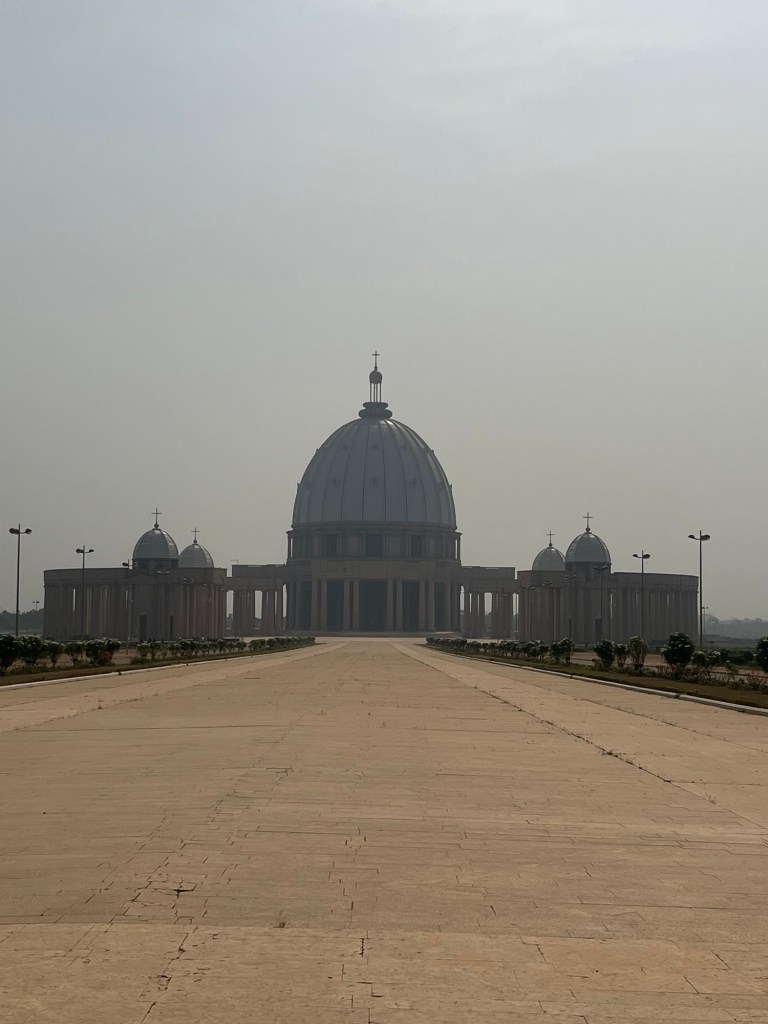 It was a long drive day into Yamoussoukro, but we sure knew when we were approaching the country’s capital city. There was a huge road building programme in progress with large, modern highways already in operation and money collected from modern toll booths. Helicopters were regularly flying overhead, smart air-conditioned coaches sped past us, truck after truck of agricultural fertiliser passed by (I’m a farmer, I notice these things) and then, amongst all this modernity, a man on a motorbike with a large goat sitting in front of him drives past. On the outskirts of the city we stopped at the world’s largest basilica although that accolade is dependent on how racist and dedicated you want to be in knocking an African country off the top of something. Not that you shouldn’t question why $175-600 million (USD) was spent on its construction back in the 1980s by an autocratic leader, you should, its ridiculous. Now is a good opportunity to quickly discuss religion in the countries we have travelled through so far. Sierra Leone, surprisingly to me is majority Muslim, as is Guinea. Liberia is majority Christian. Meanwhile Cote d’Ivoire is 40% of each. Then president, Felix Houphouët-Boigny, like the majority of African leaders at the time loved a big project and for him the basilica was one of many. Another substantial construction project was the transformation of his birth village, Yamoussoukro, into the new capital which remains as such today, if only by name when compared with the economic might of Abidjan on the coast. Yamoussoukro reminds me a lot of Ashgabat, another city built by a dictator for nothing more than creating an impressive illusion. The streets are huge with multi-lane highways everywhere, yet largely void of traffic. There’s plenty of large open green spaces and the usual sprinkling of elaborate government buildings and hotels, all of which now look dated, decayed, and above all out of place as though they never wanted to be there in the first place.