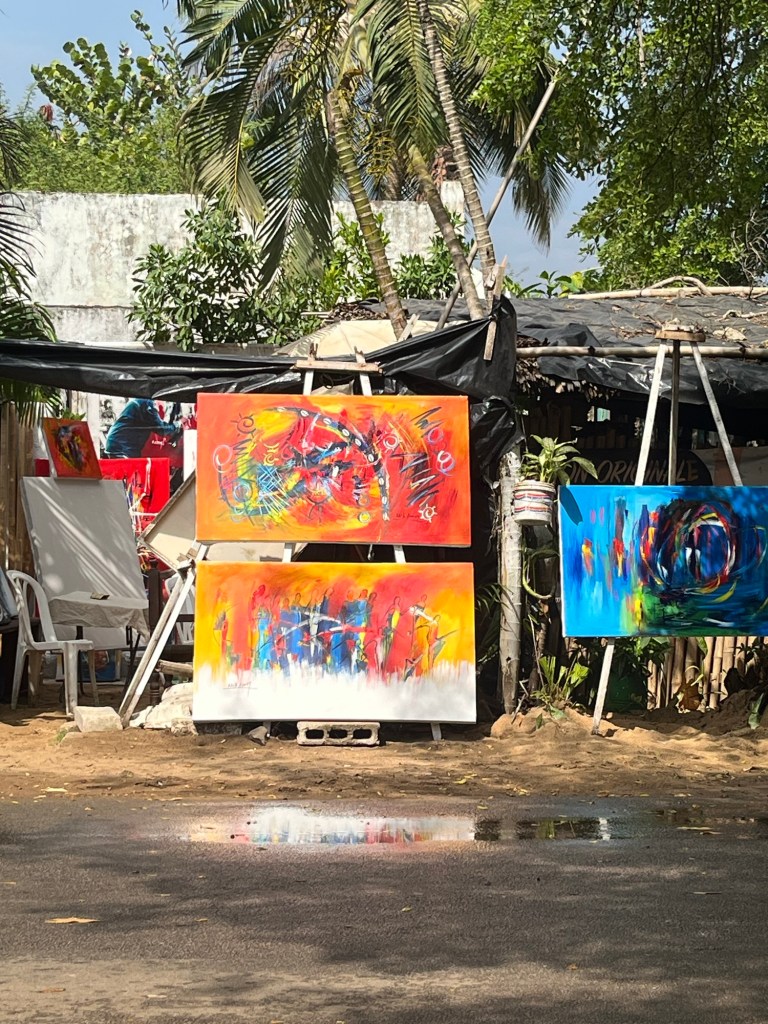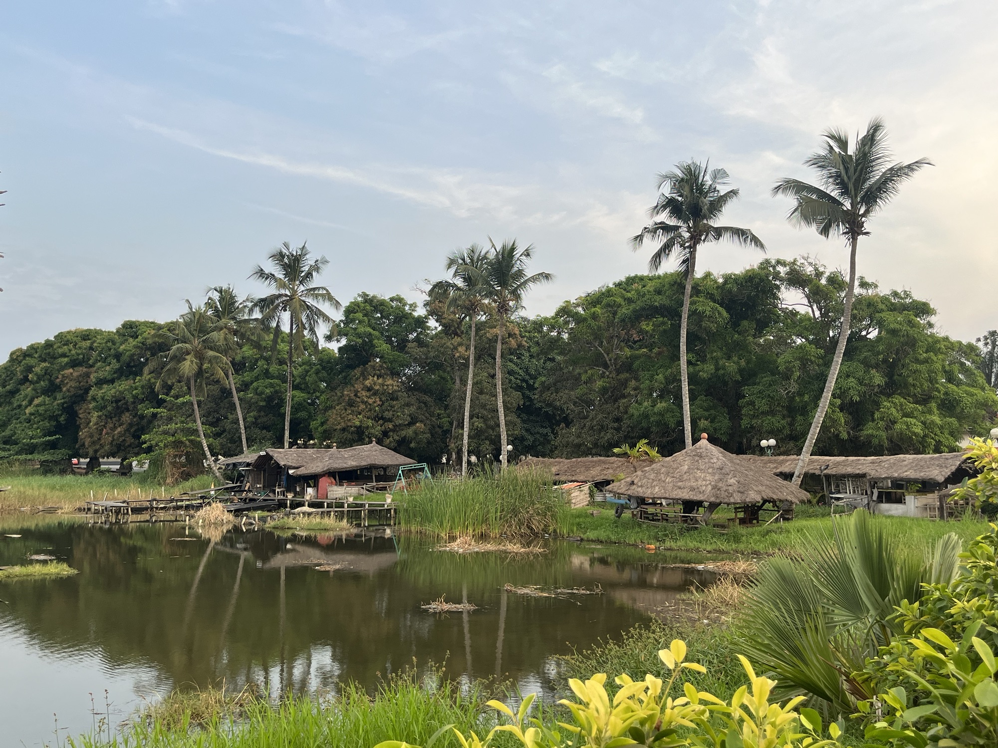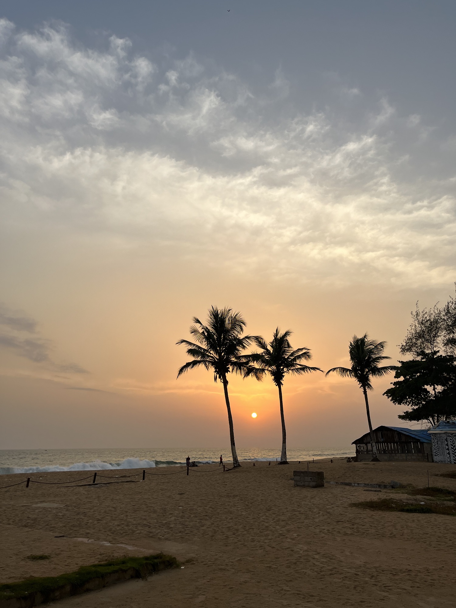 We arrived at the quaint seaside town of Grand-Bassam around 4pm. It’s quite a large town but the suburb that stretches along the beach is a beautiful mix of decaying French colonial buildings, palm trees, sandy roads, restaurants, hotels, and roadside art boutiques. We were once again staying in a hotel, but the double beds were bigger and comfier and I took the decision not to sleep on the floor and demanded the air-conditioning remain on, always. With that taken care of the Blonde Squad and I once again headed away from the agitations of the group and went in search for a non-touristy bar. A good walk away from the beach and across the lagoon we fell upon a bar overlooking the water, but despite it being a local bar, they only sold Heineken which was a tad disappointing. Still, we politely stayed for a round before walking a few metres down the road to a much jazzier bar, one with fairy lights, one that was almost empty, one where the owner’s face lit up with a genuinely warm and welcoming smile when she saw us walk in. Embarrassingly we were directed immediately to the VIP section complete with comfy seats and disco lights. The bar looked scarce of options, but we ordered a bottle of white wine and requested a little ice to cool the bottle down from its current temperature of a fresh cup of tea. I must add, we would have drank it warm to avoid causing a fuss but that was not about to happen as our host went off in search of a few ice cubes, from where I have no idea, but she succeeded. Food was our next concern. Remember this was all in French, a language only one of us could vaguely grasp. We finally arrived at the only option available yet always available in this country, chicken and chips. After our order was placed there was a lot of commotion in the kitchen until 10 minutes later we were informed that there was in fact no chicken, and no chips. They were terribly sorry, but it was fine because we had just become distracted by the man who had walked into the bar with a monkey on his shoulder and sat down for a beer. Now, bearing in mind the three of us probably have around 60 years of experienced and ethical travel between us, we lost the plot over this monkey. As we polished off the wine, we debated who was going to go and ask if we could get a group selfie, I forget now, but Jen was usually elected for such tasks. The man was only too happy, the monkey less so, made evident by his attempt to claw and bite us whenever we tried to get close. I’m not proud, this was one stressed out little monkey simply because of our want for a picture that we didn’t really have any need for. Eventually my stockman skills kicked in, I earnt the trust of the monkey and calm was restored. We headed back towards the beach and found an empty restaurant that served up the most incredible chicken and chips and had drinks on the menu described simply as shots. Shots of what we wondered before ordering three in the name of research. Three shots of different colours arrived but we were left none the wiser. Well fed, we wondered off into the night.
