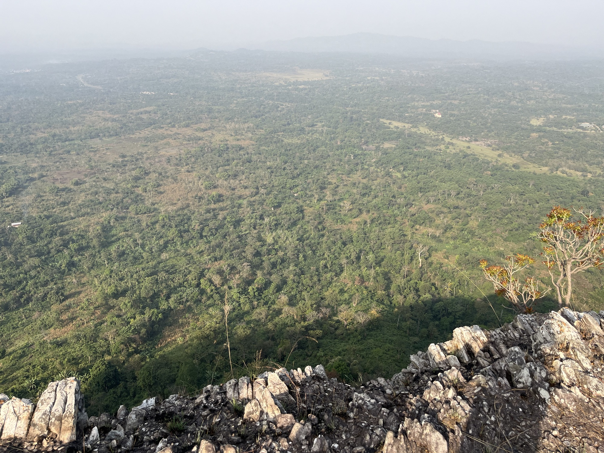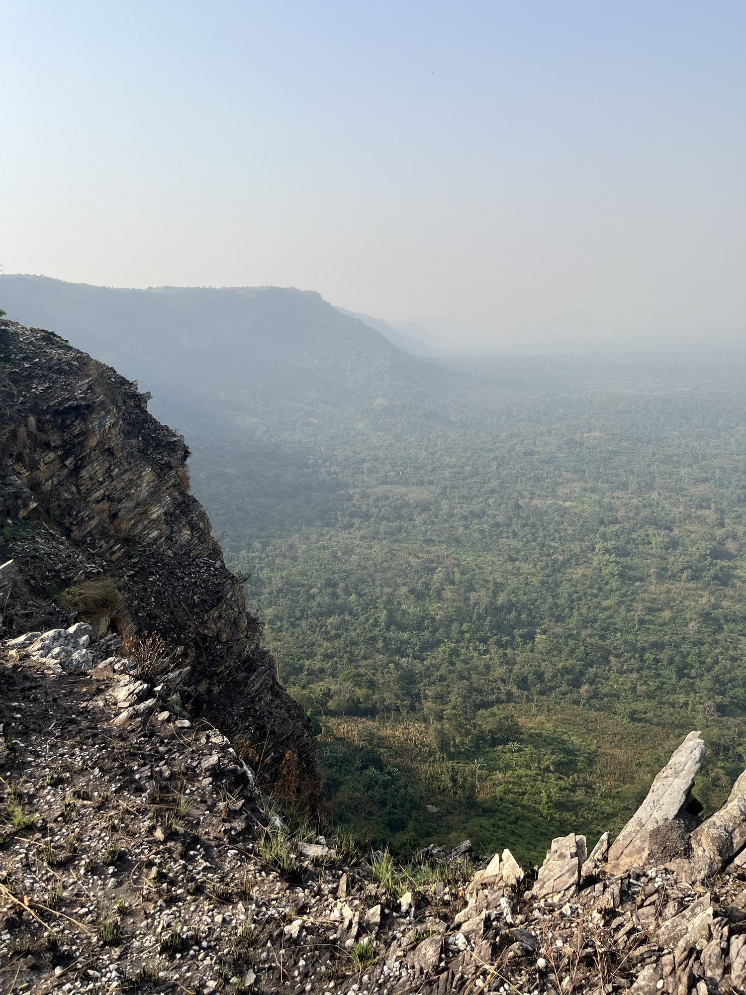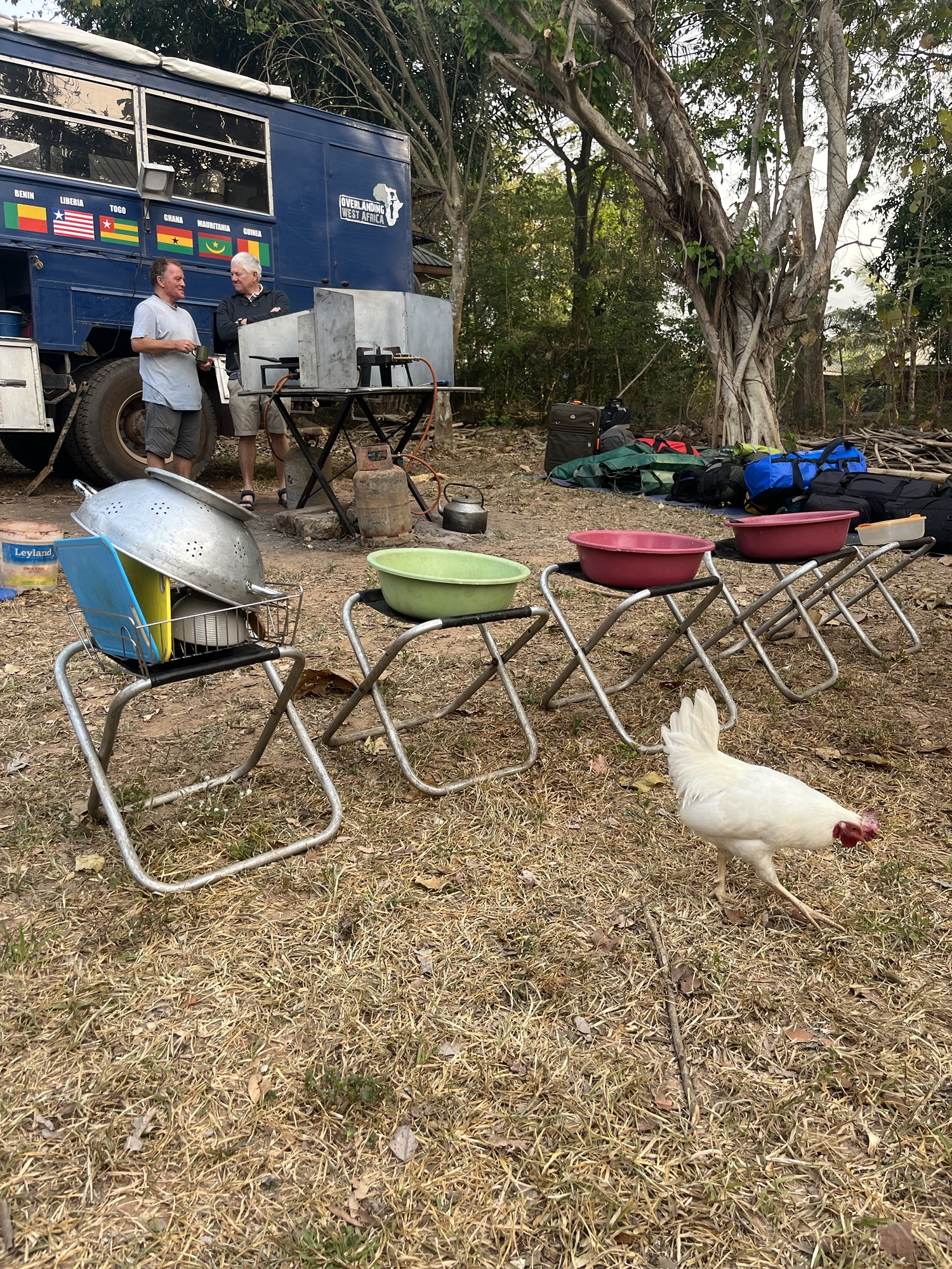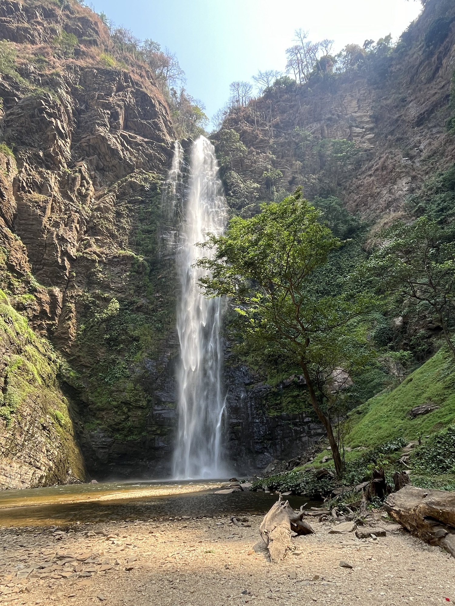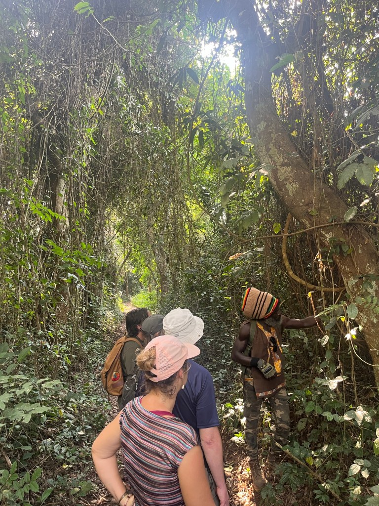 We arrived at our final stop in Ghana, next to Wli Falls, after stopping in to see some protected and sacred monkeys that despite a good historical story, the cost of getting to feed them a banana probably wasn’t worth the experience. Unfortunately, it felt like another example of holding on to the smallest piece of nature possible so that it can be monetised through tourism while everything else burns. In this region, that statement can be taken literally for we watched the surrounding mountainside light up with fire while enjoying a cold beer over dinner at camp. Wli Falls finally offered up the chance to go for a proper hike and we took it with gusto. Heading down to the park entrance at 7am, we collected our guide, and began a gradual climb from a hot 250 metres up to a loftier 700 metres. As we climbed up out of the trees and into the rocky outcrops that had been ablaze only the night before, we were greeted with incredible views of Ghana behind us, and Togo in front of us down in the valleys and beyond the mountain range that splits the two countries. As we levelled out, the path took us further along the mountain ridge until we caught sight of the highest waterfall in West Africa which could be anywhere between 80 and 480 metres high. Data is hard to come by and my ability to judge heights is even worse. However, the waterfall is technically two waterfalls with the first ending with a plunge pool before flowing along a tiny stretch of river and continuing down a second fall. I would argue that each fall is 80-100 metres high. Whatever their height they were wonderful to hike to, the challenging terrain made all the easier with the airconditioned forest created by the spray. After hiking down to the foot of the first waterfall, we retraced our steps back uphill before descending to the very bottom and getting the opportunity to swim. Here, the cliffs were black with large bats clinging to the rock in the shade of the midday sun. Back at camp in time for lunch we had knocked out 12 kilometres over six hours, fully satisfied to have properly got out into the stunning country that has been passing us by daily.