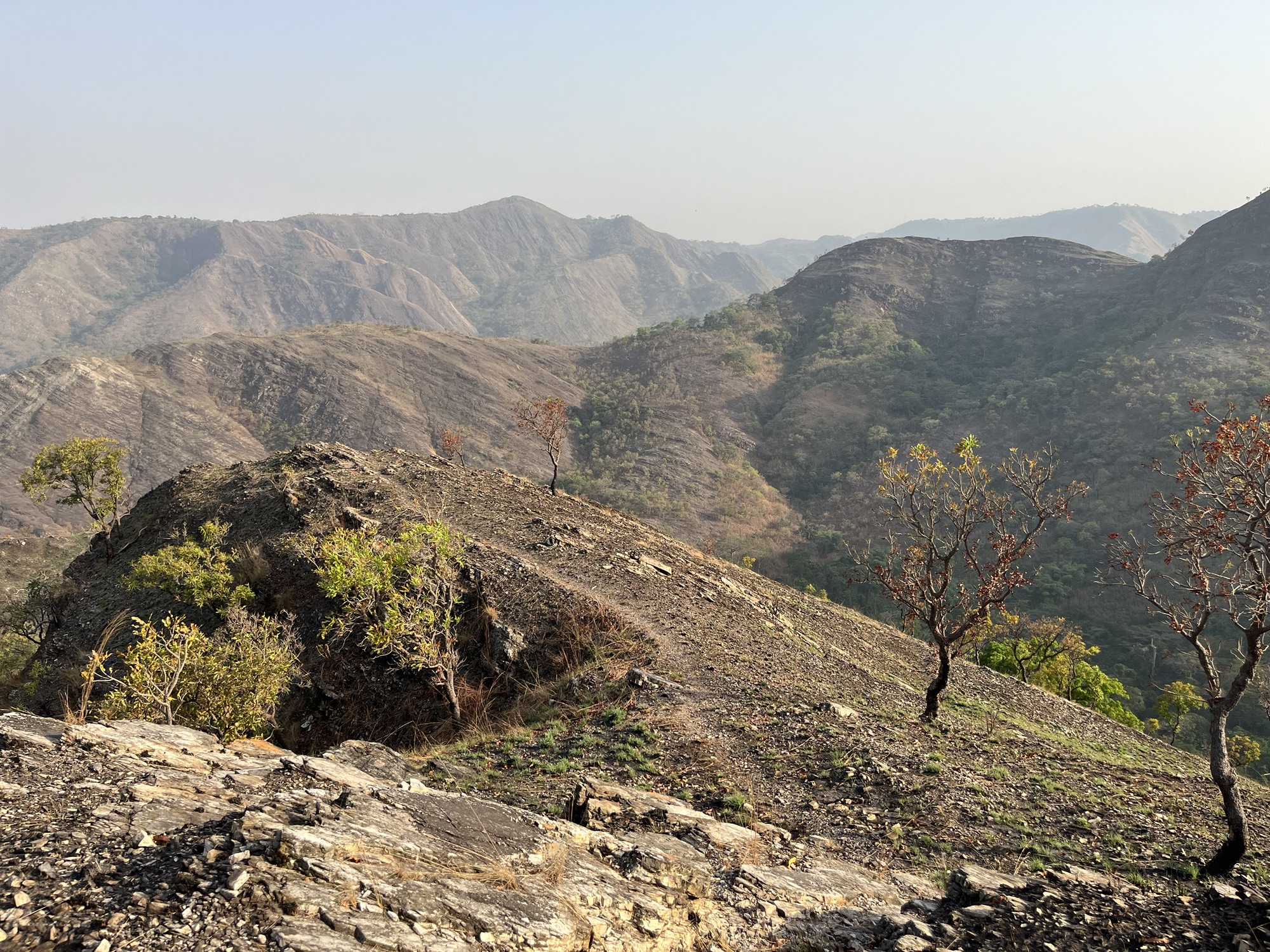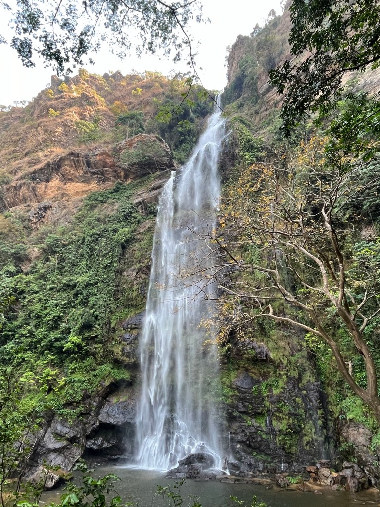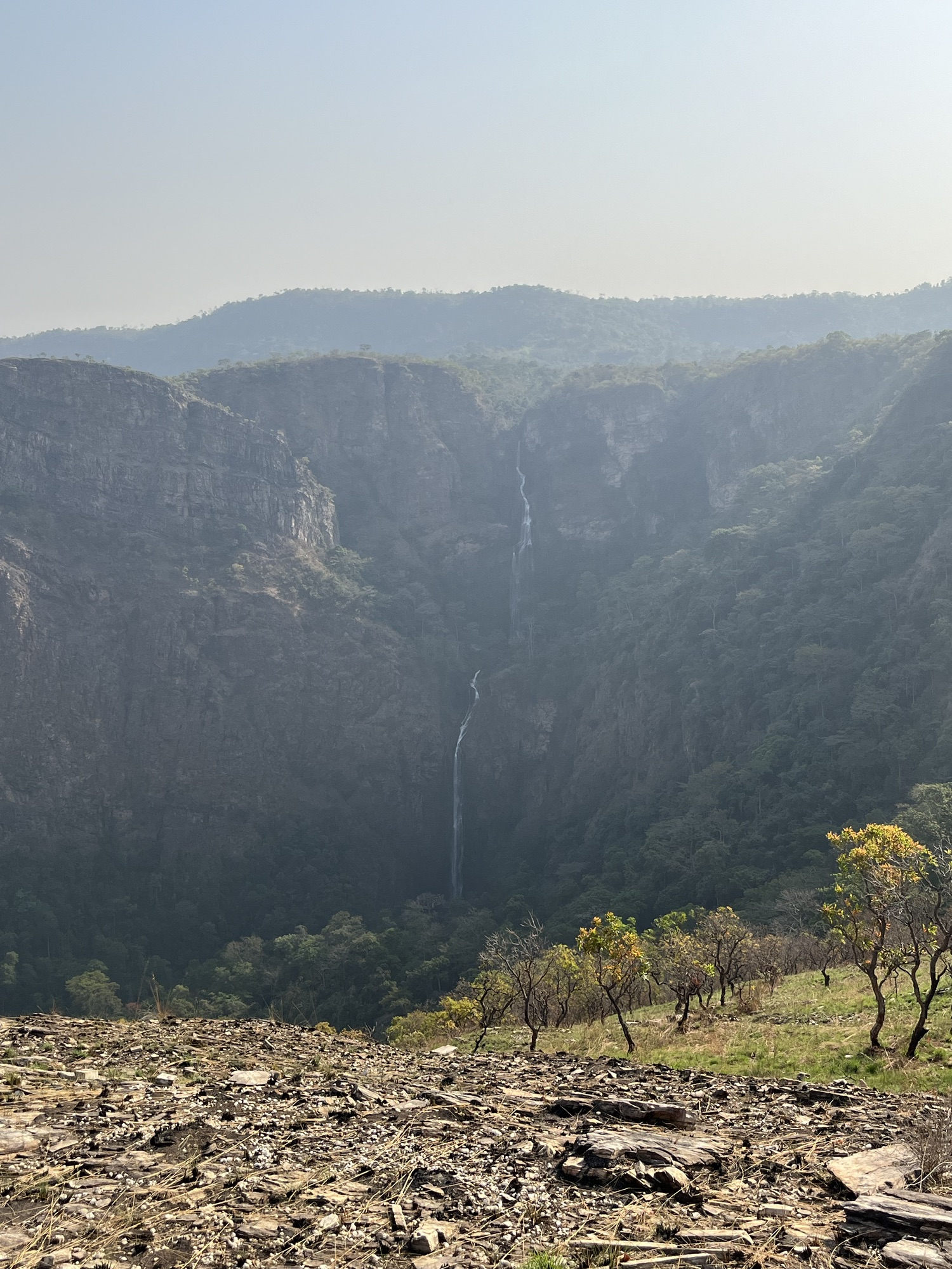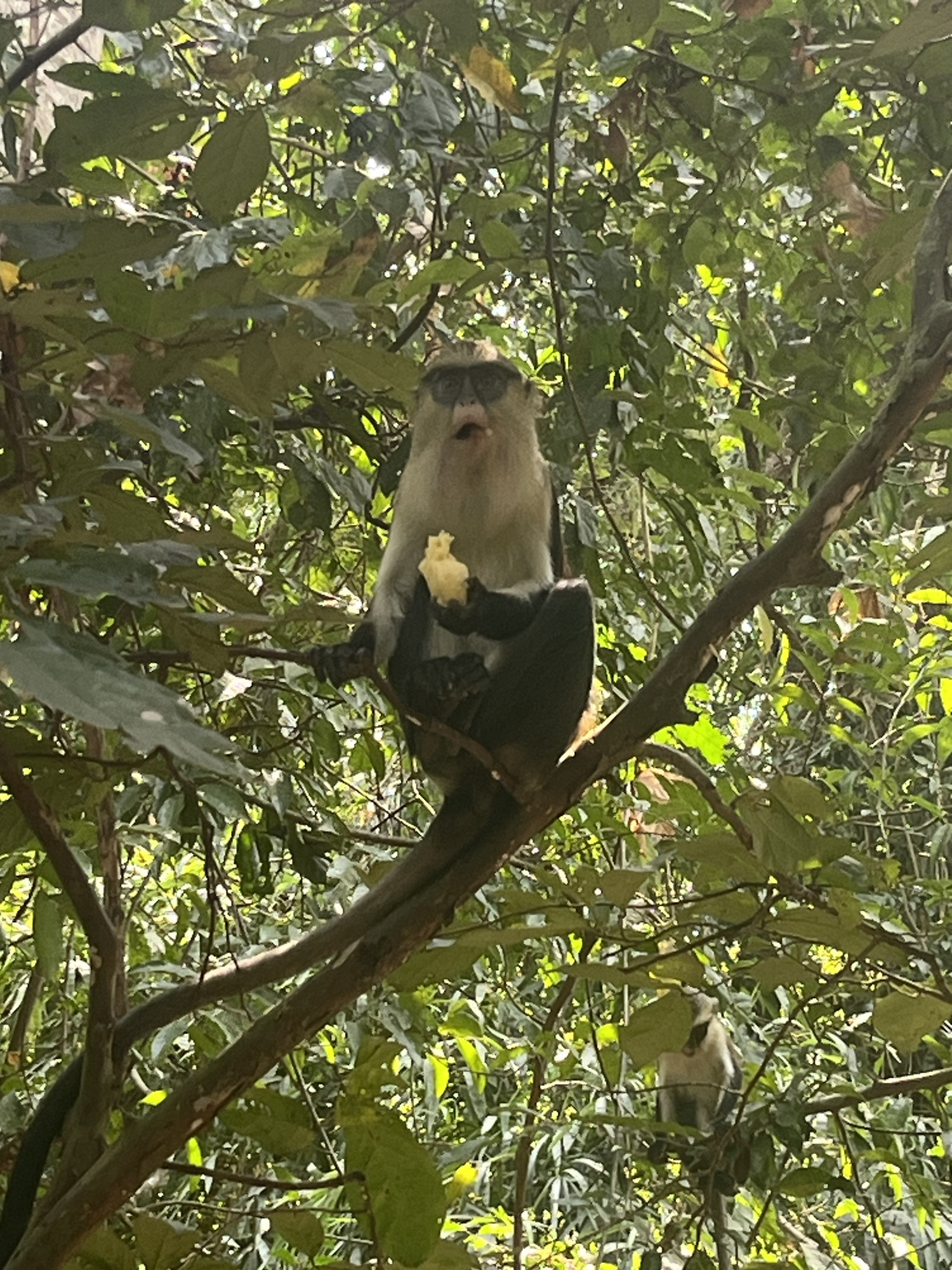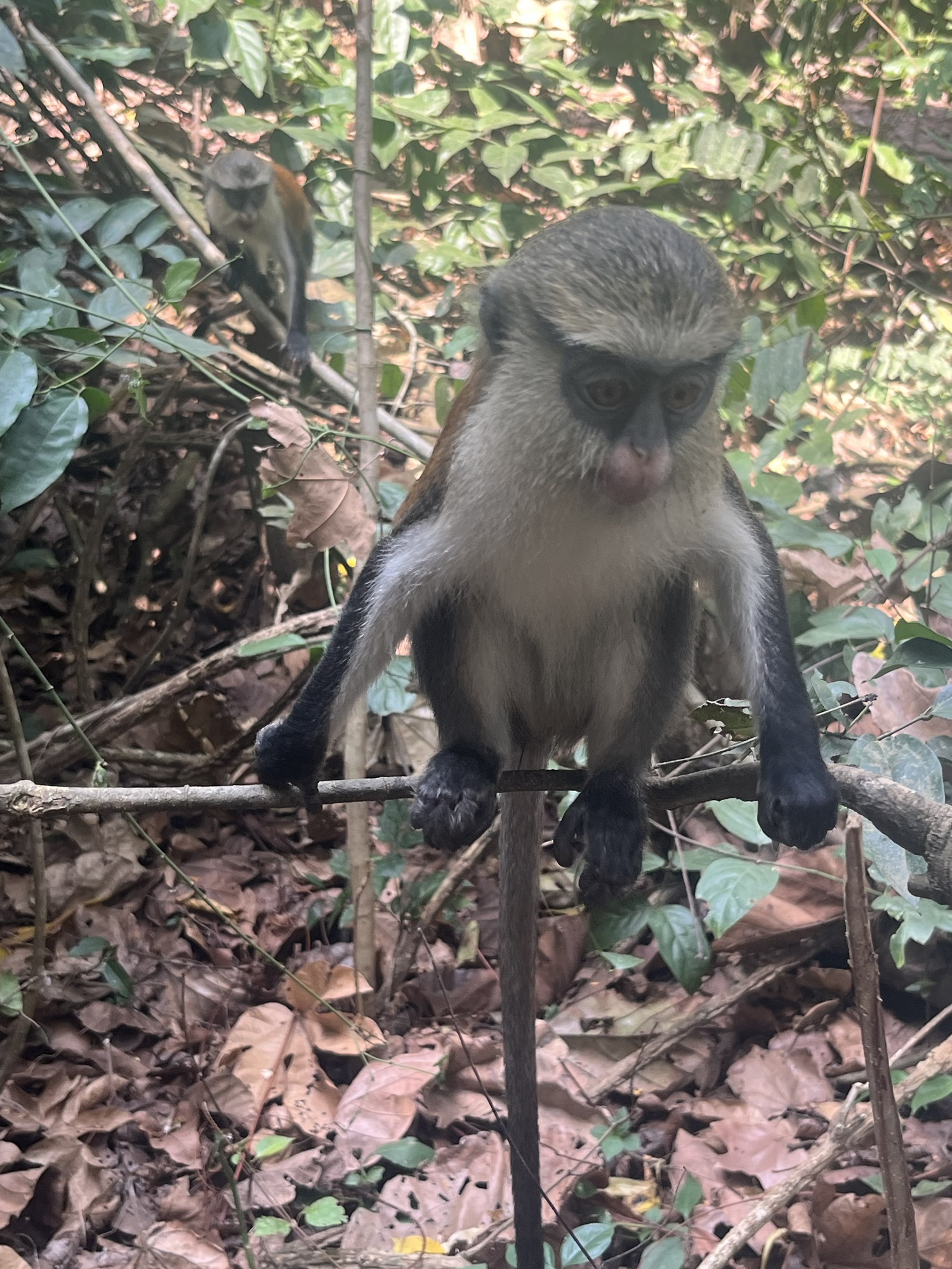 We arrived at our final stop in Ghana, next to Wli Falls, after stopping in to see some protected and sacred monkeys that despite a good historical story, the cost of getting to feed them a banana probably wasn’t worth the experience. Unfortunately, it felt like another example of holding on to the smallest piece of nature possible so that it can be monetised through tourism while everything else burns. In this region, that statement can be taken literally for we watched the surrounding mountainside light up with fire while enjoying a cold beer over dinner at camp. Wli Falls finally offered up the chance to go for a proper hike and we took it with gusto. Heading down to the park entrance at 7am, we collected our guide, and began a gradual climb from a hot 250 metres up to a loftier 700 metres. As we climbed up out of the trees and into the rocky outcrops that had been ablaze only the night before, we were greeted with incredible views of Ghana behind us, and Togo in front of us down in the valleys and beyond the mountain range that splits the two countries. As we levelled out, the path took us further along the mountain ridge until we caught sight of the highest waterfall in West Africa which could be anywhere between 80 and 480 metres high. Data is hard to come by and my ability to judge heights is even worse. However, the waterfall is technically two waterfalls with the first ending with a plunge pool before flowing along a tiny stretch of river and continuing down a second fall. I would argue that each fall is 80-100 metres high. Whatever their height they were wonderful to hike to, the challenging terrain made all the easier with the airconditioned forest created by the spray. After hiking down to the foot of the first waterfall, we retraced our steps back uphill before descending to the very bottom and getting the opportunity to swim. Here, the cliffs were black with large bats clinging to the rock in the shade of the midday sun. Back at camp in time for lunch we had knocked out 12 kilometres over six hours, fully satisfied to have properly got out into the stunning country that has been passing us by daily.