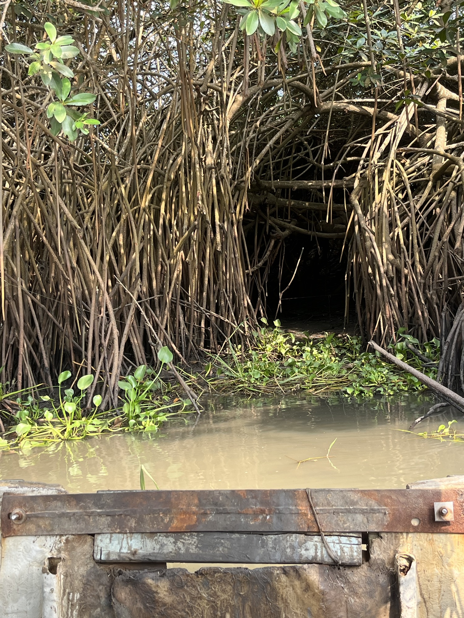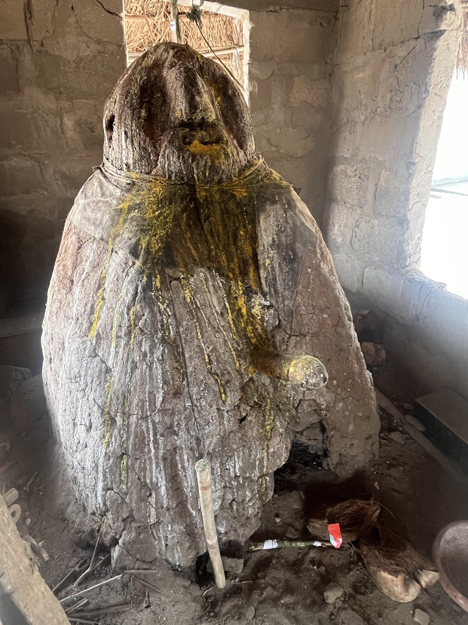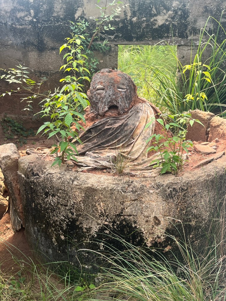 With the morning mist gone, we headed off to a small village on the mouth of the Mono River, once a source and holding place for slaves before their transportation. Now, there is a small turtle rehabilitation centre. Apparently, these are compulsory at any spot on a beach where tourists may appear. Don’t get me wrong, I love turtles but, we probably need to be doing far more than what is barely anything greater than a petting zoo. So I gave it a miss. Don’t worry, they still got paid. We waded through a muddy riverbank and jumped on a wooden boat that I think even it was surprised to be still floating. As ever, there was no option of a lifejacket. Have you ever noticed that on really good boats lifejackets are always available, but never on the boats constantly on the verge of sinking? I mean, even planes have lifejackets should you be lucky enough to fall out of the sky. It’s just a curious observation regarding the colossal void between societies. Despite the lack of lifejackets and, a sinking boat, it didn’t matter too much because thankfully the locals had shot all the hippos that used to live in the river after one fisherman was killed when getting in the way of Africa’s biggest non-infectious disease killer. But don’t worry, tourists can visit the turtle sanctuary. The boat took us to the edge of a mangrove forest and an entrance that looked like something straight from Harry Potter’s Forbidden Forest (sound’s more evocative than intended). This was where locals would go off hunting for freshwater crabs and other goodies that lurk among the mangrove trees. It won’t surprise you to hear that if you look on Google Maps there is actually very little mangrove remaining. Strange, considering their ability to provide food, suck up a heinous amount of carbon, and protect coastal villages from flooding. My guess is that the Voodoo shrines dotted all over the village we paid a visit to provide all the protection and nourishment required by the local populace. It was a strange village, a mix of old colonial buildings falling into disrepair, traditional village housing, and shrines of many – despite what I said earlier – terrifying things. Things is the only noun I can think of. The most popular ‘thing’ looked a lot like a mouldy Humtpy Dumty. One appeared to be melting into the ground, while another was sporting an erect penis of such epic proportion it would make the Pope look twice.