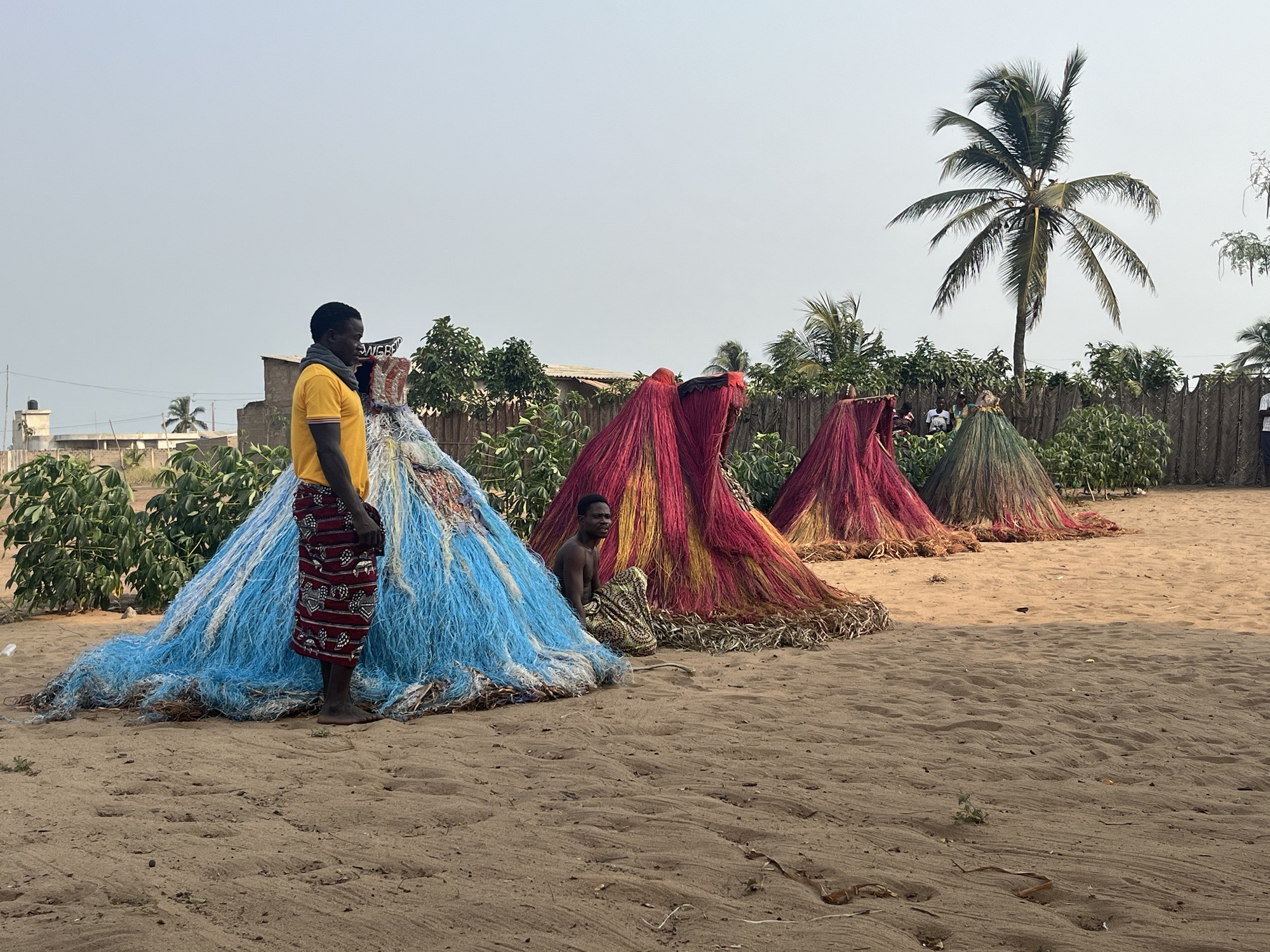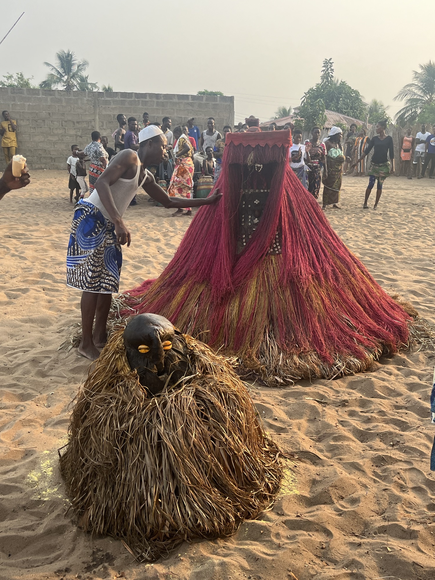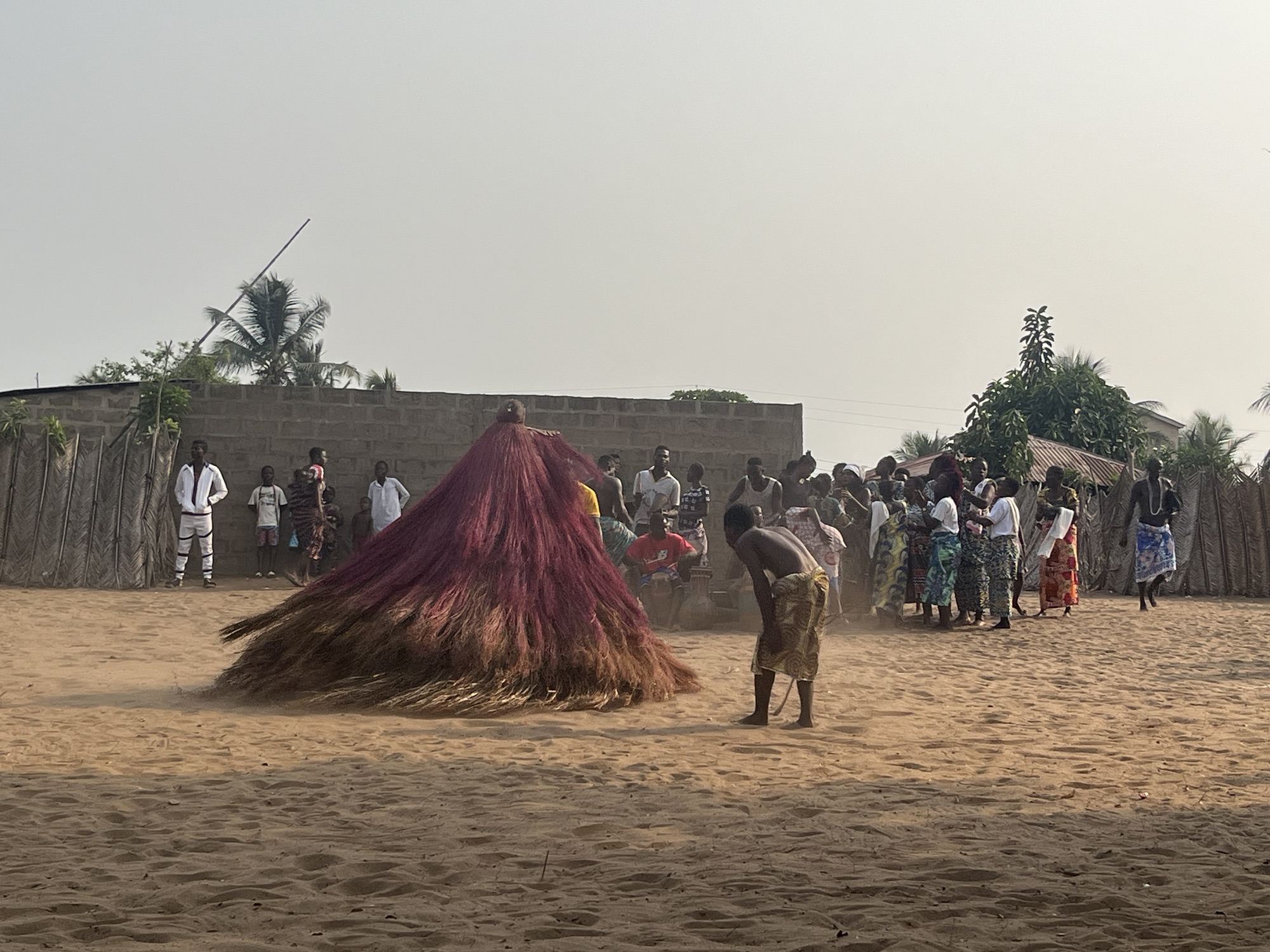 I started with Voodoo, leaving at 3.30am we headed down the road to a local village where we would see a Voodoo ceremony performed for us. Down as a trip highlight, even I was interested to see this play out, and being a religious ceremony, I felt safe from the possibility of being made to dance. We arrived at the village at 4pm and were ushered through the sandy streets to an open area with benches at one end. A couple of drummers were already playing as we found ourselves sat adjacent to a shrine with Humpty Dumpty puffing on a lit cigarette. Before anything had really began there was an eery atmosphere produced no doubt by anticipation, but also the shade cast by a large tree, the glowing sky caused by a setting sun, and the usual change in pastel colours that accompany such times of day. A Dalek then appeared. A cone shaped, tassely, colourful, man-height, sorry, person-height, Dalek with a cap. It was undoubtedly a spirit despite the fact it walked like a person. But then our guide wasn’t too good at filling us in with the plot and its characters. The cone-shaped spirit dawdled awkwardly to the smoking Humpty Dumpty and a shot of clear liquid was offered up by one of the spirit’s human escorts. As with all these events, the spirits are accompanied by a support crew of mortals that ensure the spirit’s mystery is maintained for the audience. This process was repeated another three times until a line of four spirits presented themselves on the sandy dance floor/stage. Every now and then they would wobble hilariously as though they had just been tasered. Then began something. I don’t know how to describe it. The spirits began to run around, pirouetting at an impressive rate that caused the tassels to take off, and no doubt the man inside, sorry, the spirit to feel increasingly sick. By now the drummers were in full swing, a crowd of women had joined in with singing, chanting, and dancing, and the remainder of the village was crowded around the perimeter of the performance. Sporadically, a spirit would spin towards the crowd causing them to disperse in every direction, children running in simultaneous joy and concern. Several times the spirts deposited live crabs as they span that caused a rush of villagers to collect as many crabs as possible, I assume a gift for the cooking pot. After 90 minutes, one of the spirits stopped in the middle of the stage, wobbled for a while, got covered in flakes of corn, and was lifted up by its support crew, tipped over, and showed to the watching crowd to prove there was no mortal inside. The spirit had, however, given birth to another Humpty Dumpty in scenes not to dissimilar to that in Benjamin Button, a wrinkled, aged, blob of something with only a face and no extremities. We were invited up for a closer look. Benjamin wobbled just enough to suggest he was animate, I suppose possessed, but I still have no idea what any of it meant. Soon enough a parental spirit returned, was placed over Benjamin, some faffing took place, and the spirit twirled away. The inevitable then happened. Two women danced over and grabbed me and our truck driver Rosana, pulling us up to dance, there was no escape, I turned red, resisted the tempting hands of death, and inelegantly danced my way through as the rest of the group looked on in pure delight. The ceremony had lasted two and a half hours, the drummers hadn’t stopped for the entire duration. I was done, ready for my dinner and some red wine. Reminiscent of the golden days, wine led to a bottle of rum, which led to a swimming pool. I woke the following morning, cloaked in spiritual mist, with sore back, rash still on leg, and the addition of a sore head. It would seem I am yet to harness any control over either Voodoo or rum.