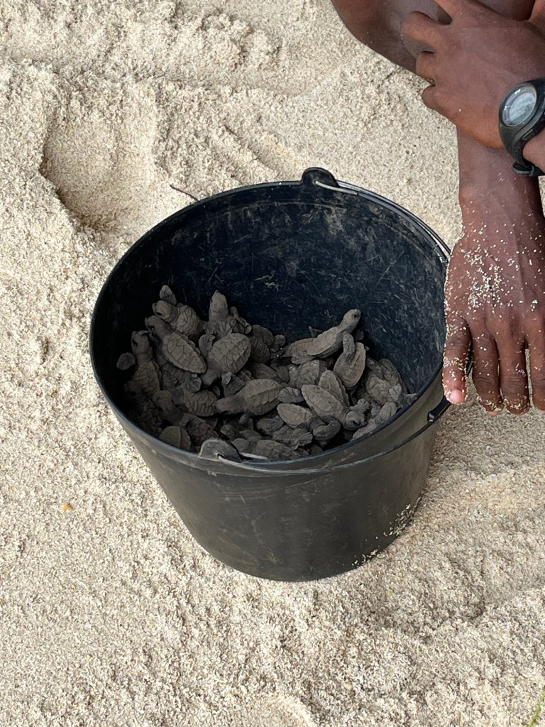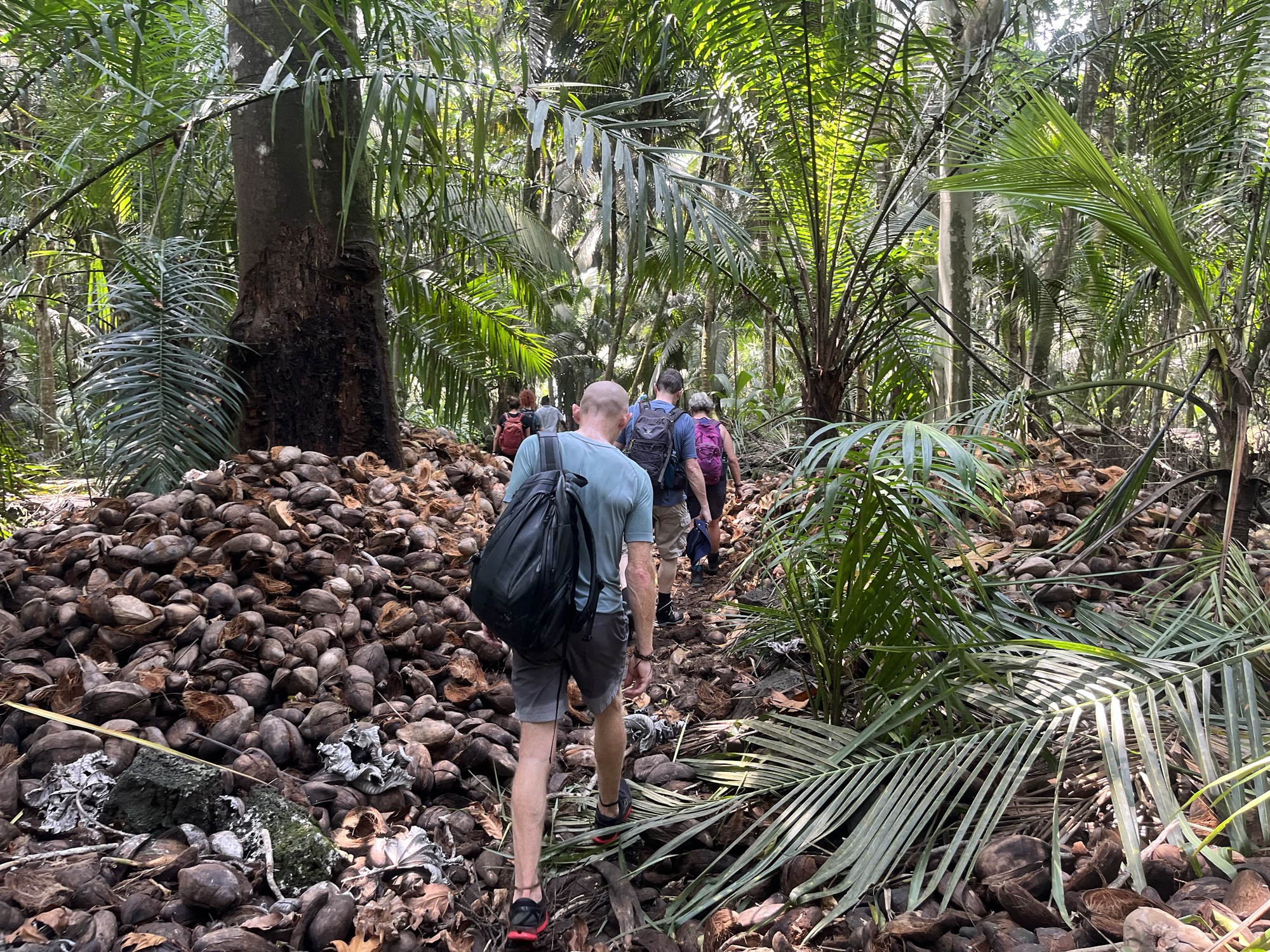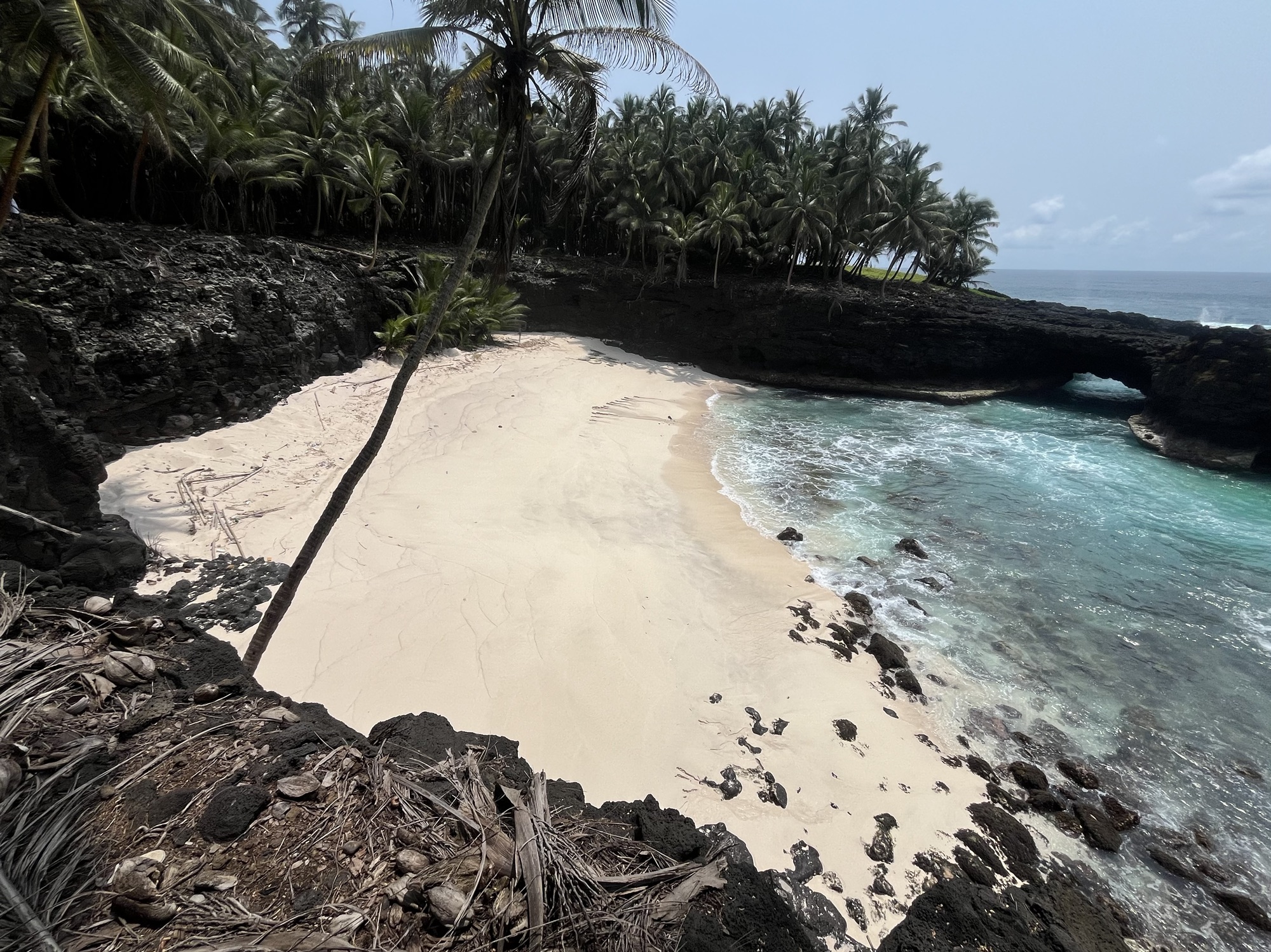 I woke the next day feeling much more human and stopped daydreaming about adult nappies. Just across the water from our ecolodge was a little island that we headed out to and spent a good morning hiking and sweating. The island is inhabited with around 200 people who make a meagre living from the coconut palm plantations. The island, barely the size of two average farms in the UK is the perfect example of why I believe nature is screwed. There is no need for a permanent settlement. It’s a five-minute boat ride to the main island which is exactly the same. Surely the turtle NGO lady and her crew should be on the little island and free of human settlement other than day visitors? But then of course the NGO would want visitors to pay to stay the night so they could see the turtles arriving which then means a permeant settlement. Still, as a simple tourist, it was a beautiful place to visit. We scrambled up a hill to a monument that marked the equator and offered some splendid views. From here we found ourselves immersed in palm trees, walking over years of discarded coconut husks until we popped out at yet another spectacular beach. This repeated itself all morning, from one unbelievable beach to the next. We finally stopped at one beach for lunch where we also happened upon something of a rarity in these parts, tourists. We had spotted one or two on the trail, but they had been rare until now. Even so, there weren’t so many as to be a concern and our group took the opportunity to jump in the crystal-clear waters to cool off before yet another filling lunch. This time I didn’t hold back on the beers. I was feeling better, and besides, I had learnt a vital lesson. Drinking coke and bottled water cost exactly the same as beer. It appeared to be a wonderfully simplistic national pricing system as it varied little wherever we went and so economically it now made sense to drink beer whenever there was the opportunity. Cold beer really does feel like it staves off dehydration in such tropical environments. I love water, I drink it by the gallon anywhere in the world, but in an environment demanding you drink 50 litres daily, beer offers a refreshing change that breaks up the day quite nicely. In this moment my first bottle had barely touched my lips when a man with a bucket appeared. He had come to release some baby turtles for us as we had failed to see any the night before. It was all very sinister, and I suspect very much off-the-record, in that they had been illegally caught on the island for just this financial opportunity, a hunch of mine backed up by the fact that we could hold the babies and it was the middle of the day contrary to every other release I’ve seen. Being responsible tourists, we put all that to one side and enjoyed the moment as many super strong baby turtles and one or two weak or outright lazy ones headed to their inevitable death in the Atlantic. Feeling slightly dirty, I returned to my now less chilled beer.