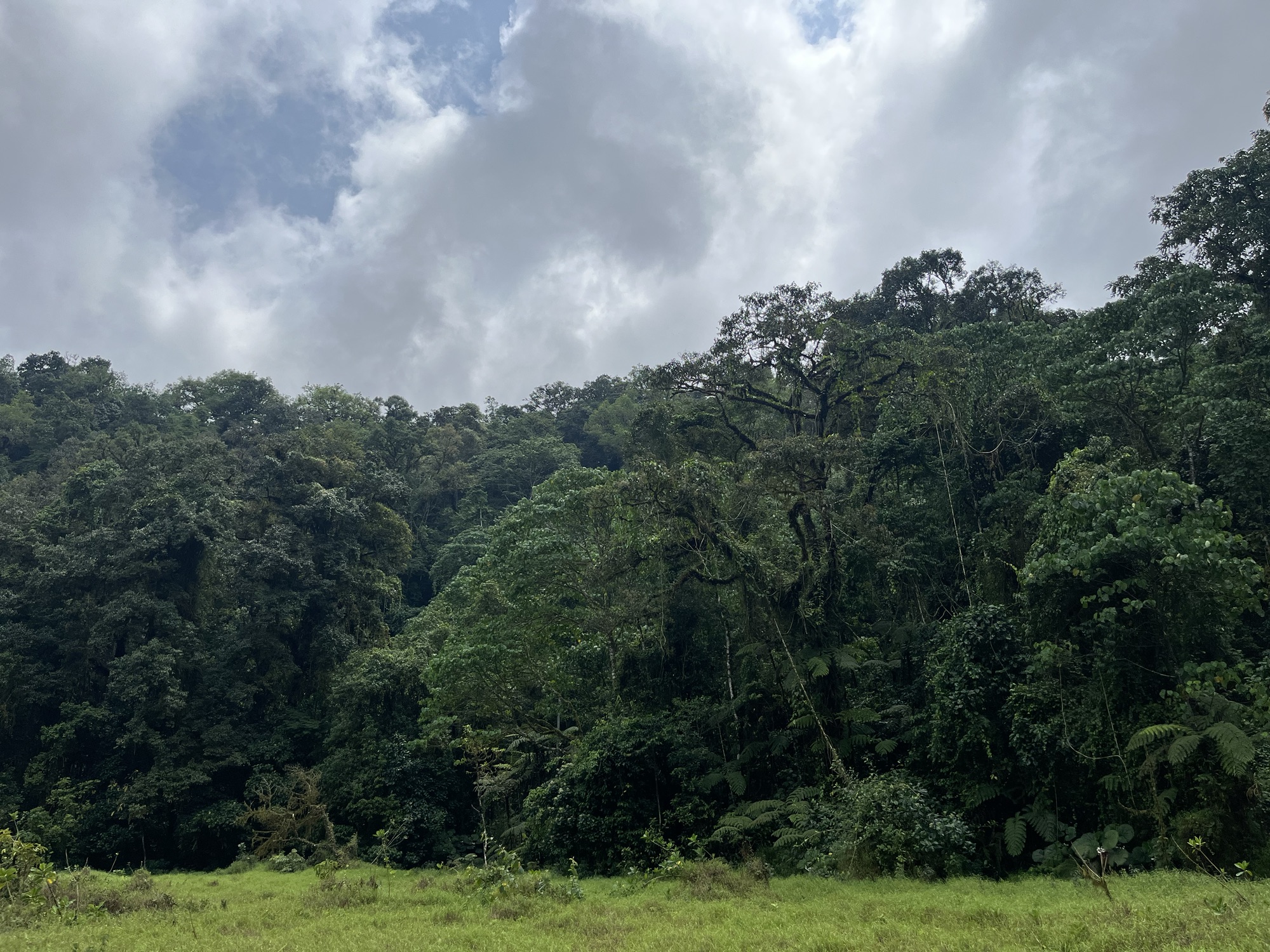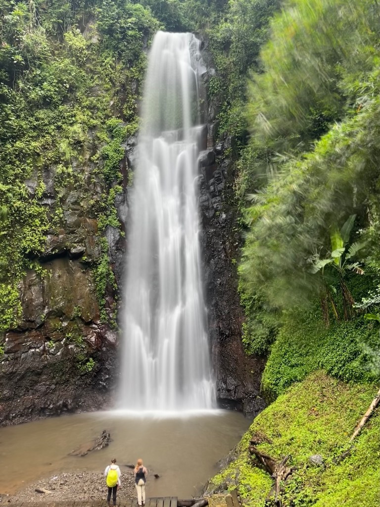 The next morning, I emerged from my lodge to be greeted by a vista of misty hills stretching out to the horizon. The excitement of getting out for a hike was slightly subdued by the talk of gigantic menacing spiders that had visited people’s rooms during the night. Vicious rumours had already circulated the night before leading me to seriously contemplate putting up my tent in the room to provide a bubble of safety. I thought this a slight over-reaction and instead went to bed terrified, but not enough to not fall asleep within seconds. Well rested, I was able to love every second of our nine-kilometre hike in Obo National Park. A hike that was advertised as relatively easy yet turned out to involve a fair bit of up and down on trails full of roots, rocks, and leaves. The route took us up the side of an old volcano where we continued along the ridge of the crater. However, it was hard to grasp any concept of our surroundings aside from a steep drop either side of the track due to being fully immersed in tropical forest and, as we gained altitude, plenty of soggy cloud. After a scramble downhill it was all change again as we popped out from the trees and stumbled onto a lake. A lake that looked more like a Swiss meadow, like a frozen lake, but instead covered with a thick layer of grass and vegetation instead of ice. It was a new sensation for me, walking over a field of grass that moved like a bouncy castle. Sipson grabbed a five-metre pole and stuck it through a hole in the turf to reveal the horrifying depth of the water below our feet. Unnerved, I returned to solid ground, we walked some more and pulled up by a lovely little stream for a fantastic packed lunch. It appeared our luck with the weather had come to an end with rain heavy enough to put on a raincoat and the bag cover, but of course, as soon as we were prepared for torrential rain, the sun came back out. After the hike, we could have walked down to the waterfall we missed the day before, but most of the group had had enough for one day and so we drove down. The highlight was being taught how to use a camera setting on my phone that gave a refreshing new lease of life to waterfall visits.