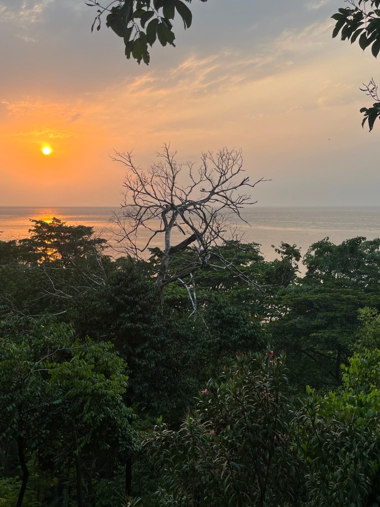 I would have been sad to leave Principe, but we still had two full days back on Sao Tome to enjoy. Landing back around 10.30am, we were collected and ferried to the north of the island. Despite a flight time of less than 30 minutes, the weather was notably different, that is, scorching hot. There was also a significant change in the vegetation, even relative to the rest of the tropical lushness we had seen earlier on Sao Tome. Now we had entered a region that was drier, more savannah-like with tall dry grass, baobab trees, and dusty tracks. The sky was bright blue overhead. If there had been any doubts whether this was an African country or not, they were soon banished. We made a short visit to an ex-colonial cocoa plantation, apparently once ‘the grandest’ on the island, but now a decaying corpse. This was followed up with a much-needed dip in the sea before another four-course set lunch menu at a beautiful remote restaurant overlooking the savannah, and with the sea glistening in the background. A post lunch dip in the sea at a lovely but surprisingly busy little cove was tarnished by me standing on a sea urchin that loaded the sole of my feet with little spines that would remain imbedded for weeks. It didn’t matter, because after saying that the islands were poor at providing sunsets, we found ourselves driving along a stunning coastal road as the sun began to go through the motions preparing for something spectacular. During that time, we arrived at our final ecolodge in a spontaneous deluge of rain that had brewed from apparently nothing. I discovered my luxurious lodge overlooking the sea, sat atop a hillside blanketed in green tropical goodness, dropped my gear, and fell into the lounger to absorb all the goodness before me. Right on cue, the sun broke through, igniting the grey clouds with a dazzling spectrum of orange, red and purple.